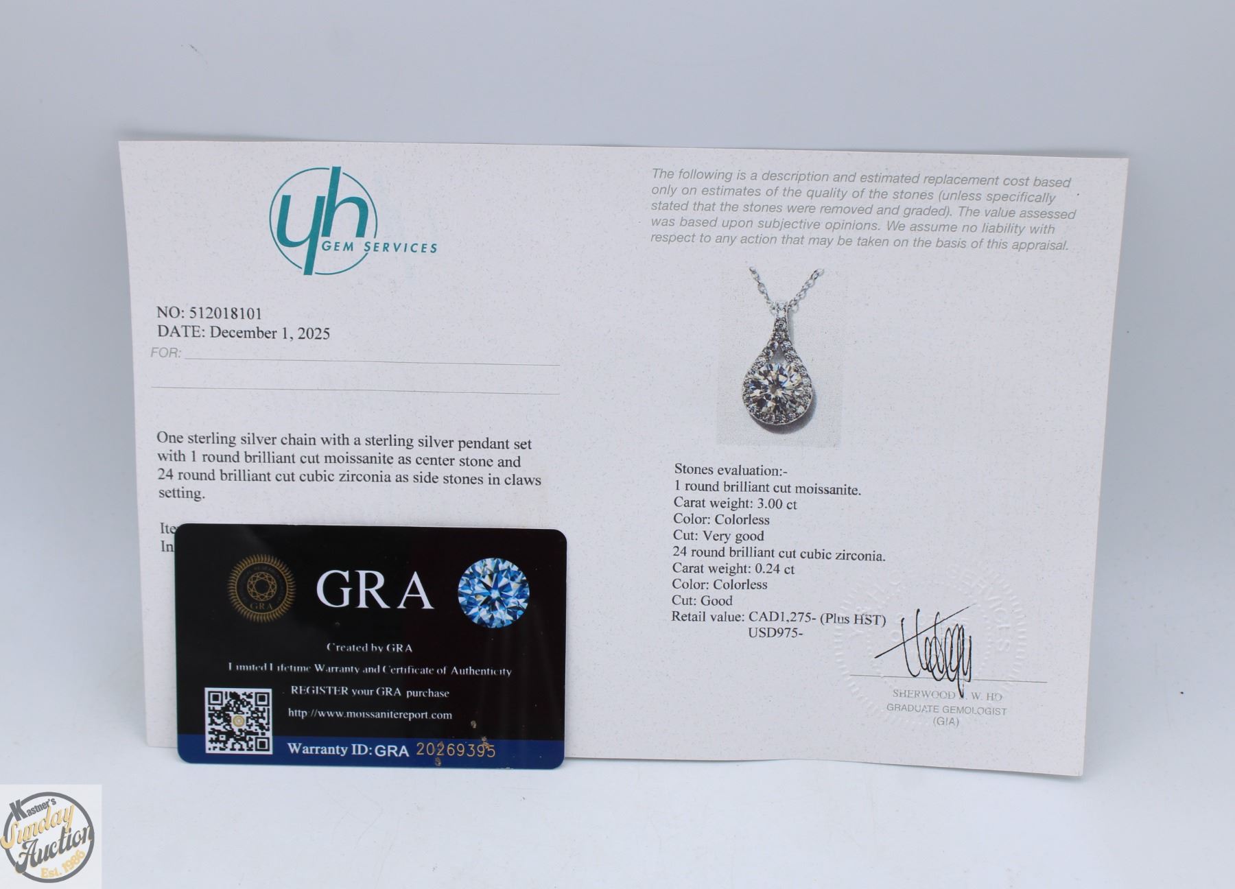 CUT MOISSANITE STONE VVS D COLOR WITH 24 ROUND BRILLIANT CUT CUBIC ZIRCONIA SET IN TEAR DROP HALO SET IN 925 SILVER PENDANT RETAIL VALUE $1,275.00 **ALL ITEMS MUST BE REMOVED BY 5PM SATURDAY, FEBRUARY 28TH 2026. ALL REMAINING ITEMS WILL BE SUBJECT TO A $6.00 PER DAY STORAGE CHARGE. ANY ITEMS REMAINING AFTER MONDAY, MARCH 16TH, 2026 WILL BE CONSIDERED FORFEITED. NO REFUNDS WILL BE ISSUED FOR FORFEITED ITEMS. TO SCHEDULE A PICK UP APPOINTMENT CLICK HERE