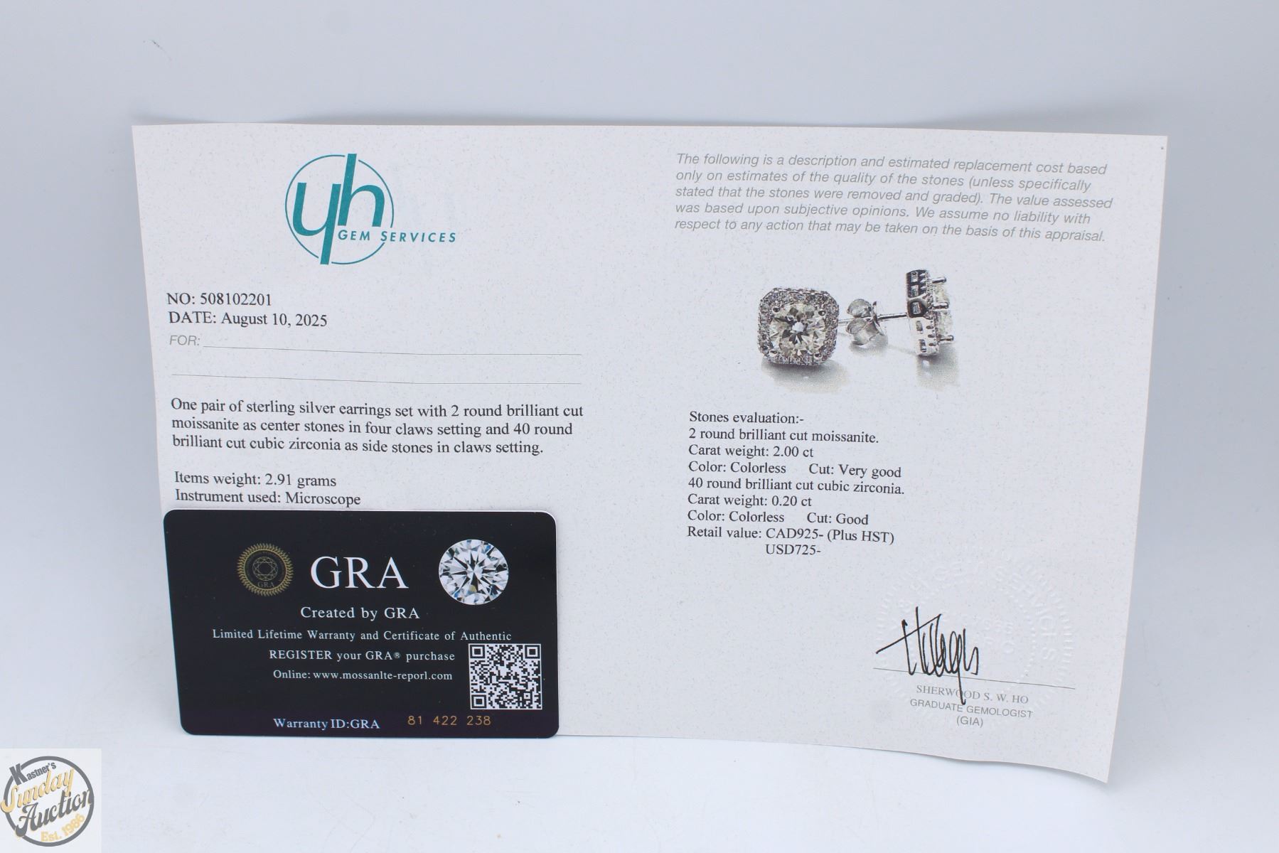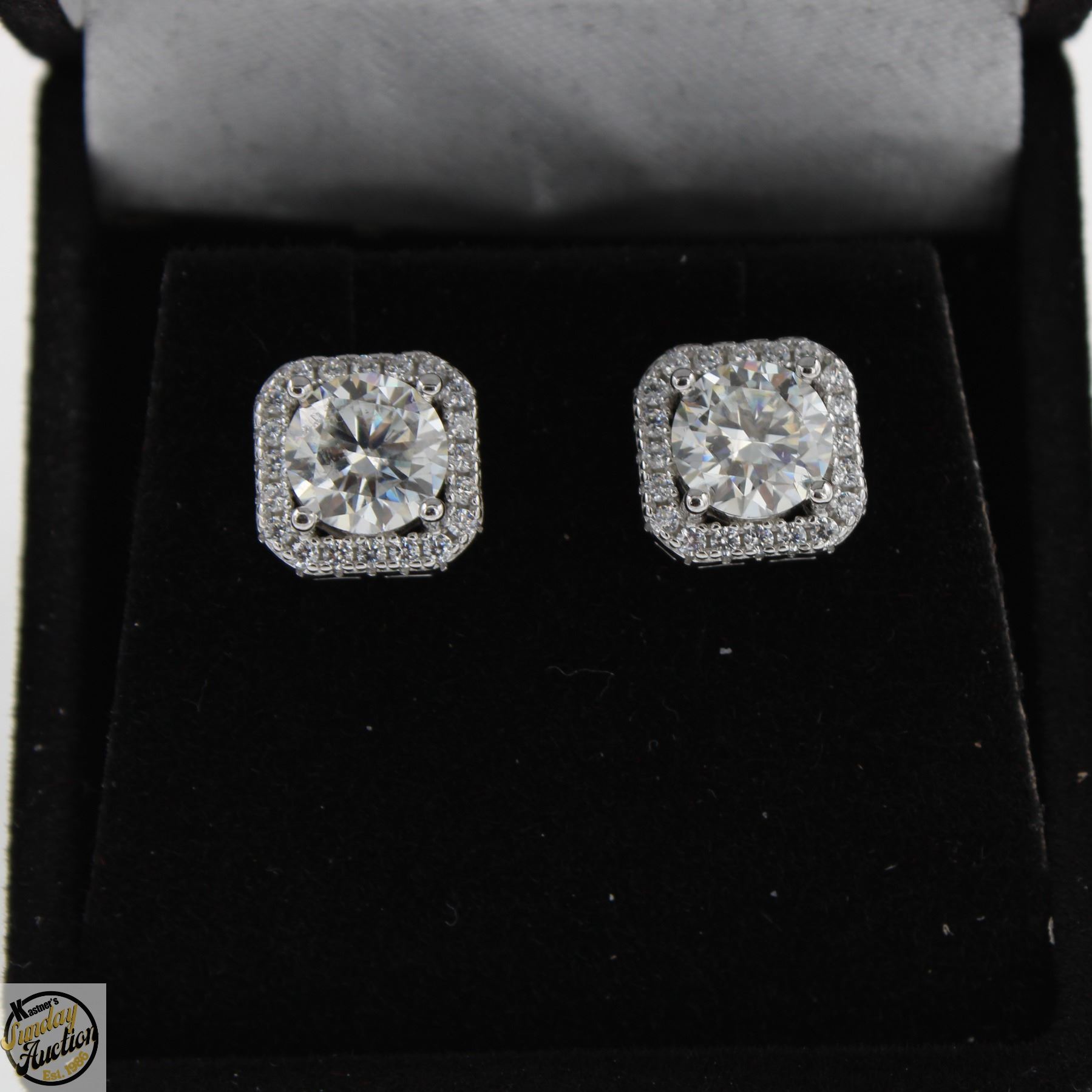 CUT MOISSANITE STONE VVS D COLOR WITH 40 ROUND BRILLIANT CUT CUBIC ZIRCONIA SET IN SQUARE HALO SET IN 925 SILVER EARRINGS RETAIL VALUE $925.00 **ALL ITEMS MUST BE REMOVED BY 5PM SATURDAY, FEBRUARY 21ST 2026. ALL REMAINING ITEMS WILL BE SUBJECT TO A $6.00 PER DAY STORAGE CHARGE. ANY ITEMS REMAINING AFTER MONDAY, MARCH 16TH 2026 WILL BE CONSIDERED FORFEITED. NO REFUNDS WILL BE ISSUED FOR FORFEITED ITEMS. TO SCHEDULE A PICK UP APPOINTMENT CLICK HERE