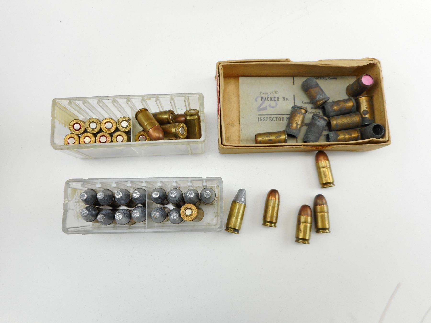 380 AUTO AMMO, .358 AMMO, 38 S&W BLANKS & BRASS IN VINTAGE DOMINION BOX , 20 RNDS 380 AUTO, 16 RNDS .358 AMMO, 3 BLANK 38 S & W, AND 7 BRASS IN VINTAGE DOMINION BOX