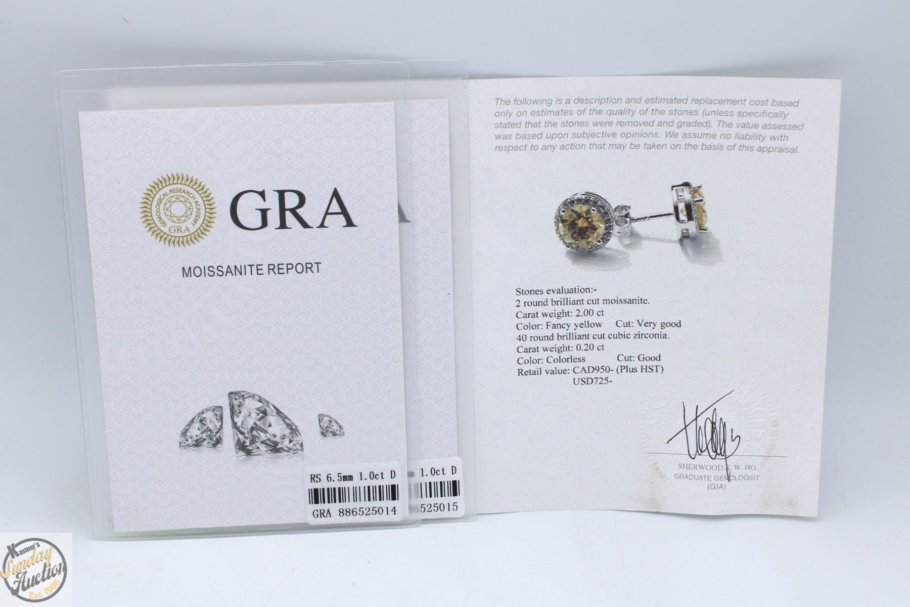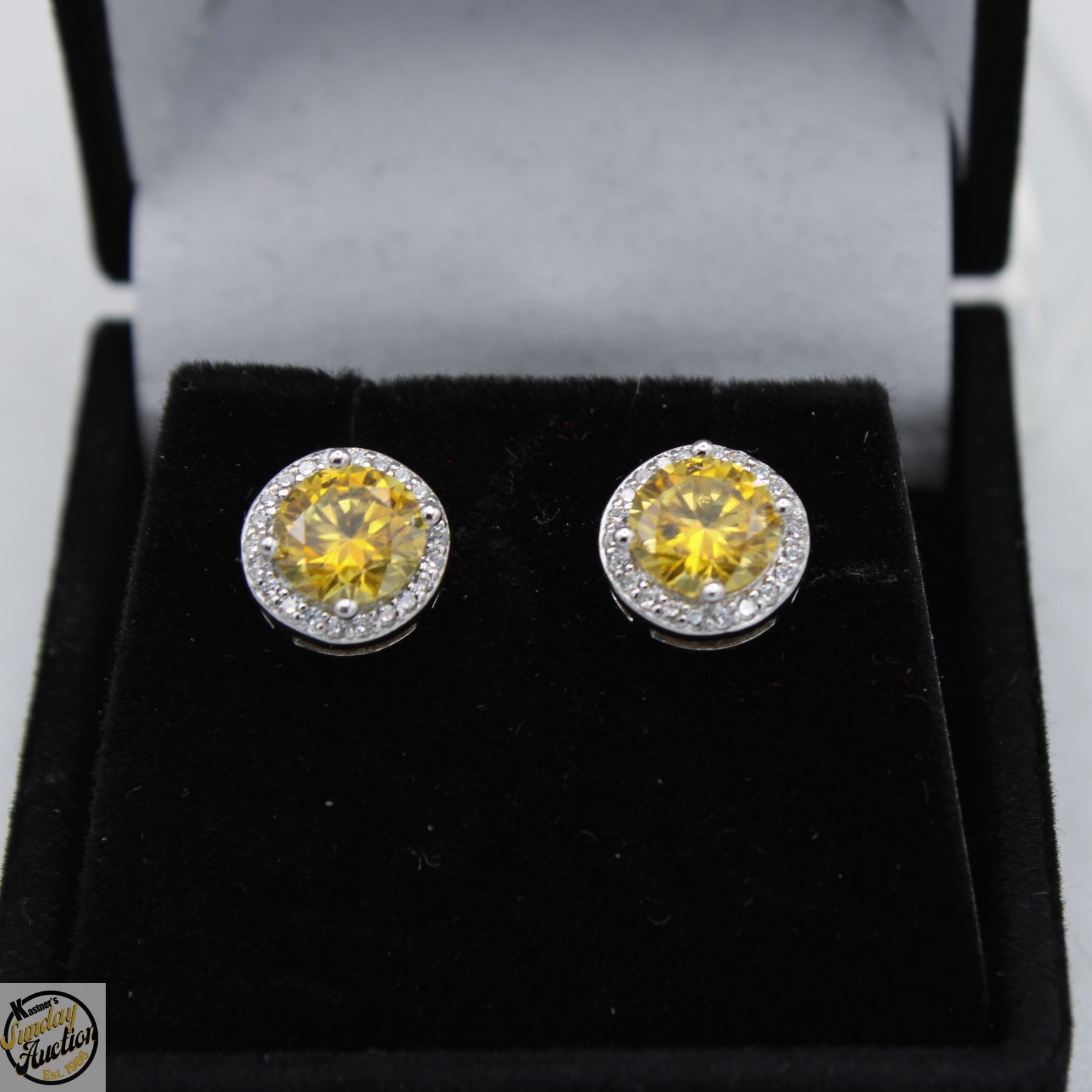 CUT MOISSANITE STONE VVS FANCY YELLOW COLOR WITH 40 ROUND BRILLIANT CUT CUBIC ZIRCONIA SET IN ROUND HALO SET IN 925 SILVER EARRINGS RETAIL VALUE $950.00 **ALL ITEMS MUST BE REMOVED BY 5PM SATURDAY, FEBRUARY 21ST 2026. ALL REMAINING ITEMS WILL BE SUBJECT TO A $6.00 PER DAY STORAGE CHARGE. ANY ITEMS REMAINING AFTER MONDAY, MARCH 16TH 2026 WILL BE CONSIDERED FORFEITED. NO REFUNDS WILL BE ISSUED FOR FORFEITED ITEMS. TO SCHEDULE A PICK UP APPOINTMENT CLICK HERE