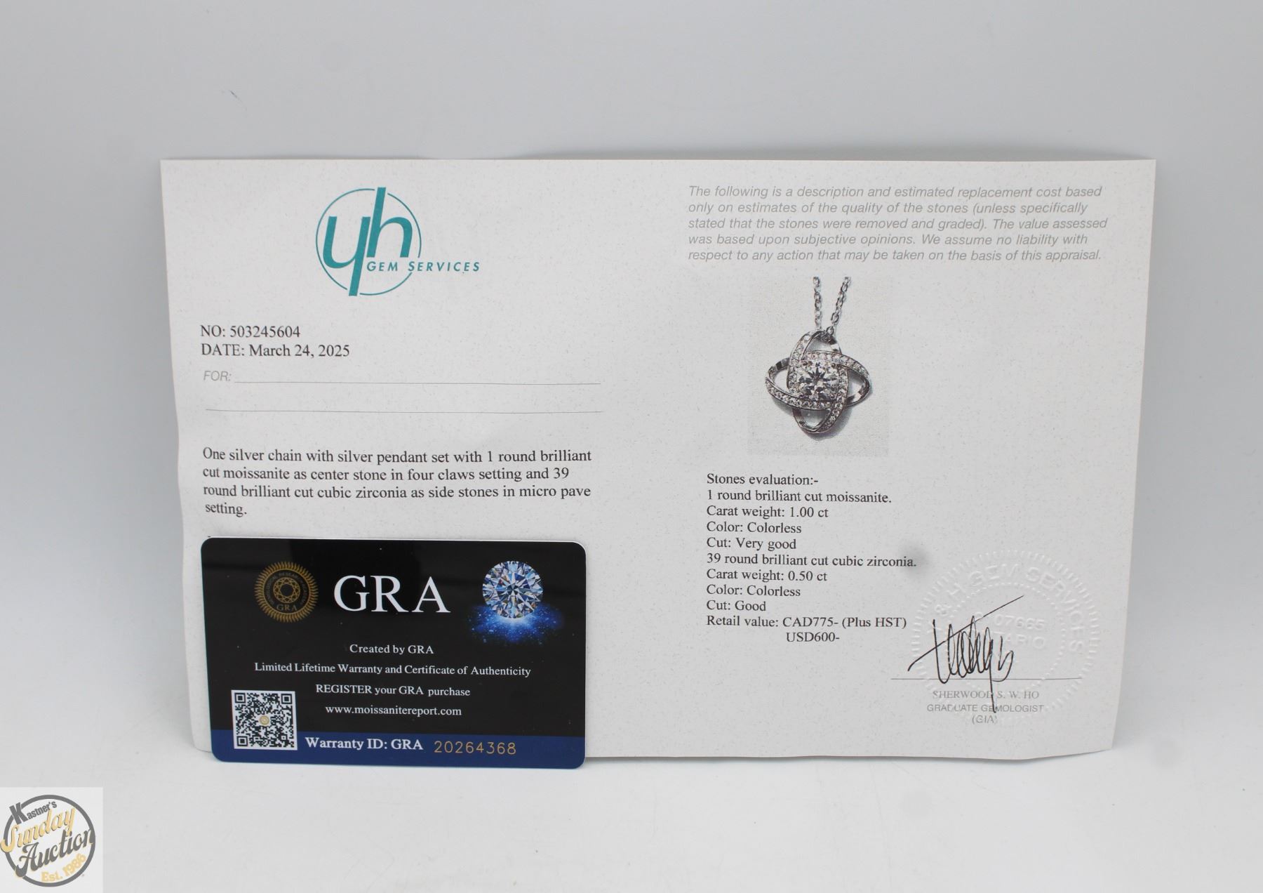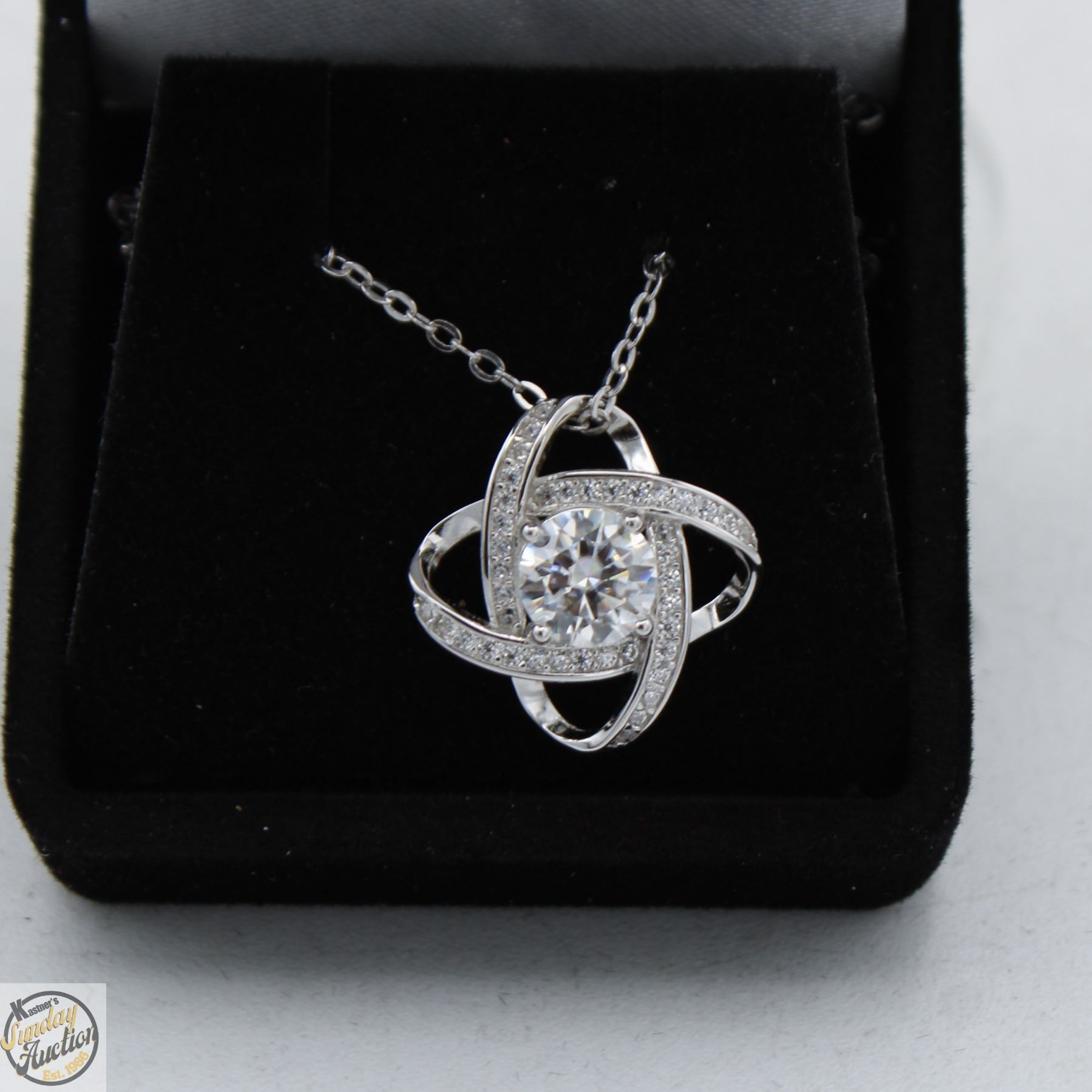 CUT MOISSANITE STONE VVS D COLOR WITH 39 ROUND BRILLIANT CUT CUBIC ZIRCONIA SET IN 2 INTERLOCKING OVALS SET IN 925 SILVER PENDANT RETAIL VALUE $775.00 **ALL ITEMS MUST BE REMOVED BY 5PM SATURDAY, FEBRUARY 28TH 2026. ALL REMAINING ITEMS WILL BE SUBJECT TO A $6.00 PER DAY STORAGE CHARGE. ANY ITEMS REMAINING AFTER MONDAY, MARCH 16TH, 2026 WILL BE CONSIDERED FORFEITED. NO REFUNDS WILL BE ISSUED FOR FORFEITED ITEMS. TO SCHEDULE A PICK UP APPOINTMENT CLICK HERE