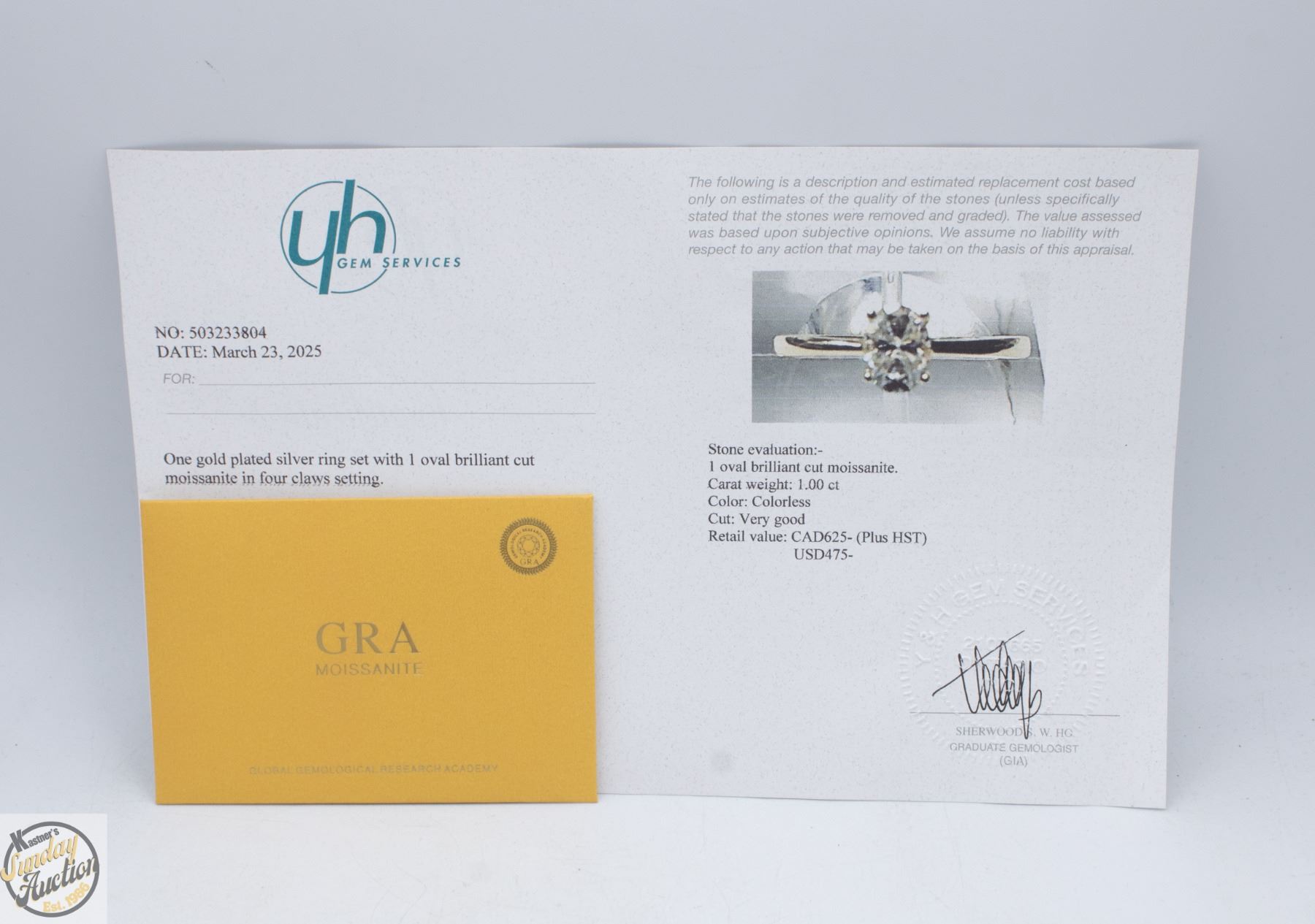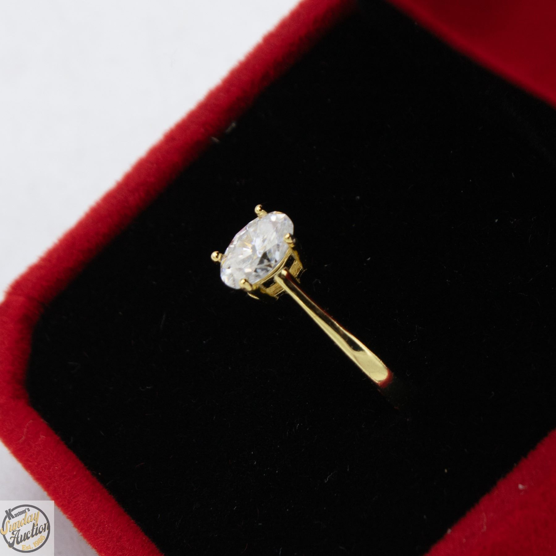 MOISSANITE STONE VVS D COLOR SET IN 4 CLAW HEAD SET IN 925 SILVER RING THAT IS YELLOW GOLD-PLATED SIZE 6.5 RETAIL VALUE $625.00 **ALL ITEMS MUST BE REMOVED BY 5PM SATURDAY, MARCH 21ST 2026. ALL REMAINING ITEMS WILL BE SUBJECT TO A $6.00 PER DAY STORAGE CHARGE. ANY ITEMS REMAINING AFTER MONDAY, APRIL 13TH 2026 WILL BE CONSIDERED FORFEITED. NO REFUNDS WILL BE ISSUED FOR FORFEITED ITEMS. TO SCHEDULE A PICK UP APPOINTMENT CLICK HERE
