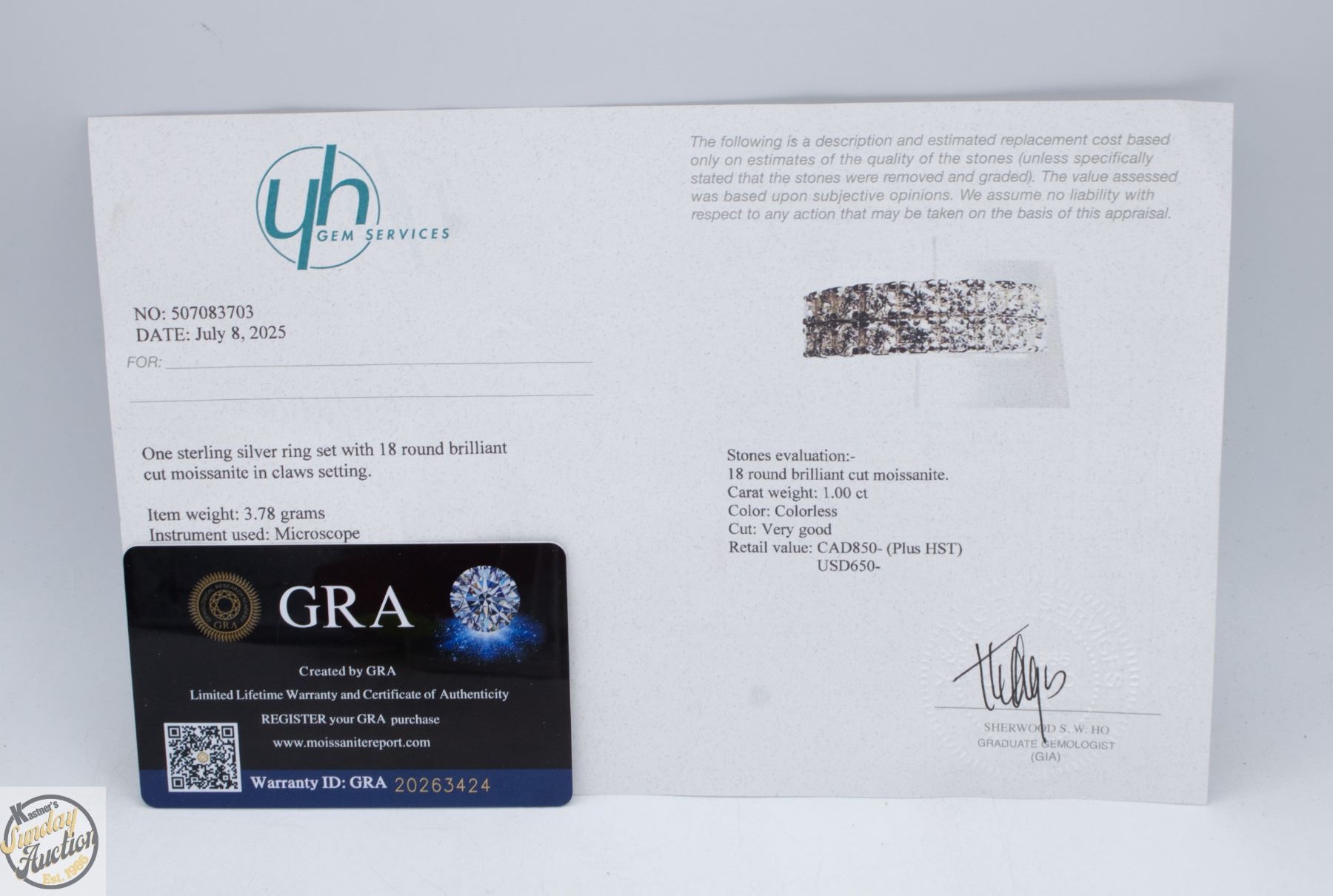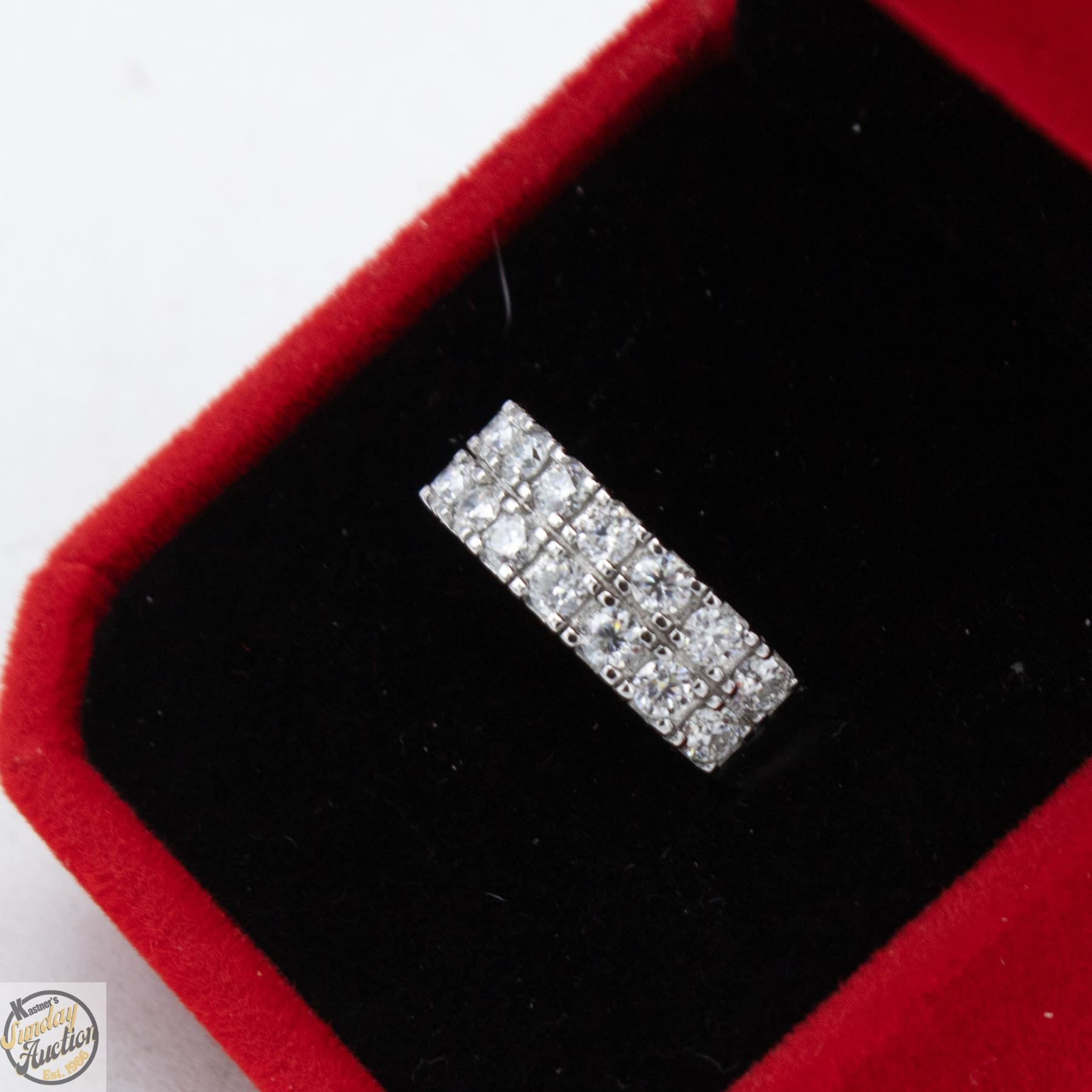 BRILLIANT CUT MOISSANITE STONES VVS D COLOR WITH THE 18 ROUND BRILLIANT CUT MOISSANITE STONES SET IN 2 ROWS ON TOP SET IN 925 SILVER RING SIZE 6 RETAIL VALUE $850.00 **ALL ITEMS MUST BE REMOVED BY 5PM SATURDAY, MARCH 14TH 2026. ALL REMAINING ITEMS WILL BE SUBJECT TO A $6.00 PER DAY STORAGE CHARGE. ANY ITEMS REMAINING AFTER MONDAY, APRIL 6TH 2026 WILL BE CONSIDERED FORFEITED. NO REFUNDS WILL BE ISSUED FOR FORFEITED ITEMS. TO SCHEDULE A PICK UP APPOINTMENT CLICK HERE