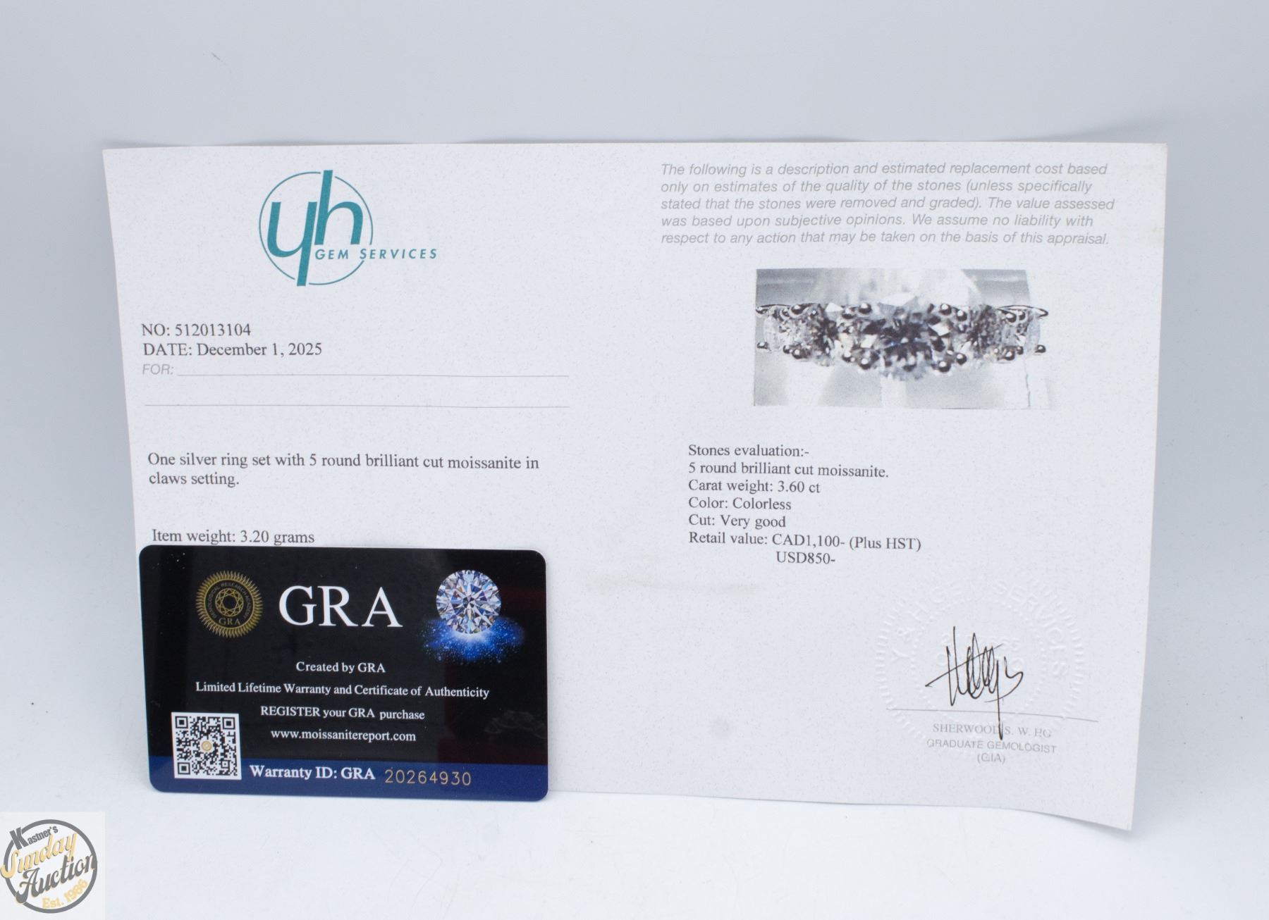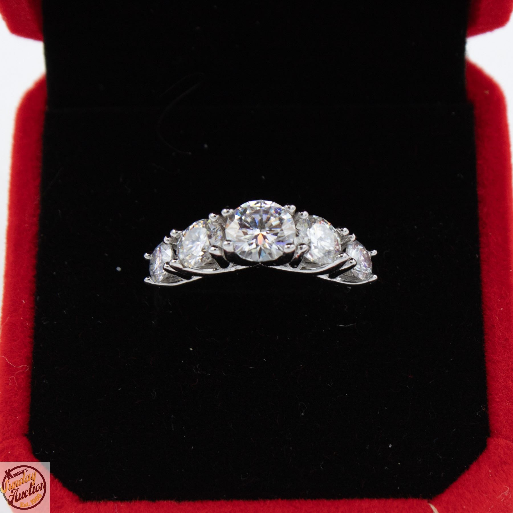 BRILLIANT CUT MOISSANITE STONE VVS D COLOR WITH THE 5 MOISSANITE STONES SET GRADUATING DOWN IN SIZE FROM CENTER SET IN 925 SILVER RING SIZE 6 RETAIL VALUE $1,100.00 **ALL ITEMS MUST BE REMOVED BY 5PM SATURDAY, MARCH 14TH 2026. ALL REMAINING ITEMS WILL BE SUBJECT TO A $6.00 PER DAY STORAGE CHARGE. ANY ITEMS REMAINING AFTER MONDAY, APRIL 6TH 2026 WILL BE CONSIDERED FORFEITED. NO REFUNDS WILL BE ISSUED FOR FORFEITED ITEMS. TO SCHEDULE A PICK UP APPOINTMENT CLICK HERE