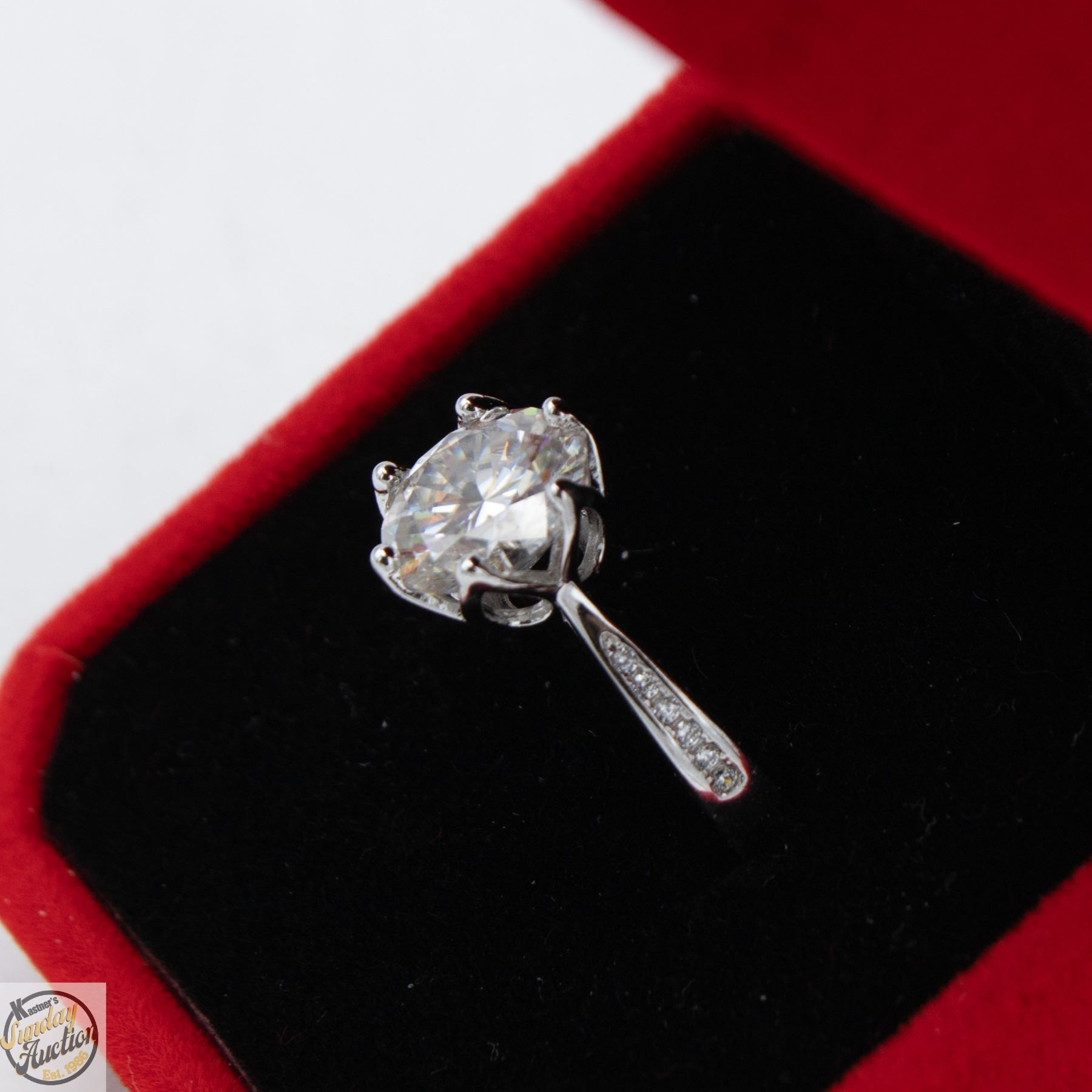 CUT MOISSANITE STONE VVS D COLOR WITH 12 ROUND BRILLIANT CUT CUBIC ZIRCONIA SET IN SHANKS SET IN 925 SILVER RING SIZE 6 RETAIL VALUE $1,275.00 **ALL ITEMS MUST BE REMOVED BY 5PM SATURDAY, MARCH 14TH 2026. ALL REMAINING ITEMS WILL BE SUBJECT TO A $6.00 PER DAY STORAGE CHARGE. ANY ITEMS REMAINING AFTER MONDAY, APRIL 6TH 2026 WILL BE CONSIDERED FORFEITED. NO REFUNDS WILL BE ISSUED FOR FORFEITED ITEMS. TO SCHEDULE A PICK UP APPOINTMENT CLICK HERE