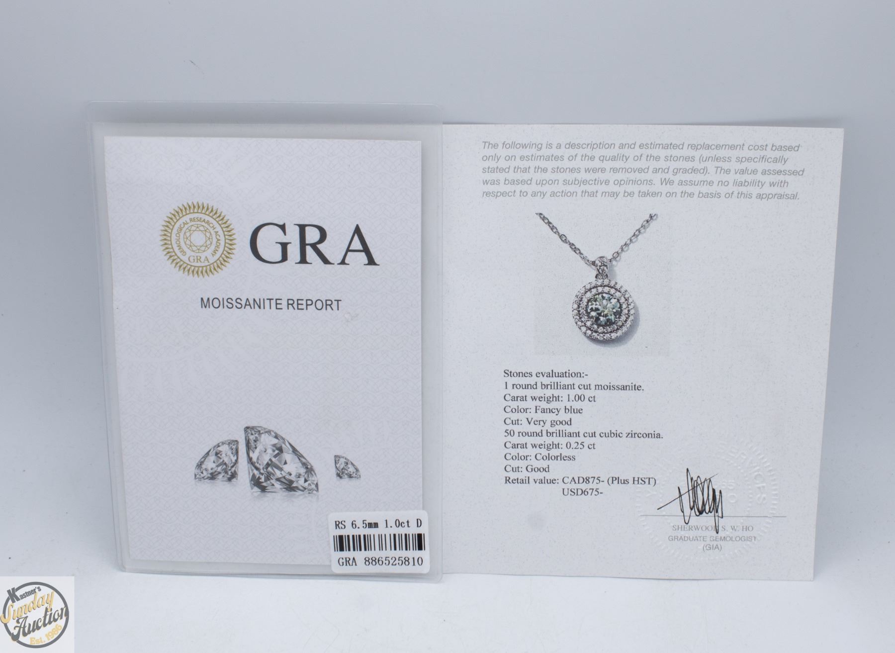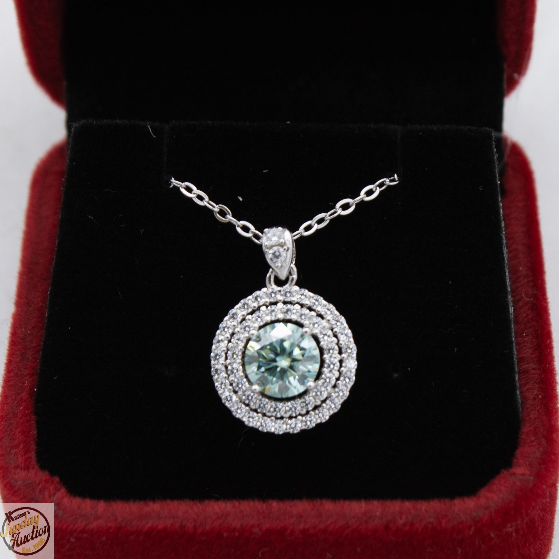 CUT MOISSANITE STONE VVS FANCY BLUE COLOR WITH 50 ROUND BRILLIANT CUT CUBIC ZIRCONIA SET IN DUAL HALOS SET IN 925 SILVER PENDANT RETAIL VALUE $875.00 **ALL ITEMS MUST BE REMOVED BY 5PM SATURDAY, MARCH 14TH 2026. ALL REMAINING ITEMS WILL BE SUBJECT TO A $6.00 PER DAY STORAGE CHARGE. ANY ITEMS REMAINING AFTER MONDAY, APRIL 6TH 2026 WILL BE CONSIDERED FORFEITED. NO REFUNDS WILL BE ISSUED FOR FORFEITED ITEMS. TO SCHEDULE A PICK UP APPOINTMENT CLICK HERE