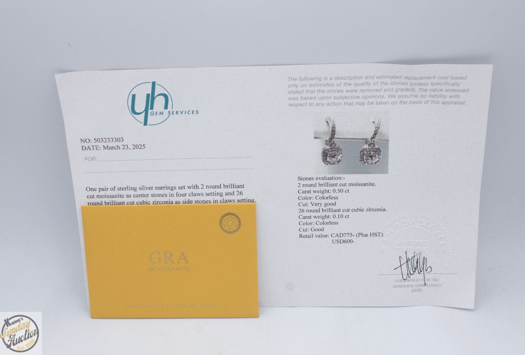 CUT MOISSANITE STONE VVS D COLOR WITH 26 ROUND BRILLIANT CUT CUBIC ZIRCONIA SET IN DANGLING SQUARE HALO SET IN 925 SILVER EARRINGS RETAIL VALUE $775.00 **ALL ITEMS MUST BE REMOVED BY 5PM SATURDAY, MARCH 14TH 2026. ALL REMAINING ITEMS WILL BE SUBJECT TO A $6.00 PER DAY STORAGE CHARGE. ANY ITEMS REMAINING AFTER MONDAY, APRIL 6TH 2026 WILL BE CONSIDERED FORFEITED. NO REFUNDS WILL BE ISSUED FOR FORFEITED ITEMS. TO SCHEDULE A PICK UP APPOINTMENT CLICK HERE