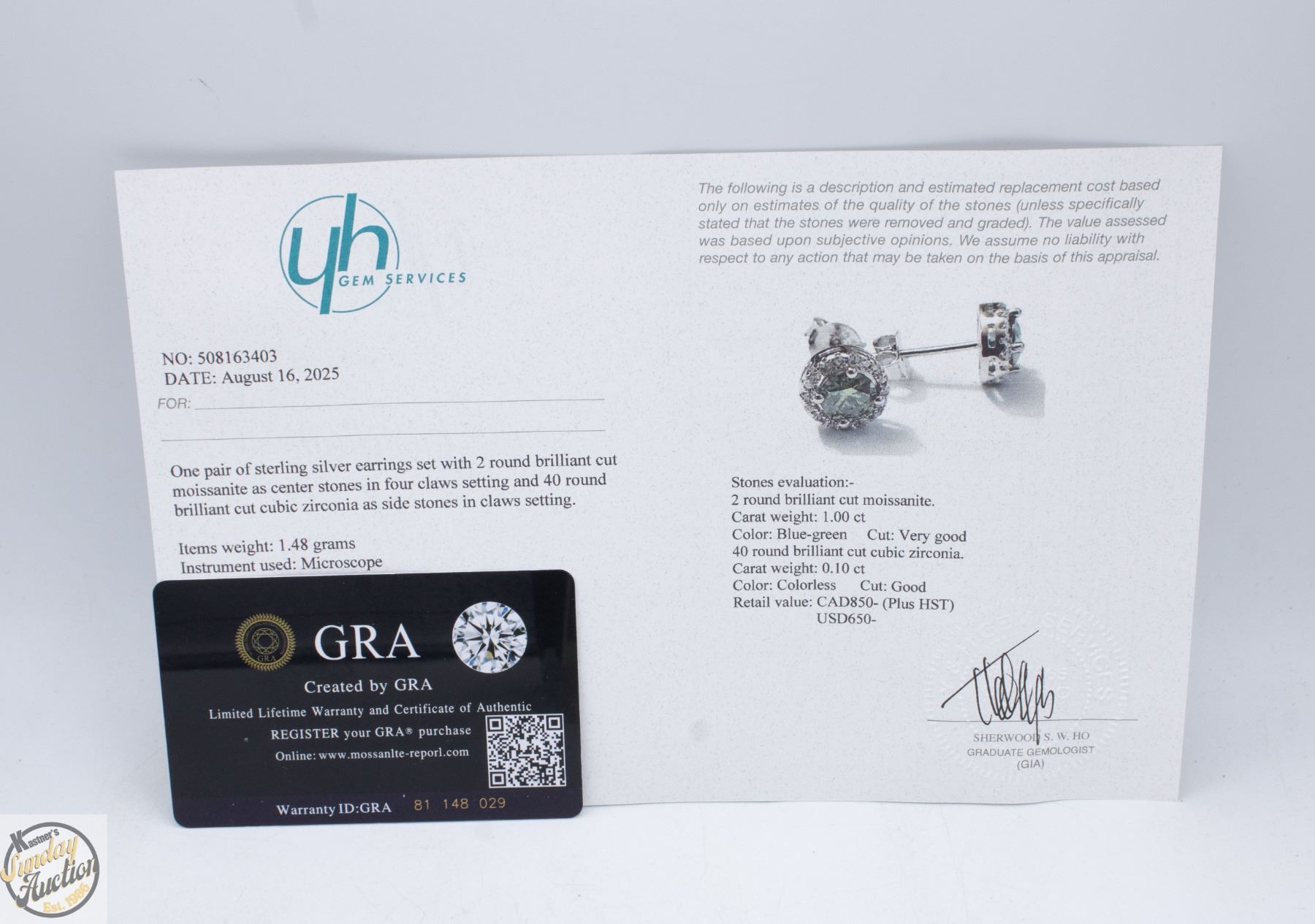 CUT MOISSANITE STONE VVS BLUE-GREEN COLOR WITH 40 ROUND BRILLIANT CUT CUBIC ZIRCONIA SET IN ROUND HALO SET IN 925 SILVER EARRINGS RETAIL VALUE $850.00 **ALL ITEMS MUST BE REMOVED BY 5PM SATURDAY, MARCH 14TH 2026. ALL REMAINING ITEMS WILL BE SUBJECT TO A $6.00 PER DAY STORAGE CHARGE. ANY ITEMS REMAINING AFTER MONDAY, APRIL 6TH 2026 WILL BE CONSIDERED FORFEITED. NO REFUNDS WILL BE ISSUED FOR FORFEITED ITEMS. TO SCHEDULE A PICK UP APPOINTMENT CLICK HERE