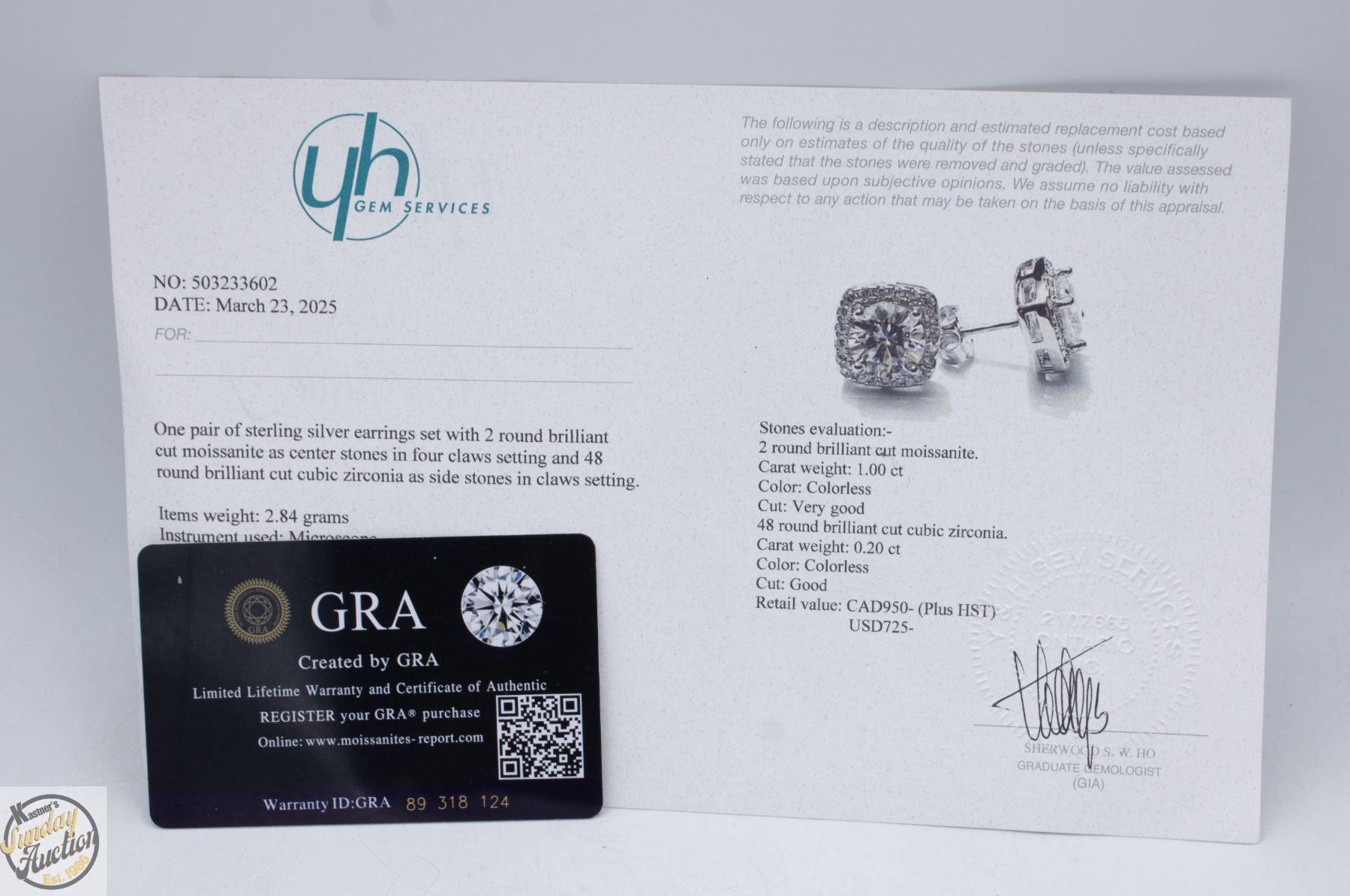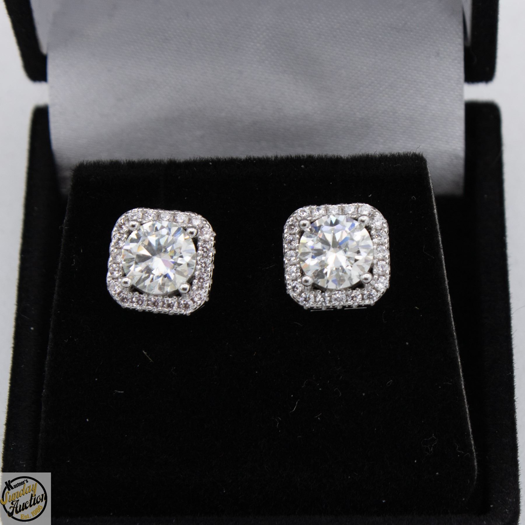 CUT MOISSANITE STONE VVS D COLOR WITH 48 ROUND BRILLIANT CUT CUBIC ZIRCONIA SET IN SQUARE HALO SET IN 925 SILVER EARRINGS RETAIL VALUE $950.00 **ALL ITEMS MUST BE REMOVED BY 5PM SATURDAY, MARCH 14TH 2026. ALL REMAINING ITEMS WILL BE SUBJECT TO A $6.00 PER DAY STORAGE CHARGE. ANY ITEMS REMAINING AFTER MONDAY, APRIL 6TH 2026 WILL BE CONSIDERED FORFEITED. NO REFUNDS WILL BE ISSUED FOR FORFEITED ITEMS. TO SCHEDULE A PICK UP APPOINTMENT CLICK HERE