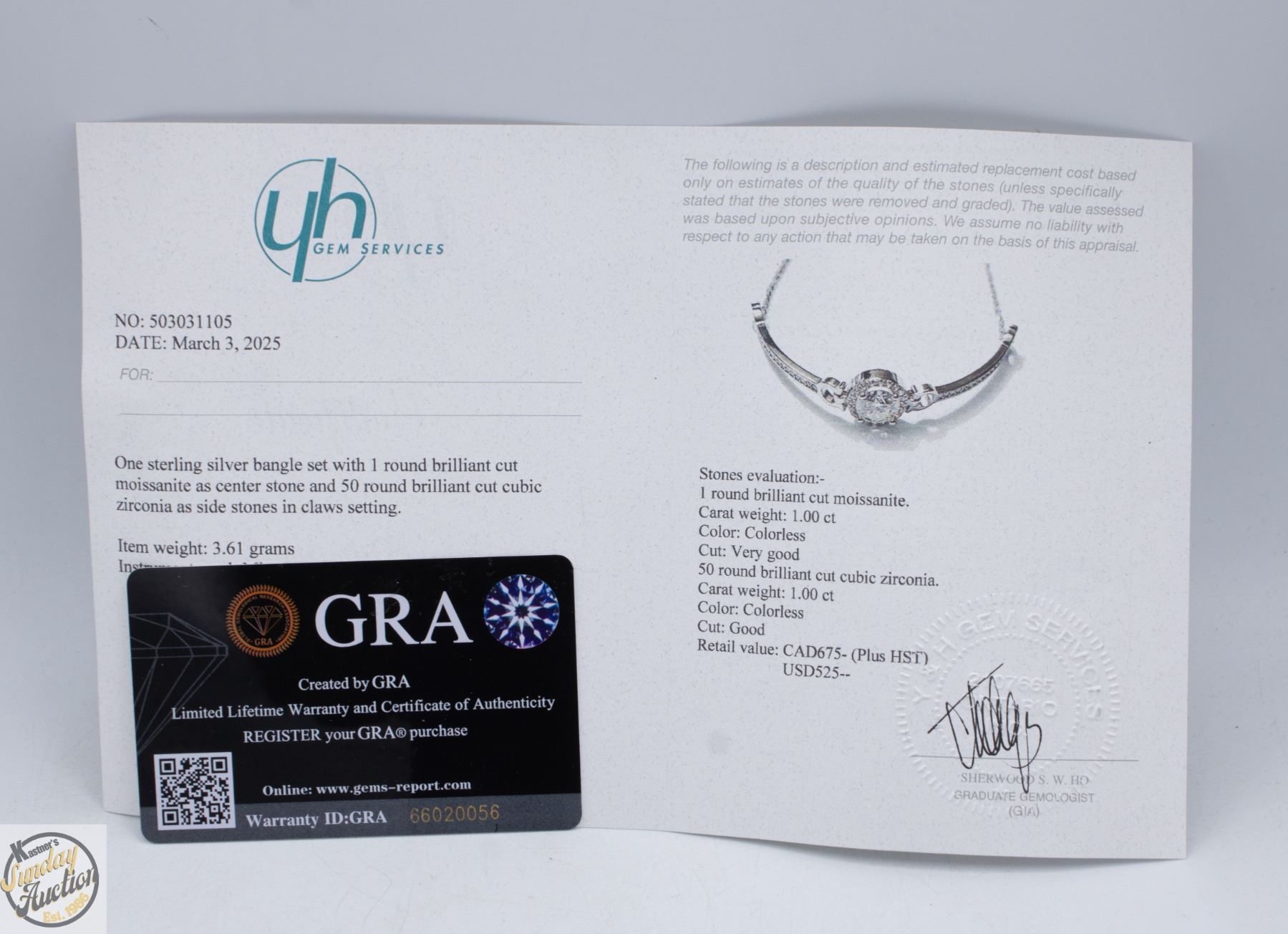 CUT MOISSANITE STONE VVS D COLOR WITH 50 ROUND BRILLIANT CUT CUBIC ZIRCONIA SET IN ROUND HALO WITH SOME SET IN BRACELET SET IN 925 SILVER BRACELET RETAIL VALUE $675.00 **ALL ITEMS MUST BE REMOVED BY 5PM SATURDAY, MARCH 14TH 2026. ALL REMAINING ITEMS WILL BE SUBJECT TO A $6.00 PER DAY STORAGE CHARGE. ANY ITEMS REMAINING AFTER MONDAY, APRIL 6TH 2026 WILL BE CONSIDERED FORFEITED. NO REFUNDS WILL BE ISSUED FOR FORFEITED ITEMS. TO SCHEDULE A PICK UP APPOINTMENT CLICK HERE