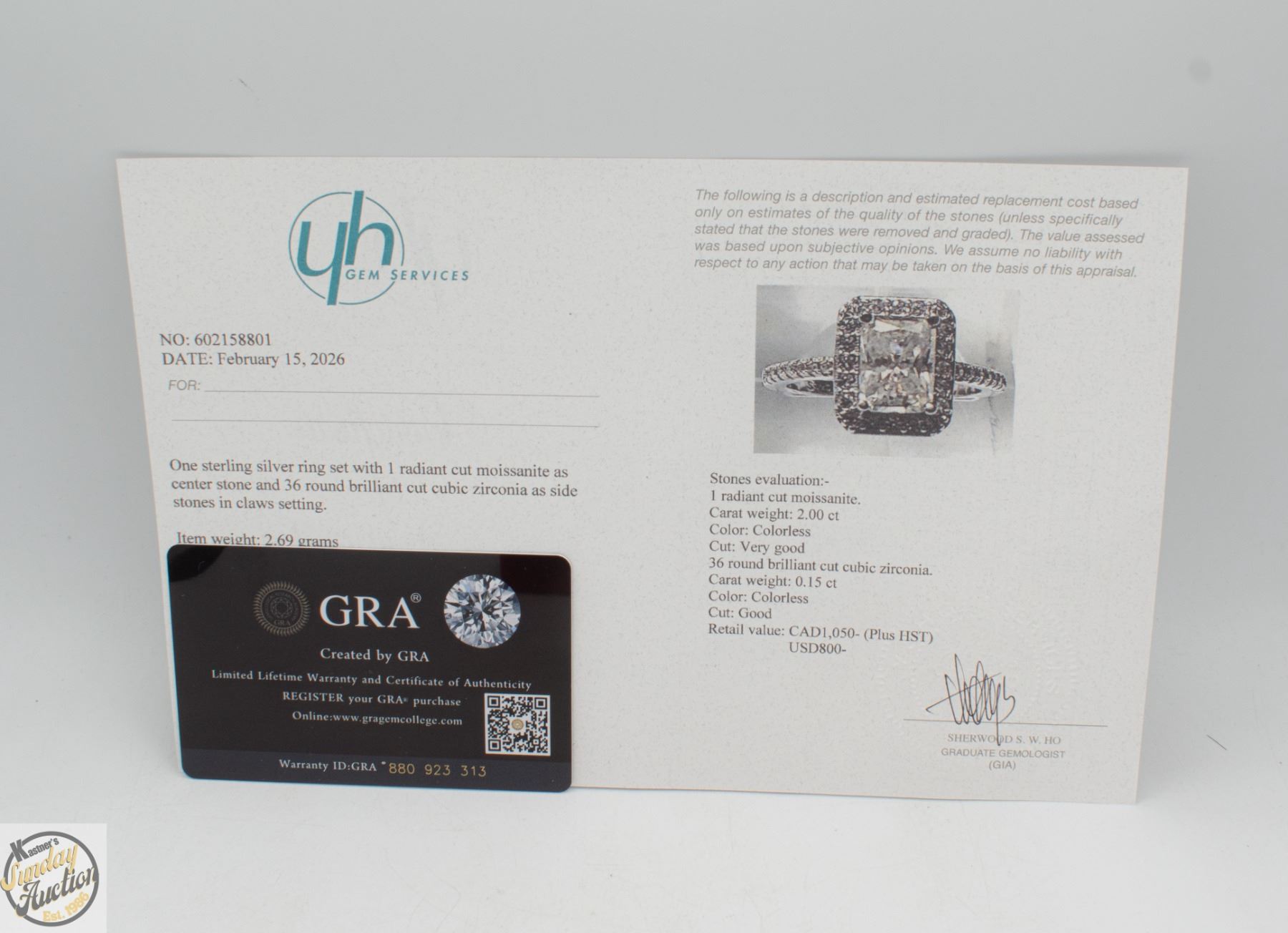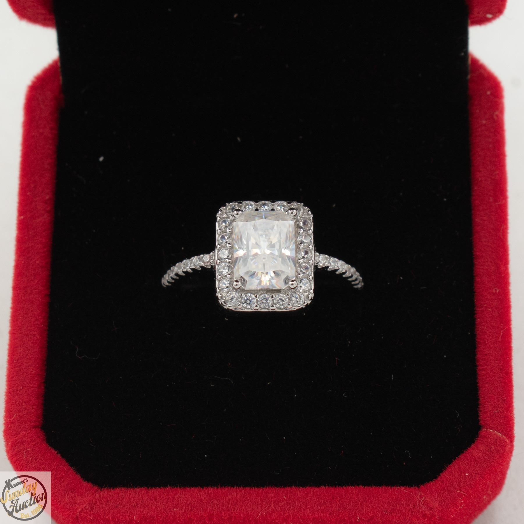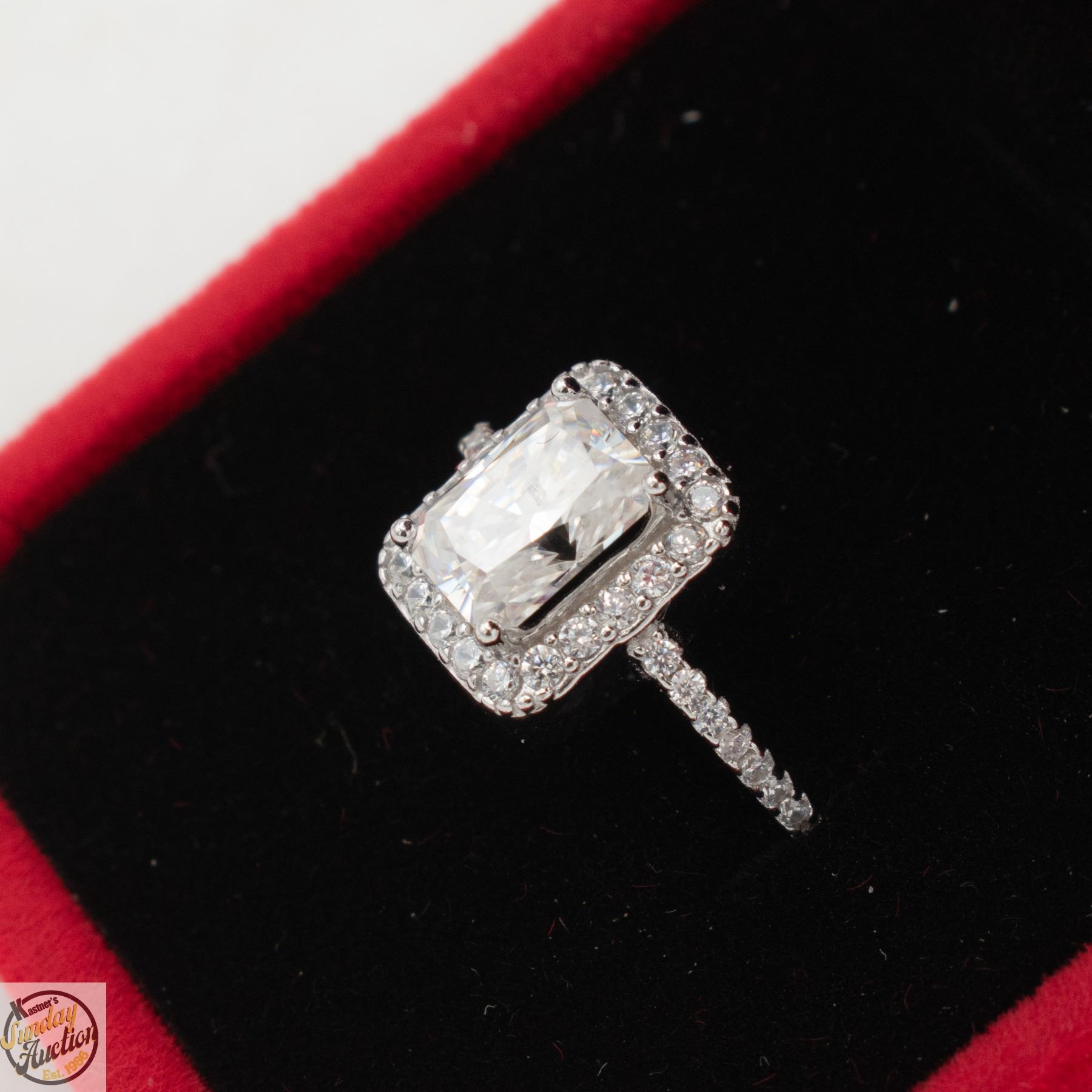 MOISSANITE STONE VVS D COLOR WITH 36 ROUND BRILLIANT CUT MOISSANITE STONES SET IN A RECTANGULAR HALO WITH MORE IN SHANKS SET IN 925 SILVER RING SIZE 6.25 RETAIL VALUE $1,050.00 **ALL ITEMS MUST BE REMOVED BY 5PM SATURDAY, MARCH 21ST 2026. ALL REMAINING ITEMS WILL BE SUBJECT TO A $6.00 PER DAY STORAGE CHARGE. ANY ITEMS REMAINING AFTER MONDAY, APRIL 13TH 2026 WILL BE CONSIDERED FORFEITED. NO REFUNDS WILL BE ISSUED FOR FORFEITED ITEMS. TO SCHEDULE A PICK UP APPOINTMENT CLICK HERE