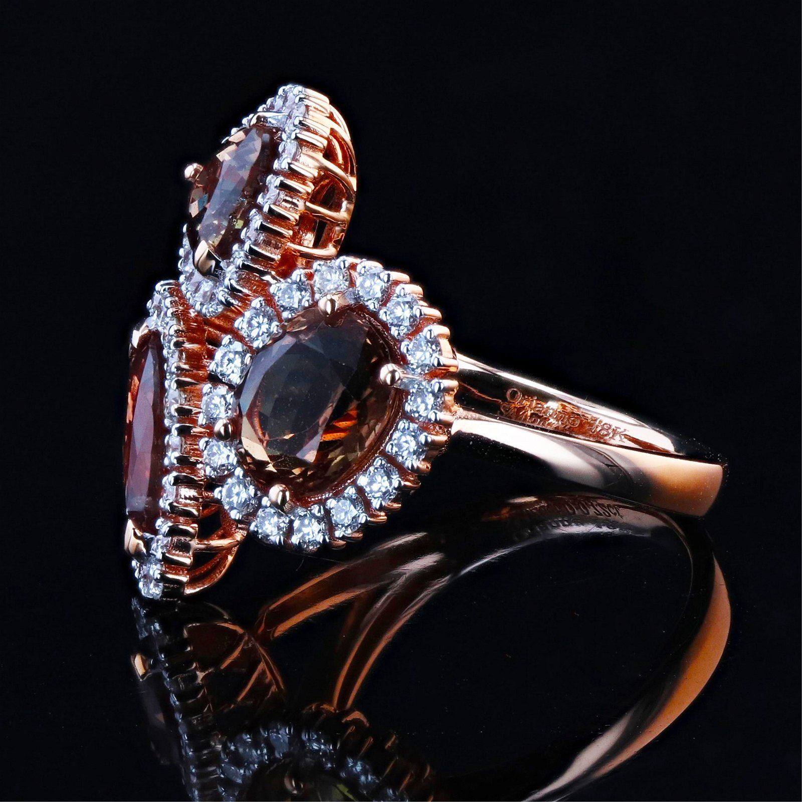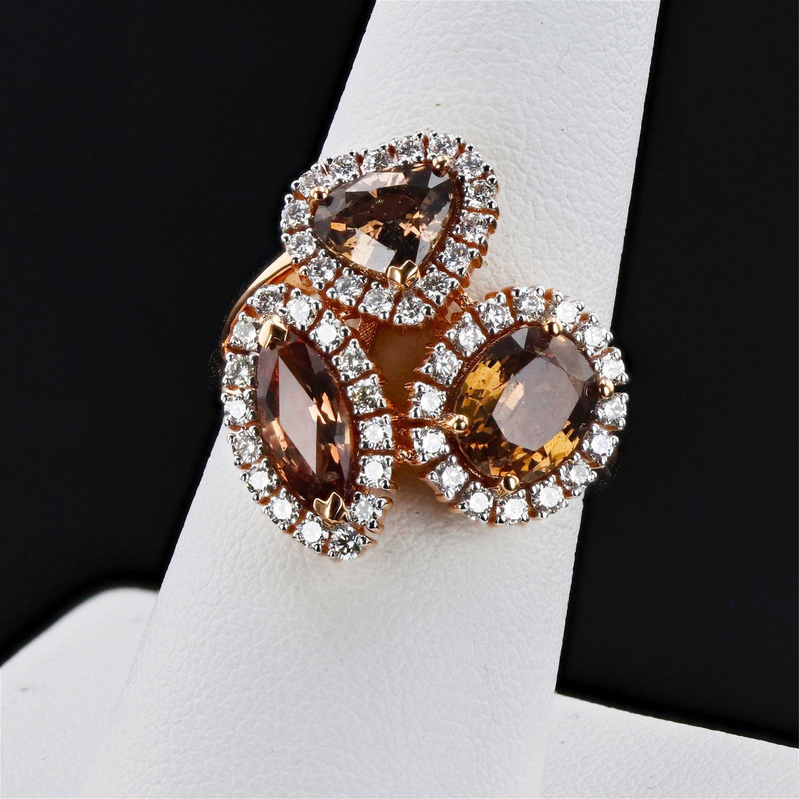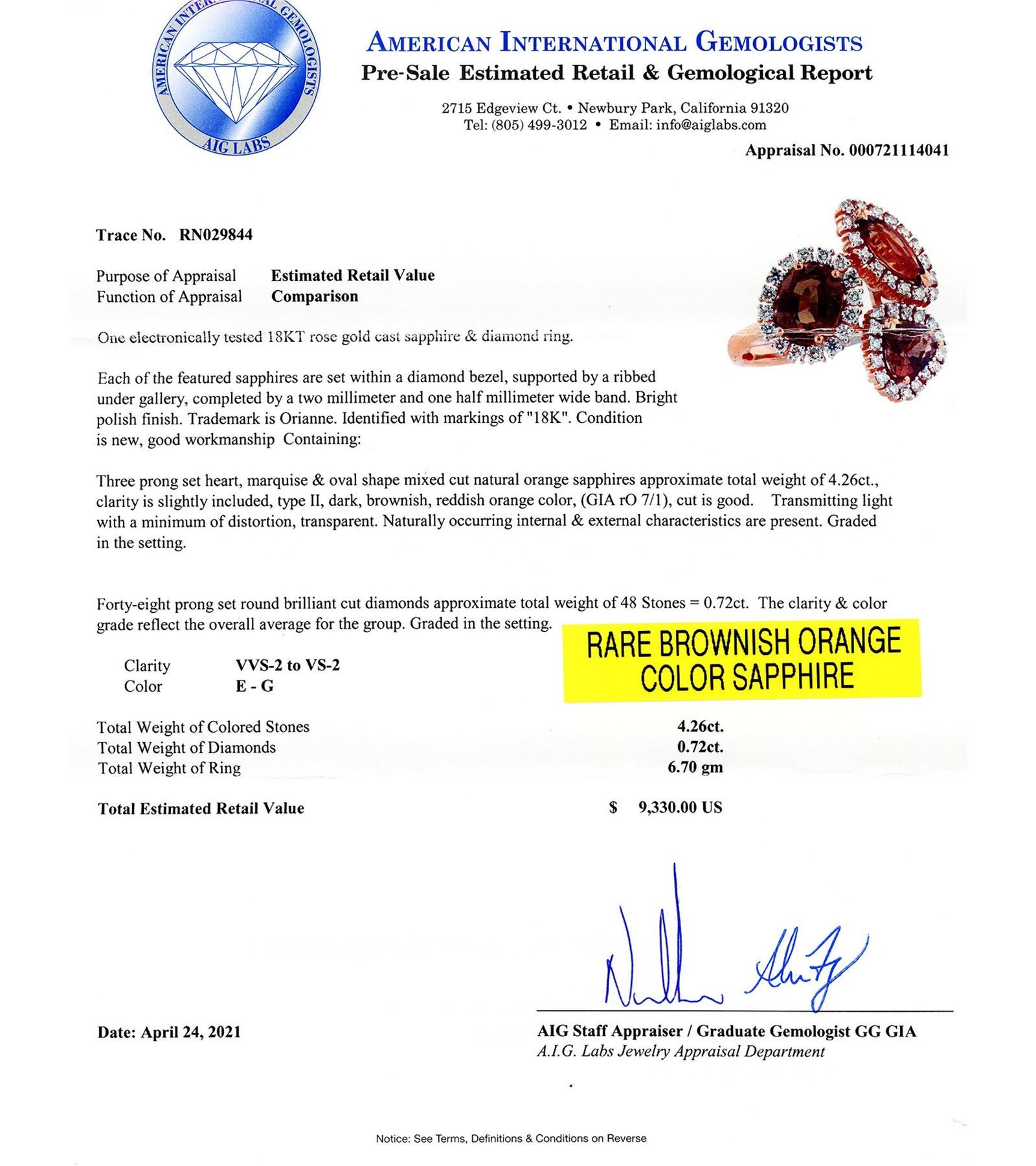One electronically tested 18KT rose gold cast sapphire & diamond ring. Each of the featured sapphires are set within a diamond bezel, supported by a ribbed under gallery, completed by a two millimeter and one halfmillimeter wide band. Bright polish finish. Trademark is Orianne. Identified with markings of "18K". Condition is new, good workmanship Three prong set heart, marquise & oval shape mixed cut natural orangesapphires approximate total weight of 4.26ct., clarity is slightly included, type II, dark, brownish, reddish orange color, (GIA r0 7/1), cut is good. Transmitting light with a minimum of distortion, transparent.Naturally occurring internal & external characteristics are present. Graded in the setting Forty-eight prong set round brilliant cut diamonds approximate total weight of 48 Stones = 0.72ct. The clarity & color gradereflect the overall average for the group. Graded in the setting Clarity VVS-2 to VS-2 Color E - G Total Weight of Colored Stones 4.26ct Total Weight of Diamonds 0.72ct Total Weight of Ring 6.70 gm