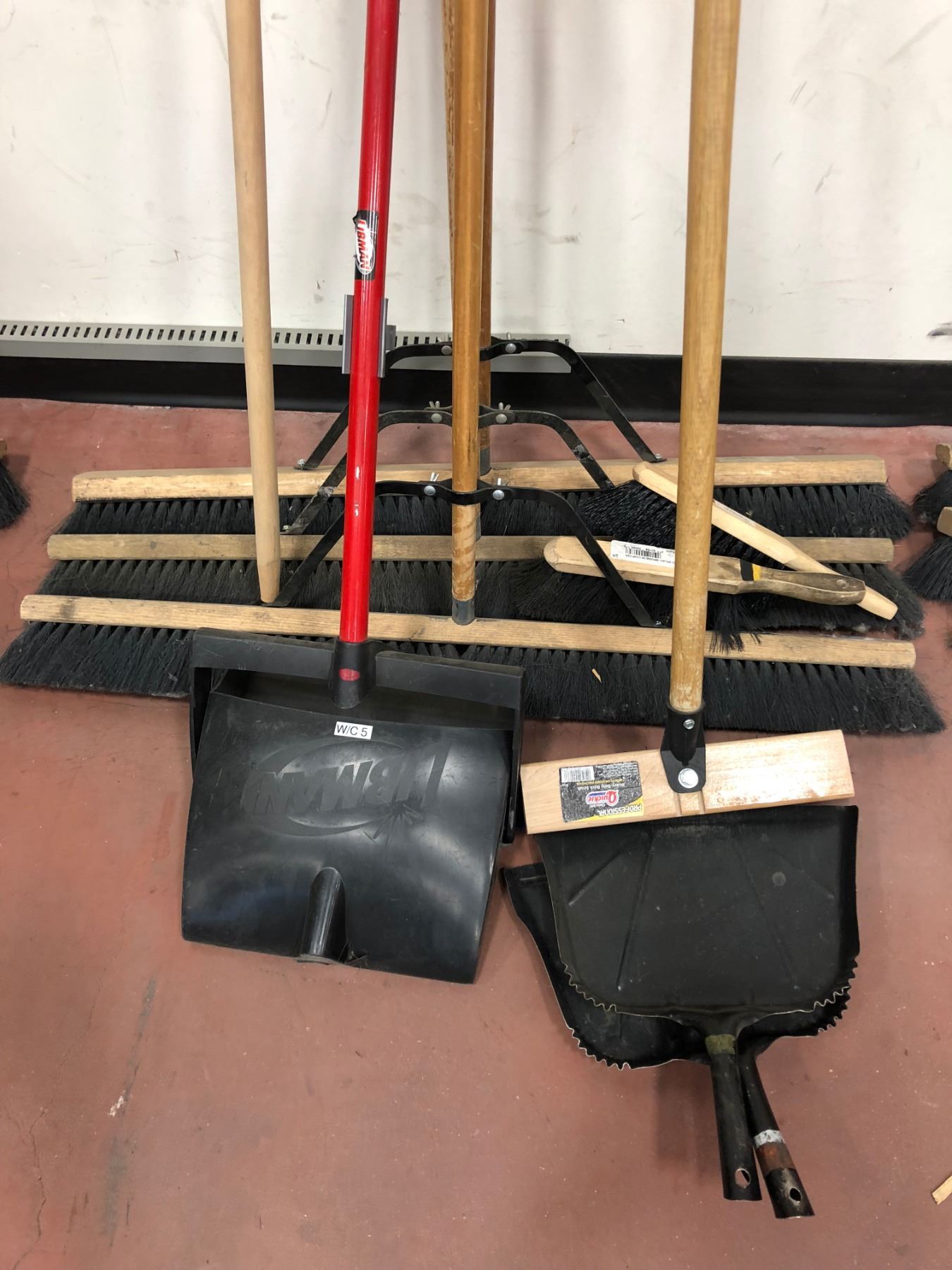 4 - 36" push brooms, 2 - hand brushes, 2 dustpans, 2 lobby dustpans, broom handle, 18 foot, deck scrubber, pail