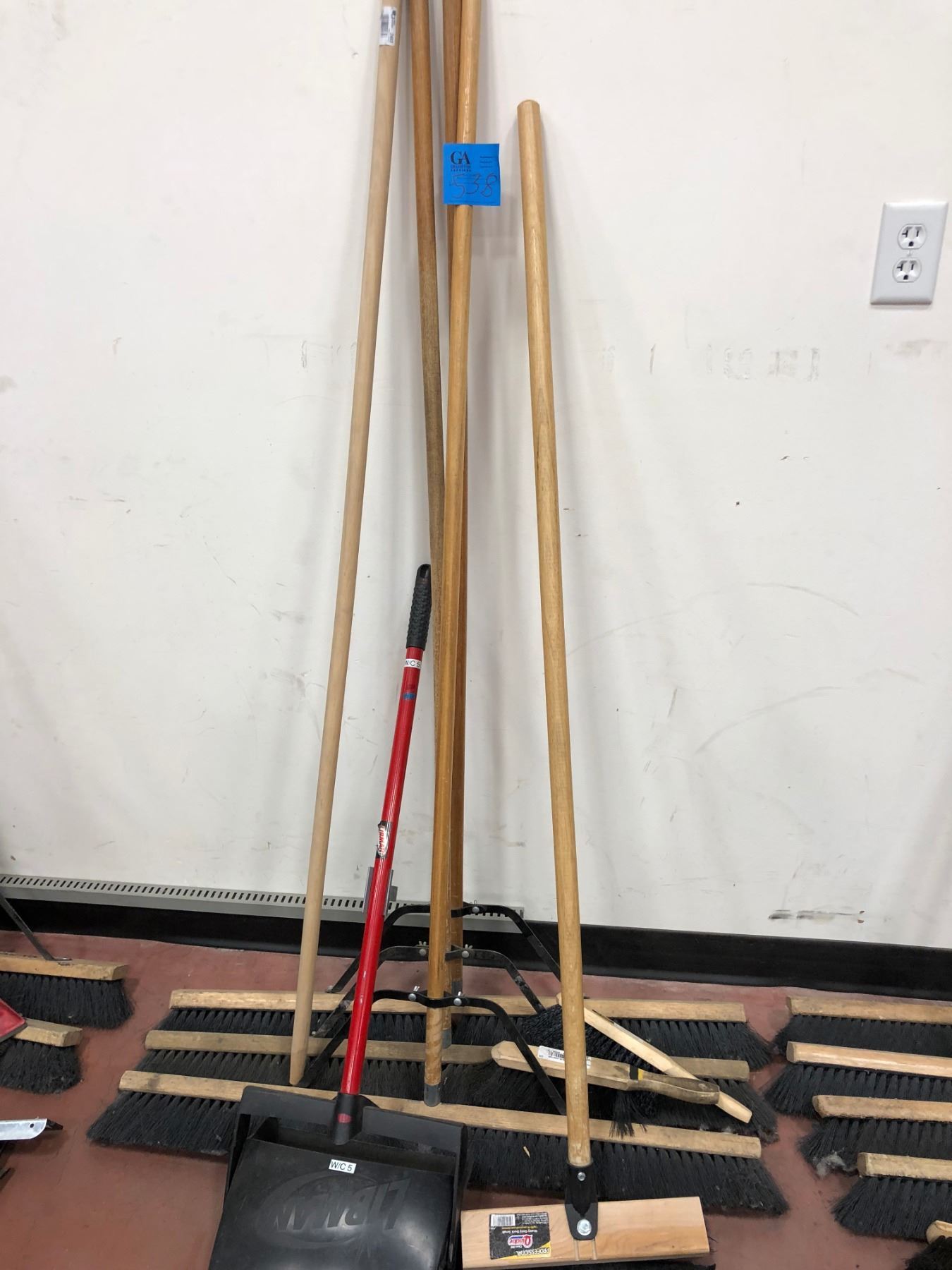 4 - 36" push brooms, 2 - hand brushes, 2 dustpans, 2 lobby dustpans, broom handle, 18 foot, deck scr
