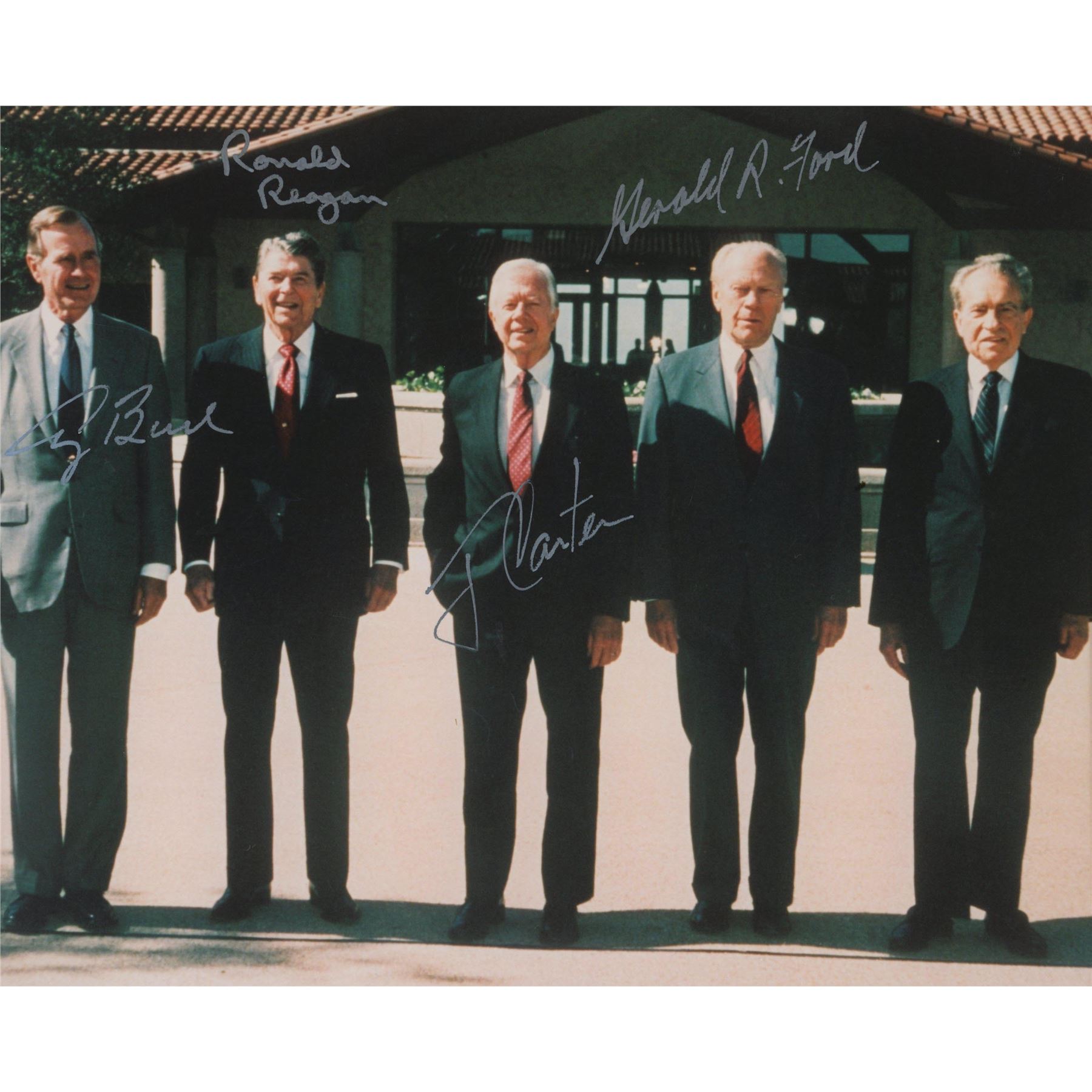 4 American Presidents signed photo autographed by George H.W. Bush, Ronald Reagan Jimmy Carter, Gerald Ford. Custom framed, matted, 11x14 inches. GFA Authenticated