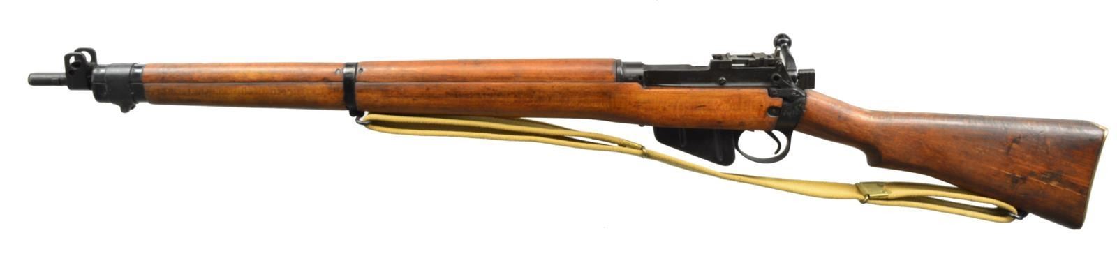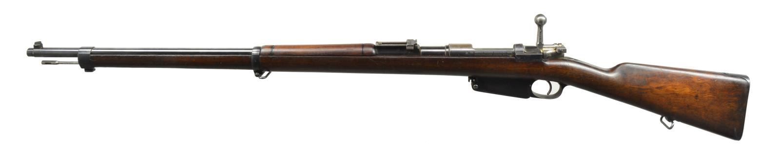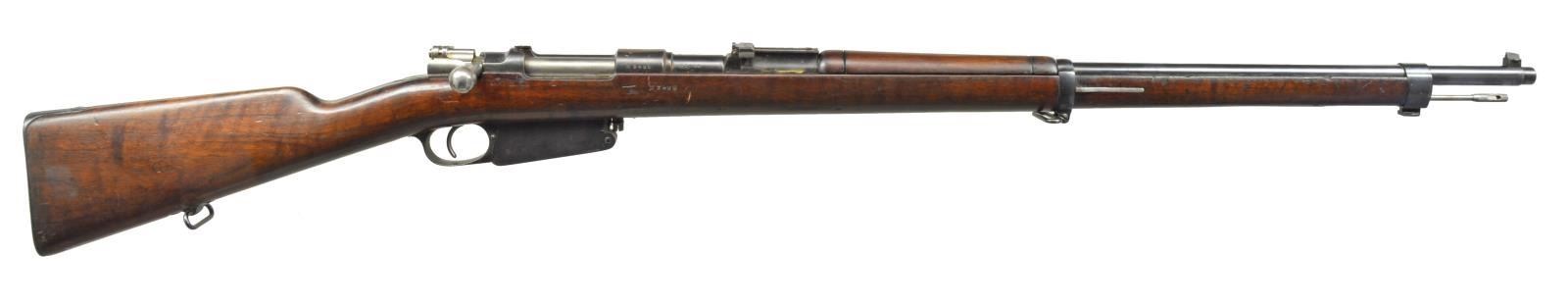 1) MODEL 1891 ARGENTINE CONTRACT MAUSER. Cal. 7.65 Argentine. S# N2486. Bbl. 29 1/8". All visible numbers match. Receiver marked on left rail “MAUSER MODELLO ARGENTINO 1891 MANUFACTUERA LOEWE BERLIN”. Argentine crest has been removed. Straight bolt handle. Ladder rear sight graduated to 2000m. Inverted V front sight. Cleaning rod is present. Matching walnut stock set. Buttstock is marked on right side w/ faint Argentine acceptance mark. CONDITION: stock set has light wear, staining & handling marks over original finish. Metal has 75% blue w/ thinning & light wear. Fair, worn bore turning dark. (01-18123/RW). ANTIQUE. 2) NO. 4 MK 1 LEE ENFIELD. Cal. 303 Brit. S# S14100. Bbl. 25". Numbers match on receiver, bolt & mag. Receiver marked on left side of butt socket “M” & “194?”. Receiver marked on left wall w/ “No. 4. MK1”. Receiver marked on left side of ring w/ “303 Brit” & “UK” as export mark. Import mark on left side of butt socket. Latch type bolt head release. Adj. aperture rear sight graduated to 1300yds. Blade front sight w/ protective ears. Hardwood stock set w/ brass trap buttplate. Khaki web sling marked “HUGH CARSON CO LTD”. MAGS: 1 matching 10 rd. mag. CONDITION: stock set has arsenal rework finish w/ light wear, staining & handling marks. Metal has 75% arsenal rework black finish w/ thinning & light wear. Very good, shiny 2 groove bore. (20-2239/RW). CURIO. 3) SWISS MODEL 1911. Cal. 7.5 Swiss. S# 449978. Bbl. 30 3/4". All visible numbers match. Receiver marked w/ “BP” (Berne Proof). Receiver marked on left side w/ “P”, indicating private purchase. Tangent rear sight graduated to the famous 2000m. Blade front sight. Stocking rod & bayonet lug are present. Walnut stock set. Buttstock marked on left side w/ Swiss acceptance mark. MAGS: 1-6 rd. detachable mag. CONDITION: stock set has light wear, staining & scattered handling marks throughout. Metal retains 80% blue w/ thinning & light wear. Very good, shiny bore. (20-2243/RW). CURIO. 4) MODEL 98K MAUSER BBL. ACTION. Cal. 8mm Mauser. S# 1219. Bbl. 23 1/2". All visible numbers match. Receiver marked on left rail w/ “Mod 98”. Receiver ring marked on top w/ “237”, German code for Berlin Luebecker Maschinenfabriken. Dated 1939. Receiver ring also marked on right side w/ 3 Waffenamt 214. Rifle consists of action parts plus bbl. Other parts are not present. CONDITION: receiver has been drilled & tapped on left side for side mt. scope. Bolt is polished bright. Bbl. has had sights removed & has been ground at forward edge of chamber area & at forward edge of rear sight area. Guard screw locking screws are not present. Metal has 40% original blue w/ thinning, wear, oxidation & fine pitting. Fair, worn bore. (20-2292/RW). MODERN. $800-1,100.