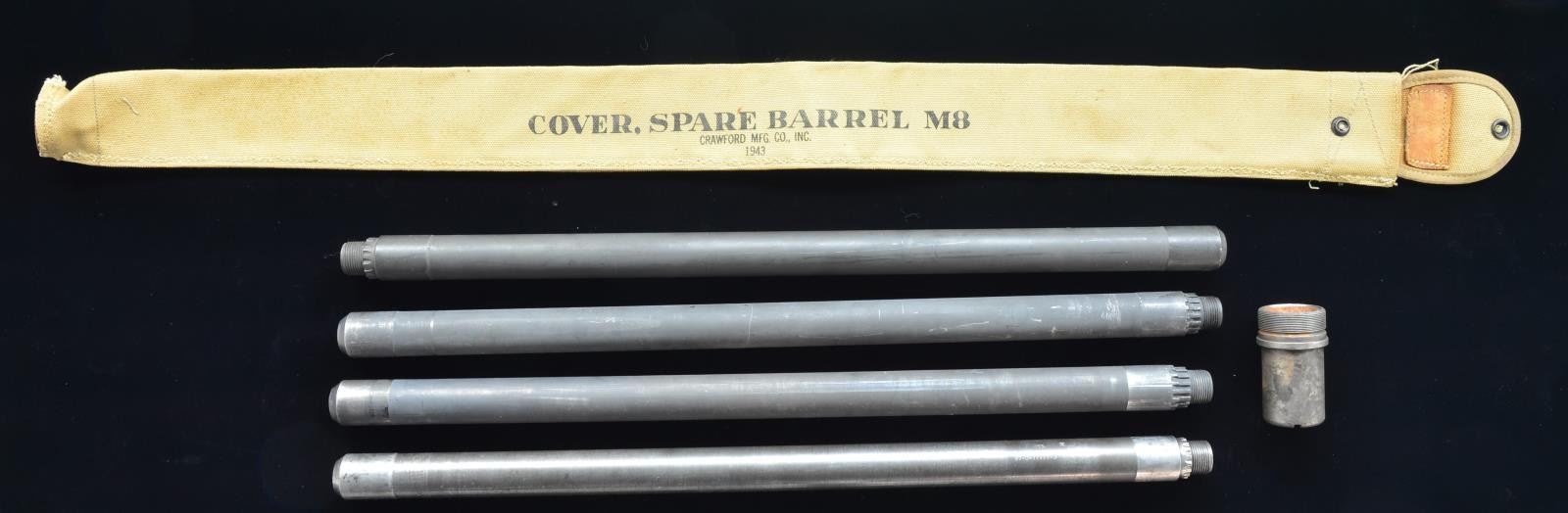 1-2) 2 - 24" Bbls. chambered in 7.62 NATO, parkerized & marked “7.62” w/ Israeli stampings. 3-4) 2 - 24" bbls., one of which appears to be new, parkerized & is marked as such from the consignor, chambered in 30-06; the other has a thinning finish & is marked w/ the flaming U.S. Ordnance bomb. 5) 1 Spare tan canvas bbl. cover marked “COVER, SPARE BARREL M8” “CRAWFORD MFG. CO., INC.” “1943”. CONDITION: all bbls. have strong rifling, most may never have been issued. (02-14072/JZ). $400-800.