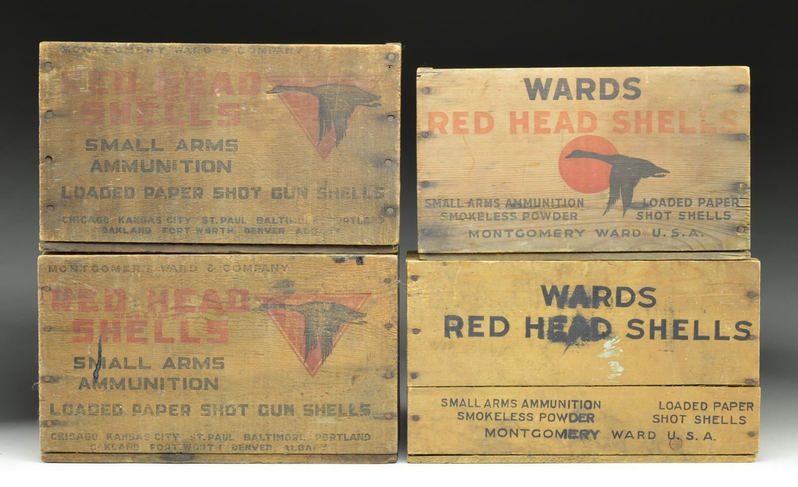 Red Head ammo crates: 3 cal. 12 Ga & 1 cal. 16 Ga. CONDITION: fair to good overall w/ missing pieces of wood, staining, cracks, & dents. (02-16599-16/MD). $100-200.