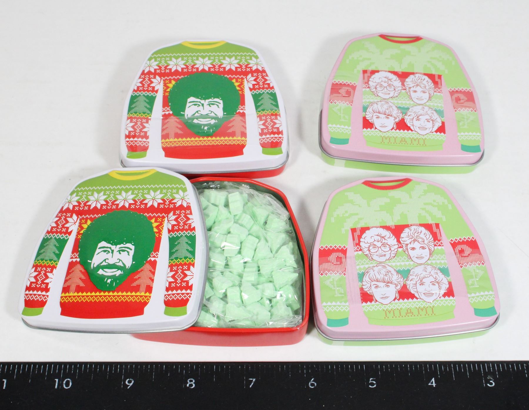 METAL CONTAINERS. TWO GOLDEN GIRLS HOLIDAY PALM TREE, AND BOB ROSS HAPPY TREE SHAPED.