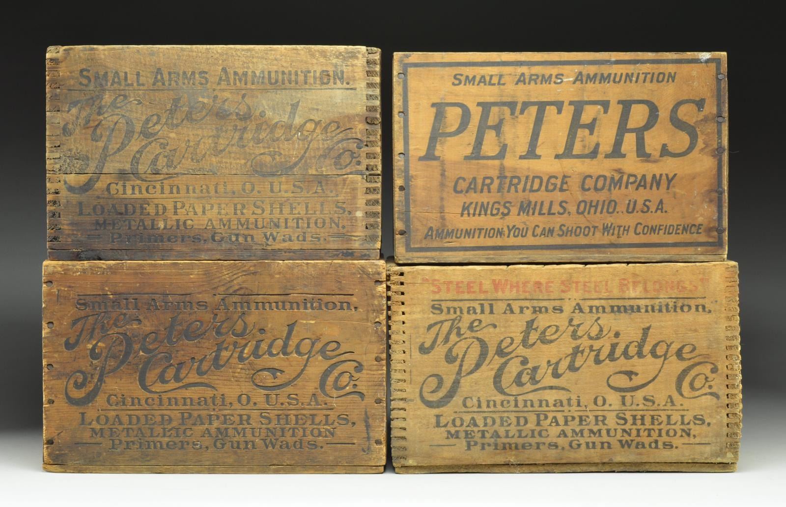 1 Referee 12 Ga. No. A 75. / 2 Victor 12 Ga. 2 3/4". / 1 High Gun 12 Ga 2 3/4". / CONDITION: fair to good overall w/ some fading to exterior paint, missing pieces of wood, staining, cracks, & dents. (02-16599-5/MD). $100-200.