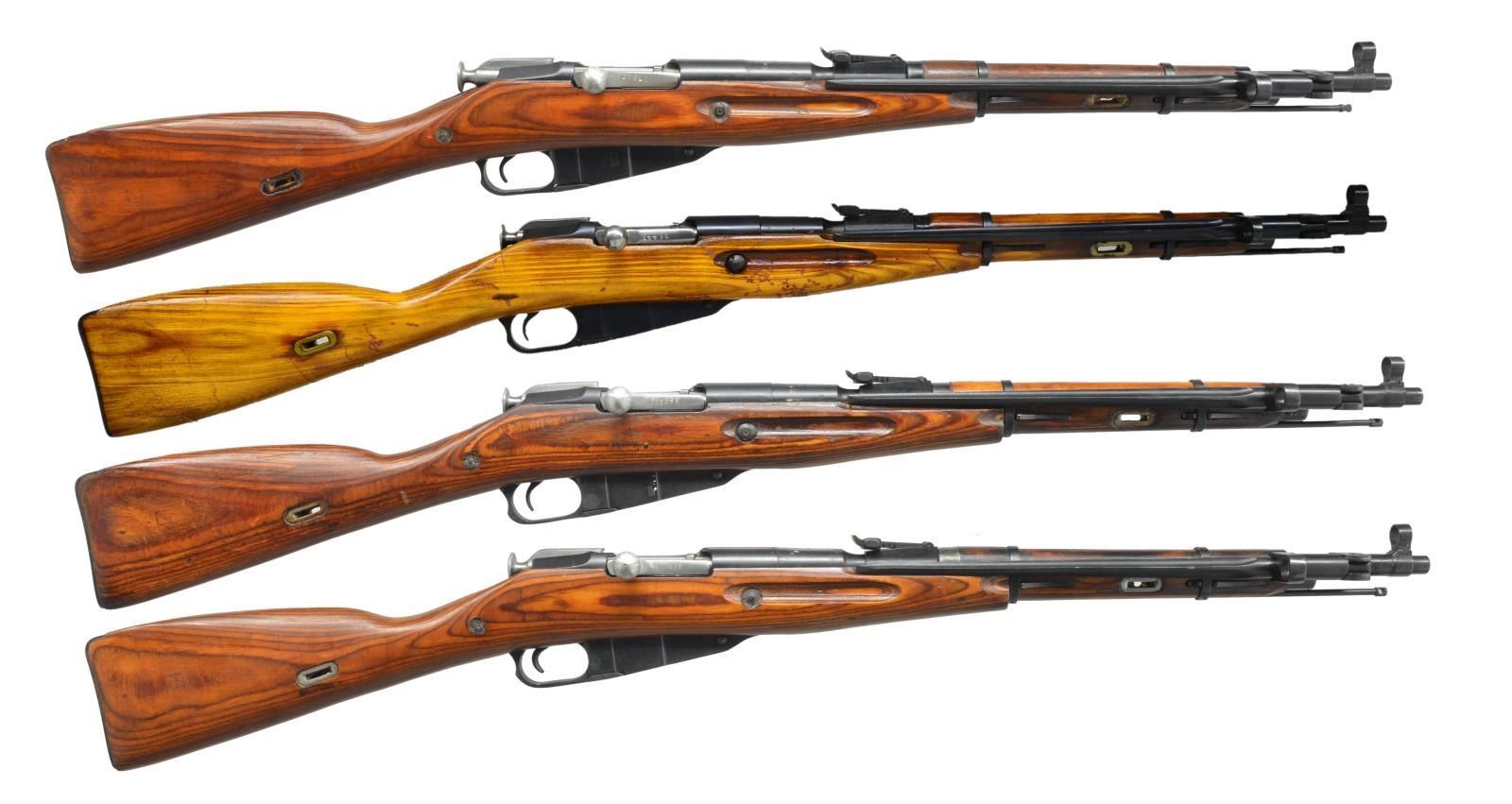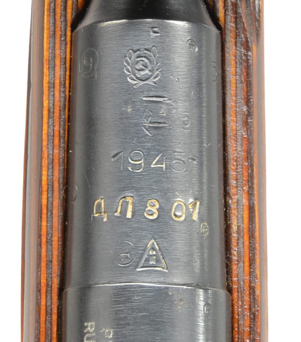 1) Cal. 7.62 x 54R. S# 005622. Original S# matches on bbl., buttplate & trigger guard. Bbl. 20 1/4", marked w/ "(hammer & sickle in wreath)" indicating mfg. Izhevsk Arsenal dated 1945. Tangent rear sight graduated 1000m. Post front sight w/ protective hood. Straight bolt handle. Cleaning rod is present. 12" Folding spike bayonet. Laminated hardwood stock w/ sling slots. CONDITION: stock has arsenal rework finish w/ very light wear & scattered handling marks. Metal has 80% arsenal rework finish w/ light wear & scratches, fair, worn bore turning dark w/ very fine pitting. (21-462/RW). 2) Cal. 7.62 x 54R. S# 006747. Original S# matches on bbl., buttplate & trigger guard. Bbl. 20 1/4", marked over chamber w/ "(hammer & sickle in wreath)" indicating mfg. at Izhevsk Arsenal. Dated 1944. Tangent rear sight graduated to 1000m. Post front sight w/ protective hood. Straight bolt handle. Cleaning rod is present. 12" Folding spike bayonet. Laminated hardwood stock w/ sling slots. CONDITION: stock has arsenal rework finish w/ moderate wear, dents, scratches & staining throughout. Metal retains 80% arsenal rework finish w/ light wear & scratches. Fair, worn bore turning dark. (21-494/RW). 3) Cal. 7.62 x 54R. S# FB445. Original S# matches on bbl., bolt, buttplate & floorplate. Bbl. 20 1/4". Tangent rear sight graduated to 1000m. Post front sight w/ protective hood. Cleaning rod is present. 12" Folding spike bayonet. Straight bolt handle. Laminated hardwood stock w/ 2 piece buttstock construction. CONDITION: stock has moderate wear, staining & scratches throughout w/ remnants of reddish protective coating over arsenal rework finish. Metal retains 90% arsenal rework type finish w/ light high point wear. Good bore w/ lightly worn lands. (21-504/RW). 4) Cal. 7.62x54R. S# 005625. Original S# matches on bbl., bolt, buttplate & floorplate. Bbl. 20 1/4", marked w/ "(hammer & sickle in wreath)" indicating mfg. Izhevsk Arsenal dated 1945. Tangent rear sight graduated to 1000m. Post front sight w/ protective hood. Straight bolt handle. Cleaning rod is present. 12" Folding spiked bayonet. Laminated hardwood stock w/ sling slots. CONDITION: wood & metal have arsenal rework type finish w/ attractive appearance, very light wear & handling marks. Fair, worn bore. (21-559/RW). ALL CURIO. $400-800.