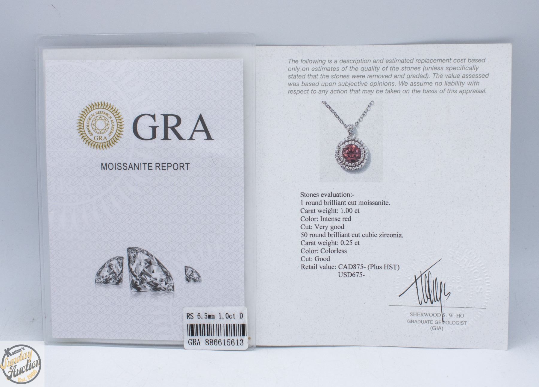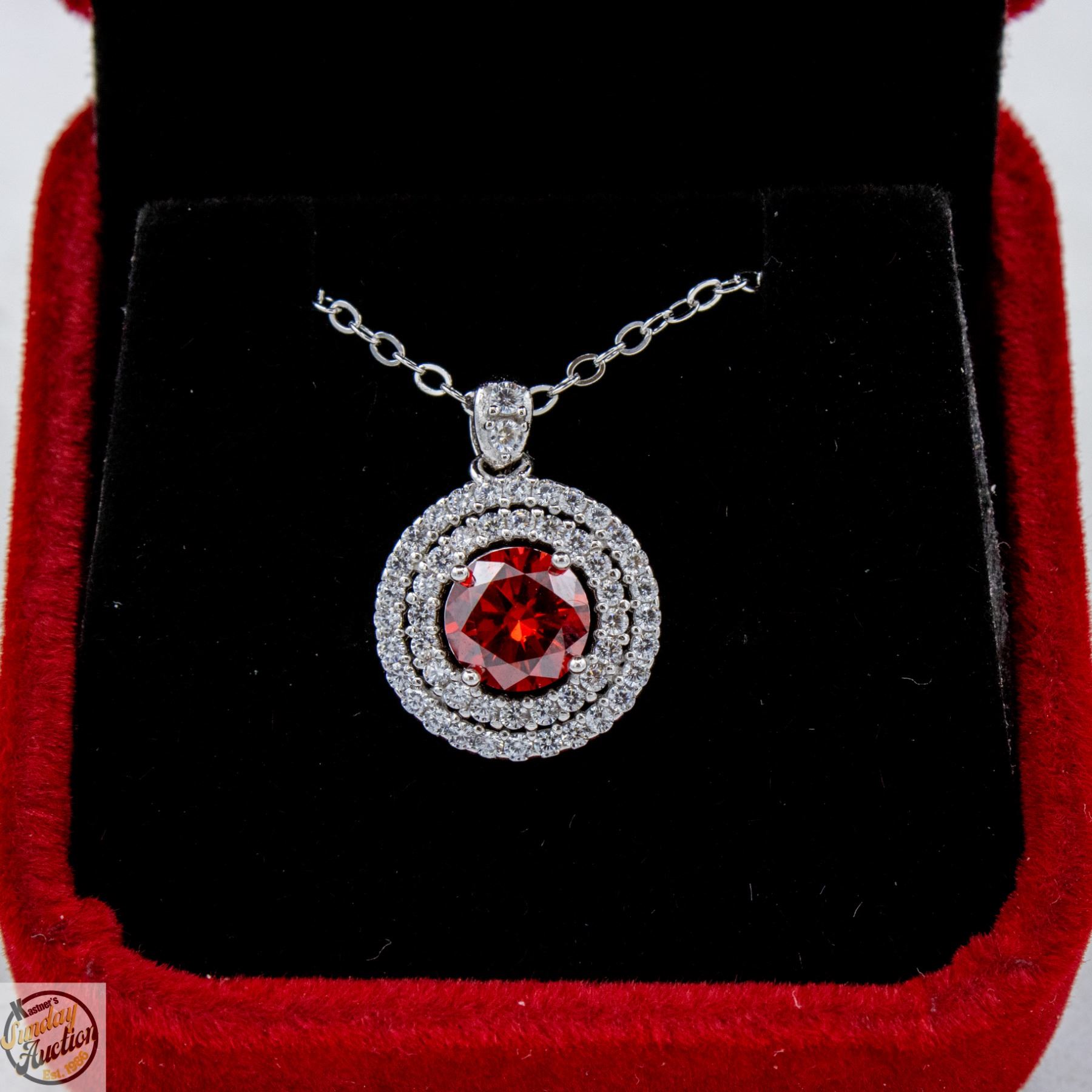 BRILLIANT CUT MOISSANITE STONE VVS INTENSE RED COLOR WITH 50 ROUND BRILLIANT CUT CUBIC ZIRCONIA SET IN DUAL HALOS SET IN 925 SILVER PENDANT RETAIL VALUE $875.00 **ALL ITEMS MUST BE REMOVED BY 5PM SATURDAY, MAY 2ND 2026. ALL REMAINING ITEMS WILL BE SUBJECT TO A $6.00 PER DAY STORAGE CHARGE. ANY ITEMS REMAINING AFTER MONDAY, MAY 18TH 2026 WILL BE CONSIDERED FORFEITED. NO REFUNDS WILL BE ISSUED FOR FORFEITED ITEMS. TO SCHEDULE A PICK UP APPOINTMENT CLICK HERE