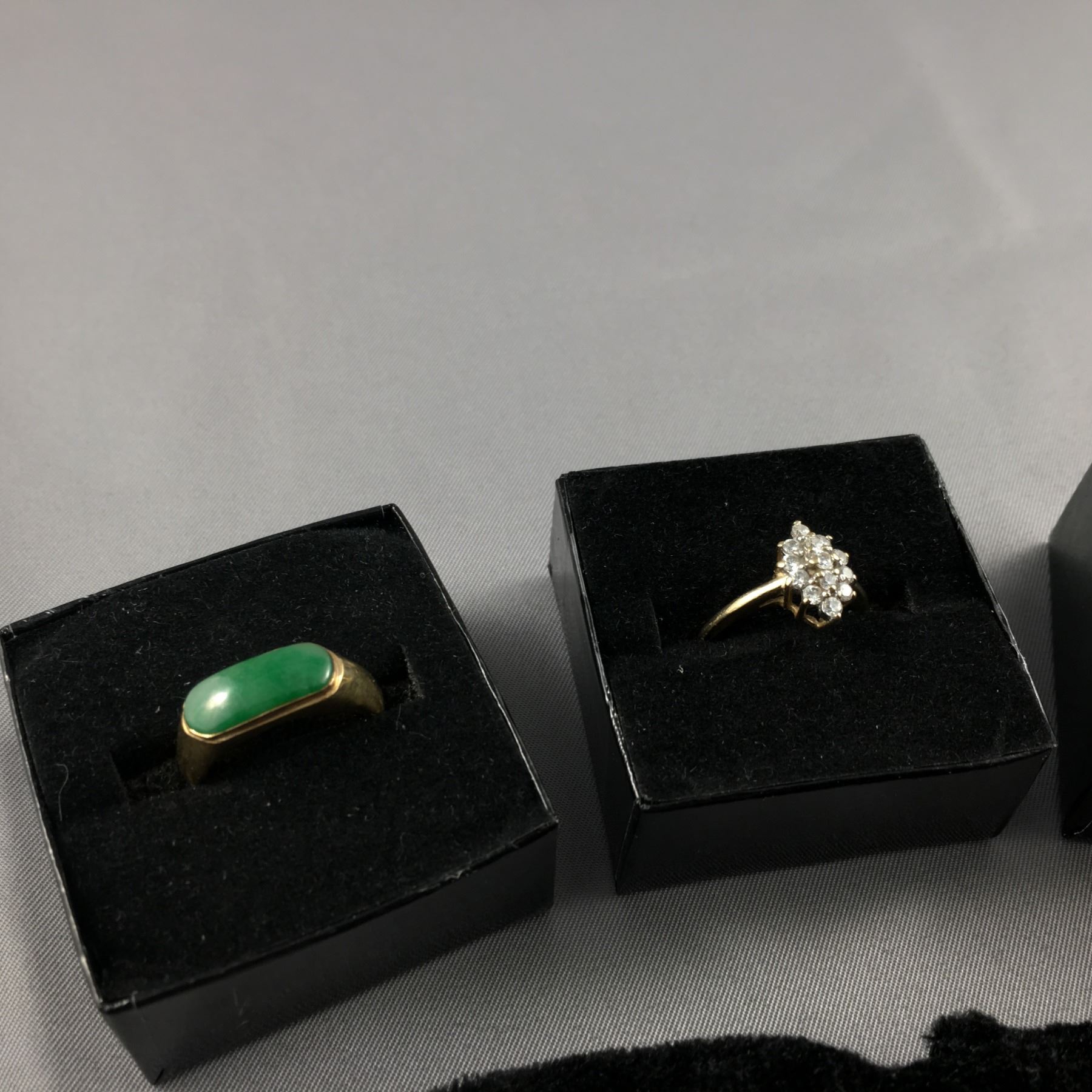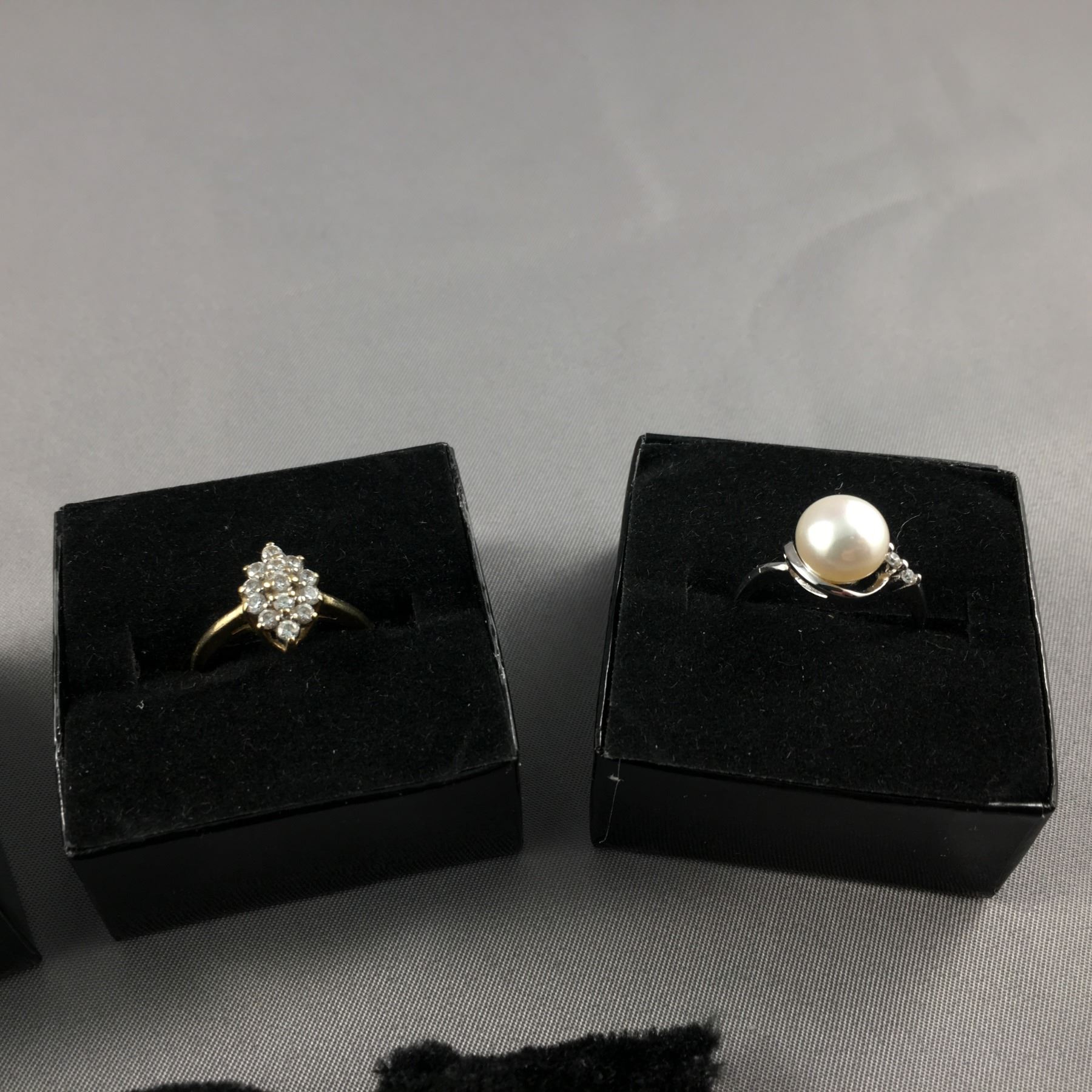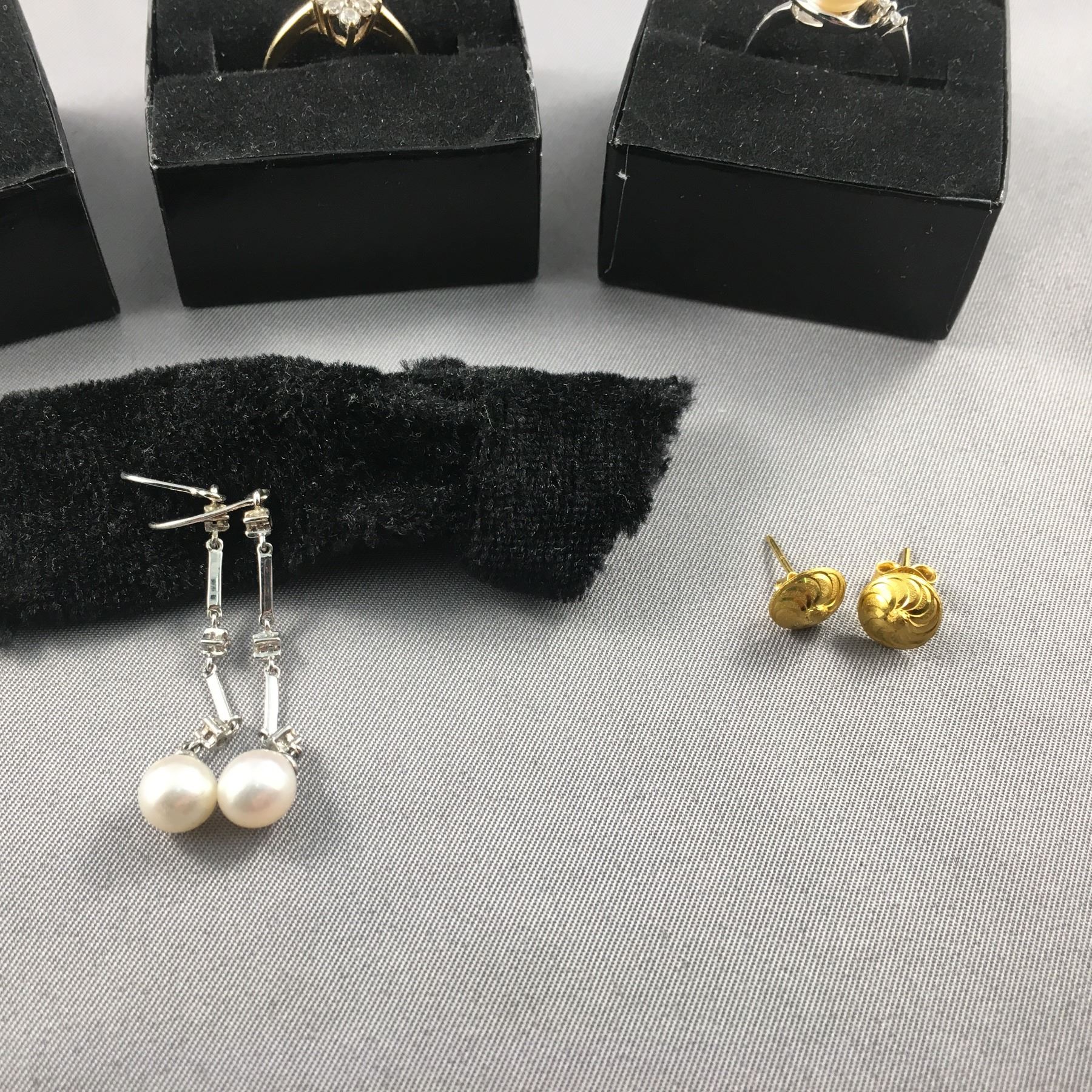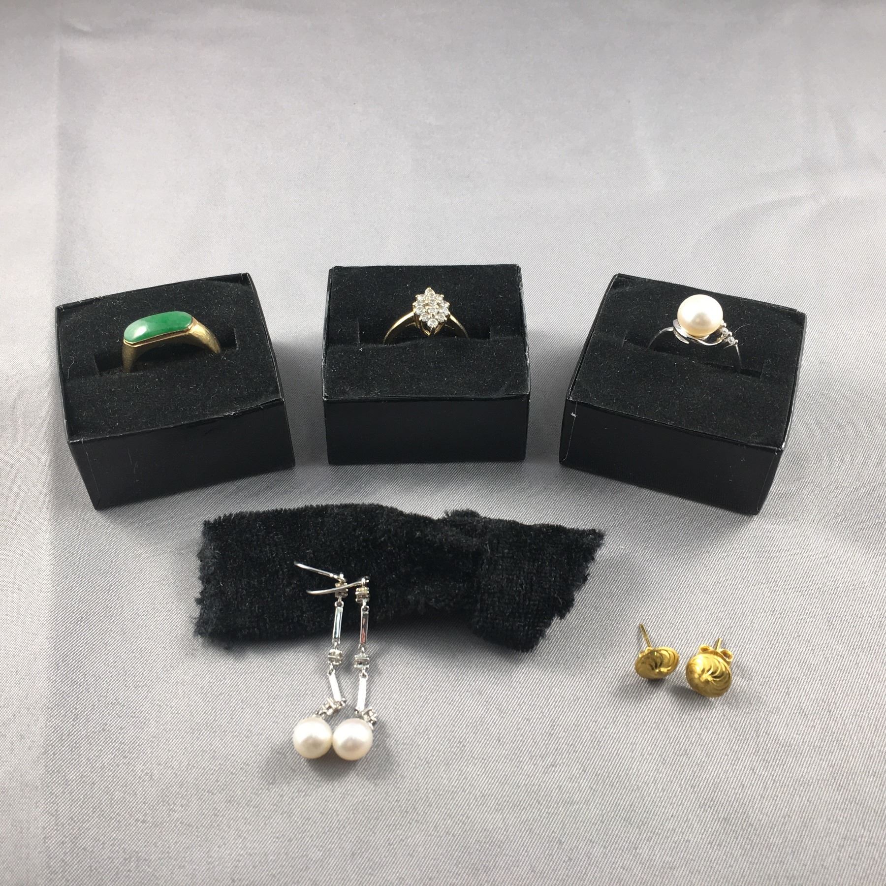 5 PIECES TTL. 1 - LADIES 10KT YELLOW GOLD COLOURLESS CUBIC ZIRCONIA DRESS RING, 1.70GRAMS. 1 - PAIR OF 22KT YELLOW GOLD ROUND SHAPED EARRINGS, WEIGH 1.60 GRAMS, NO REPL VALUE. 1 - PAIR OF 14KT WHITE GOLD ROUND WHITE CULTURED PEARL & DIAMOND SET DANGLING EARRINGS, 6 BRILLIANT CUT DIAMONDS, TTL WEIGHT APPROX 0.12CARAT , GRADED MOUNTED CLARITY SI 2, COLOUR K-L, CUT GOOD, REPL VALUE $475.00. 1 - LADIES STERLING SILVER ROUND WHITE CULTURED PEARL & COLOURLESS CUBIC ZIRCONIA DRESS R