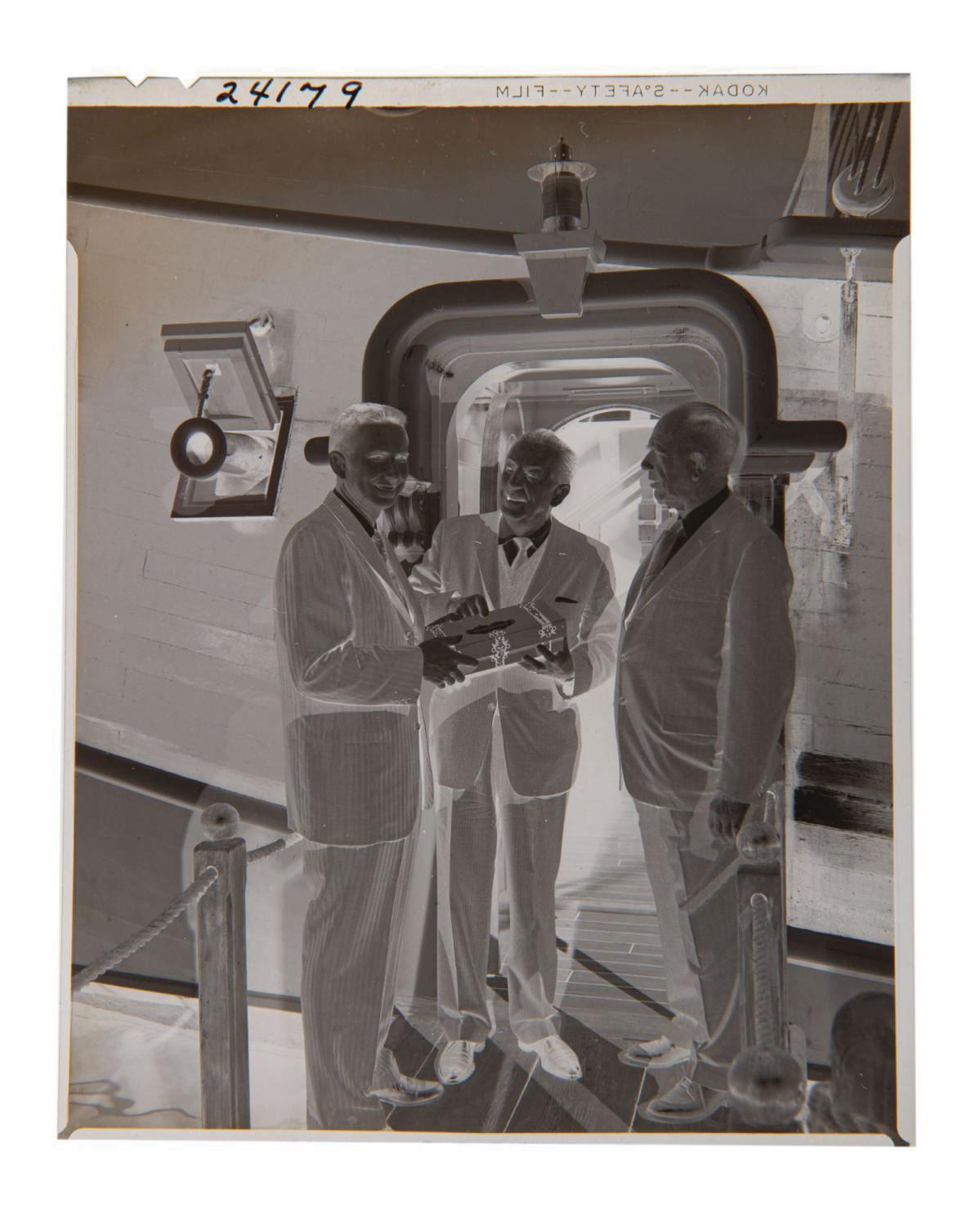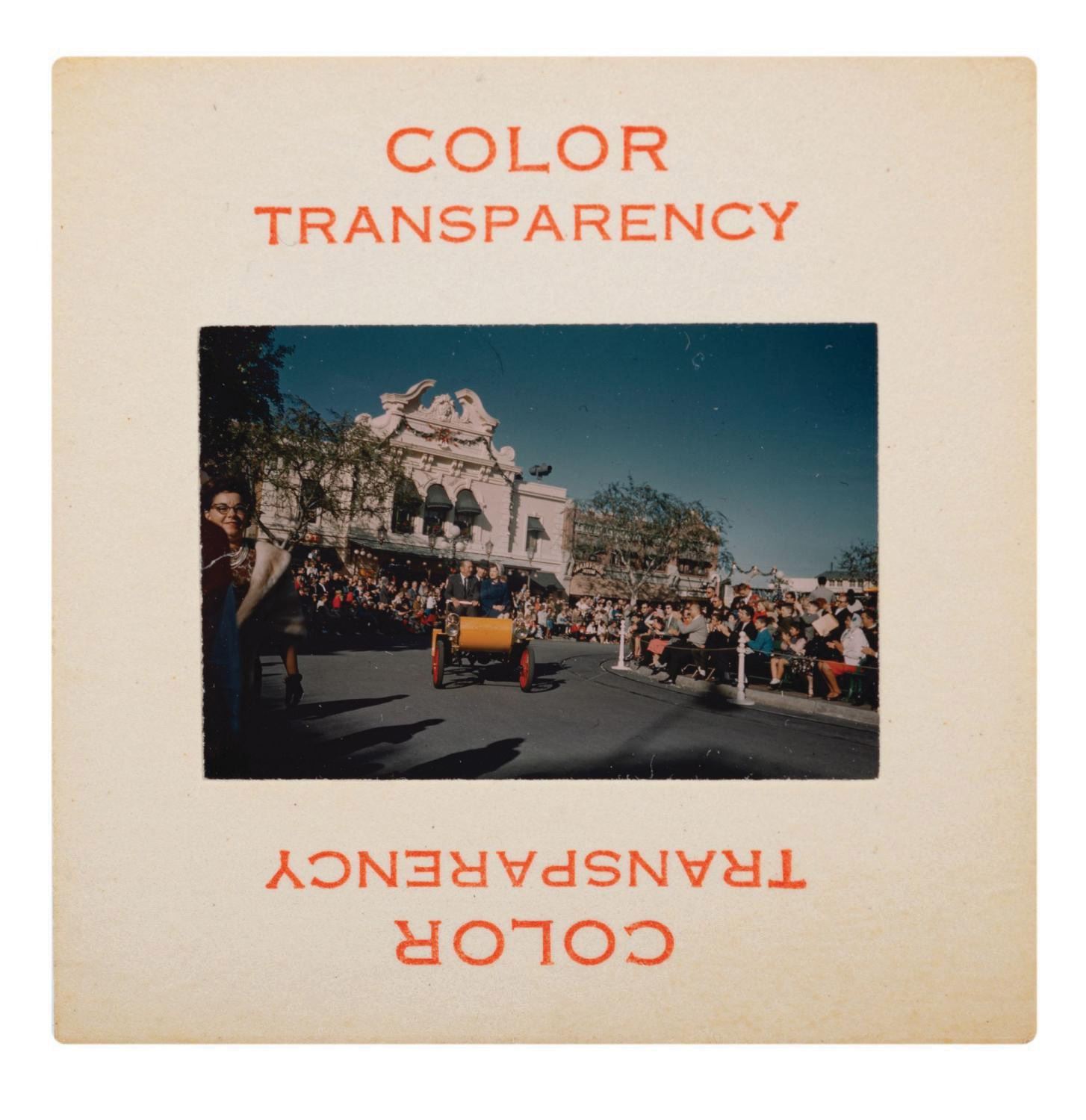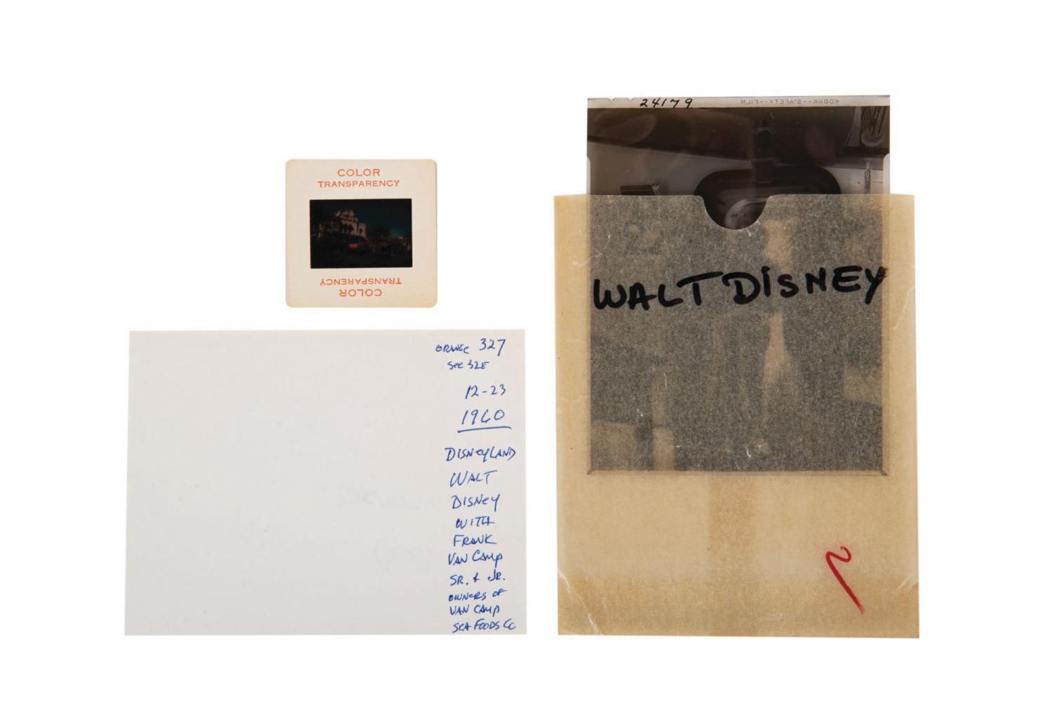 (Disneyland, 1960/63) A pair of vintage 1960s transparency images of Walt Disney at Disneyland. The 35mm color transparency film slide features the Grand Marshall Walt Disney aboard the Disneyland Horseless Carriage with actors Shirley Temple Black and Fred MacMurray during the 1963 edition of the Annual Parade of Toys. The black and white Kodak Safety Film Negative features Walt Disney, and both Gilbert Van Camp Sr. and Jr. standing on the gangplank leading to the Chicken of the Sea Pirate Ship Restaurant, for a special event held December 23, 1960. The 2"x2" slide mount and 5"x4" Film Negative are in very good condition with little wear.