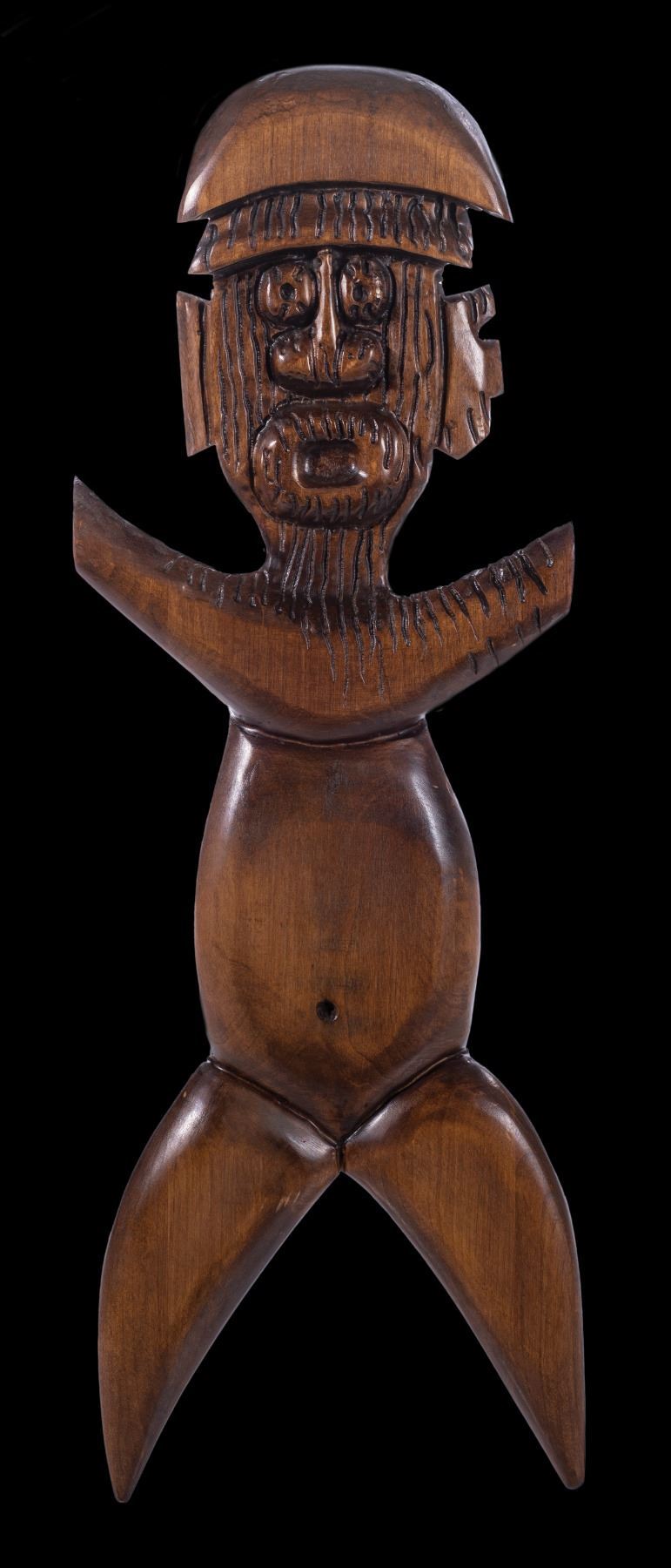 (2000s) A modern carving of a perennial OA catalog tiki. Based on a New Guinea museum specimen encountered by the boys on their Big Trip, this wall figure is an Oceanic Arts classic, gracing the walls of some of the biggest destinations of Tiki's golden era. 36"x12". VG+ with typical wear.