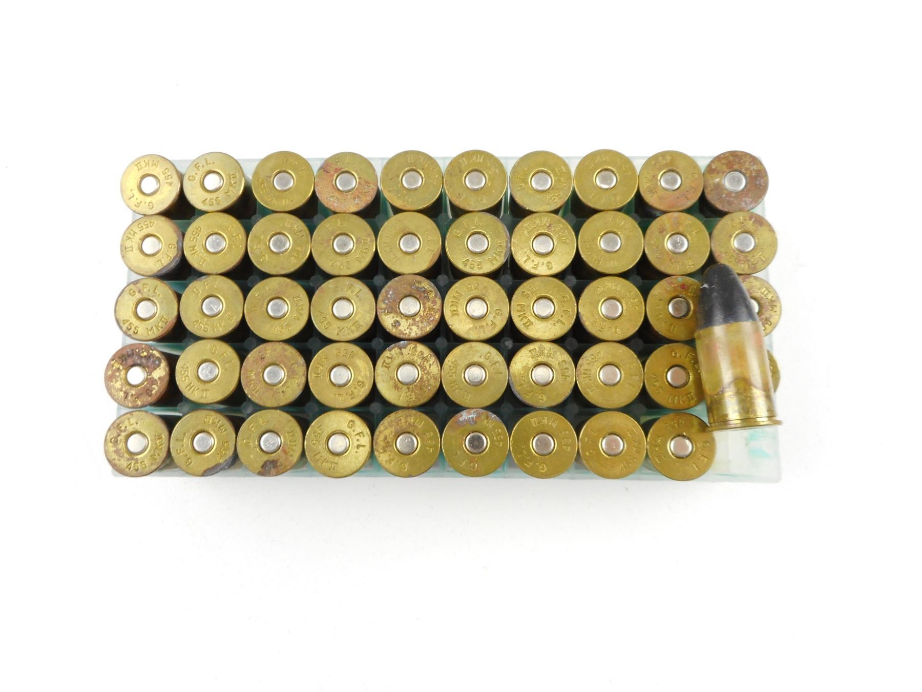 .455 MK II AMMO , 50 RNDS .455 MK II, HEAD STAMPED G.F.L. 455 MK II.