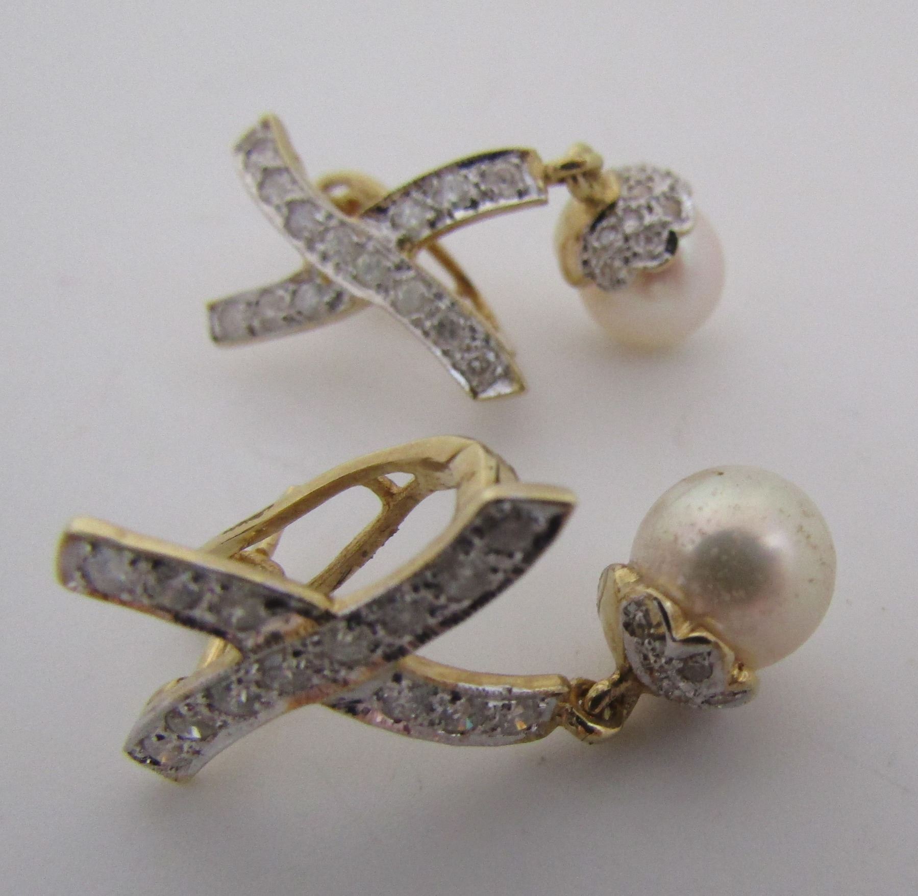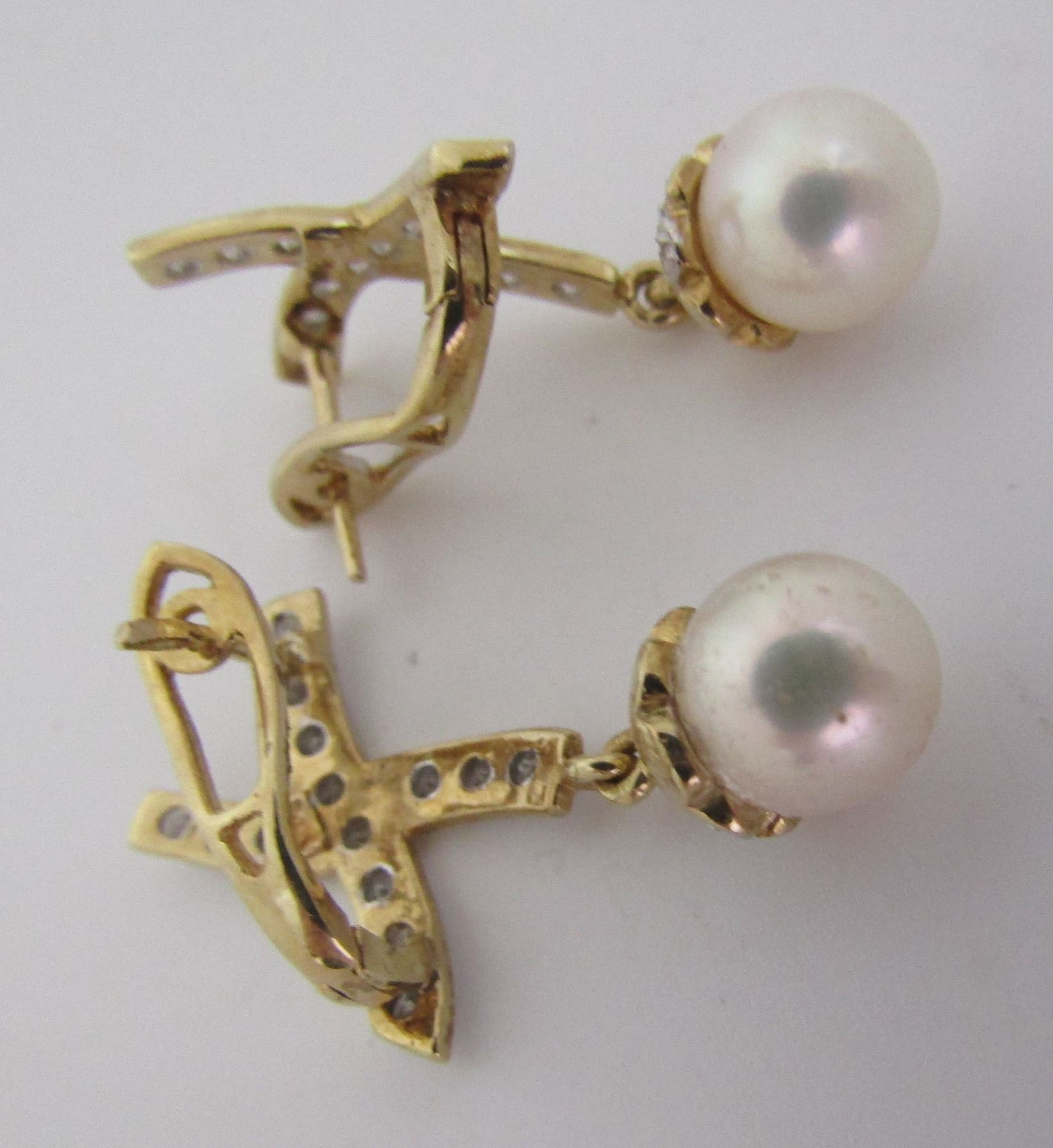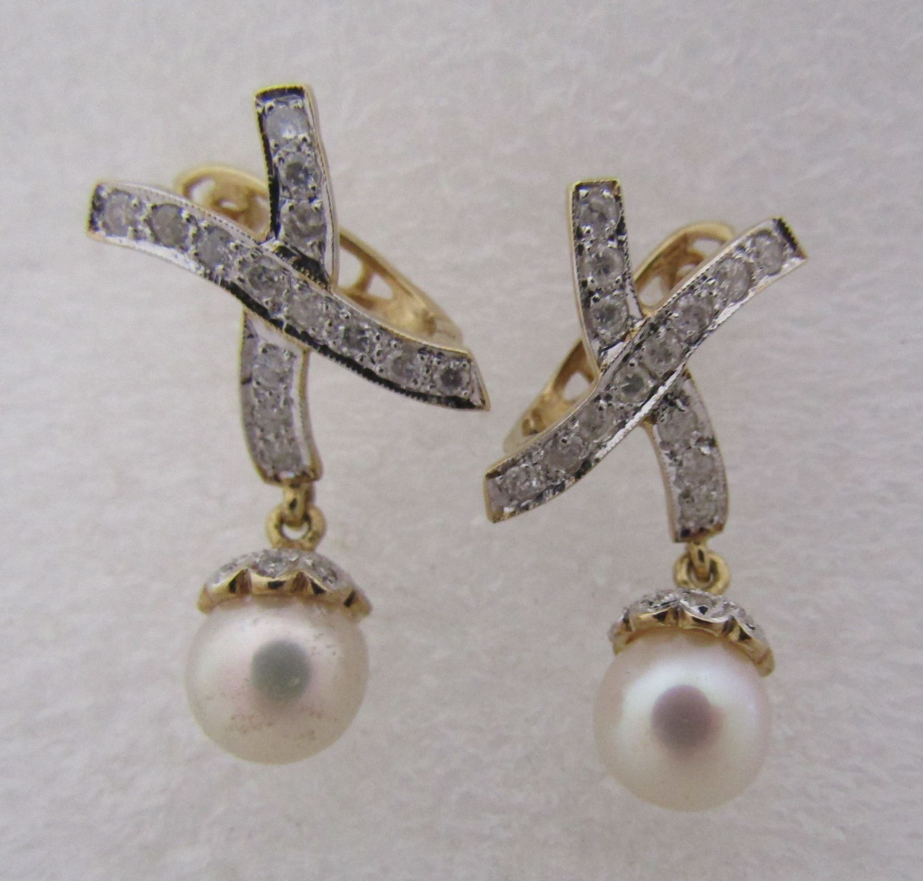 FAB GENUINE 46 FULL CUT DIAMONDS WITH 7.5MM PEARLS. 27MM LONG X 12MM WIDE. WEIGH 5.1 GRAMS OF 14K WHITE AND YELLOW GOLD. POST FOR PIERCED AND CLIP FOR ADDED SAFETY. USA SHIPPING $8.