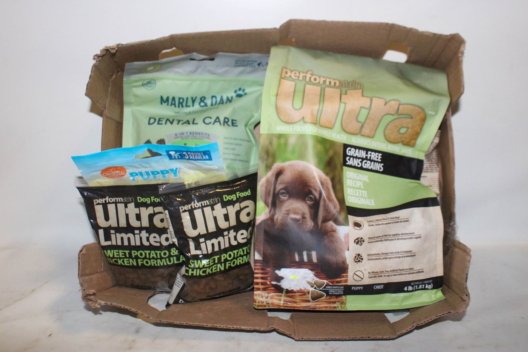 ORIGINAL (JAN 08/26) + 2X113G PUPPY TO ADULT DOG FOOD SWEET POTATO CHICKEN (JAN 31/26) + 150G (3 COUNT) CANINE NATURALS IRRESISTIBONES CHEWS (NOV 30/25) + 200G MARLY & DAN DENTAL STICKS SALMON(JAN 2026)