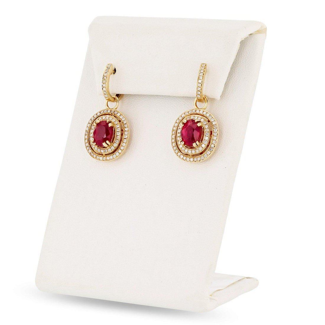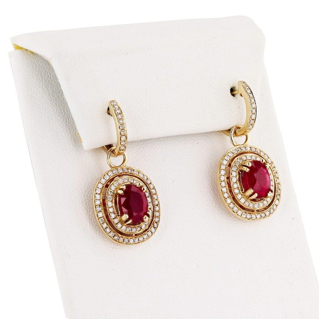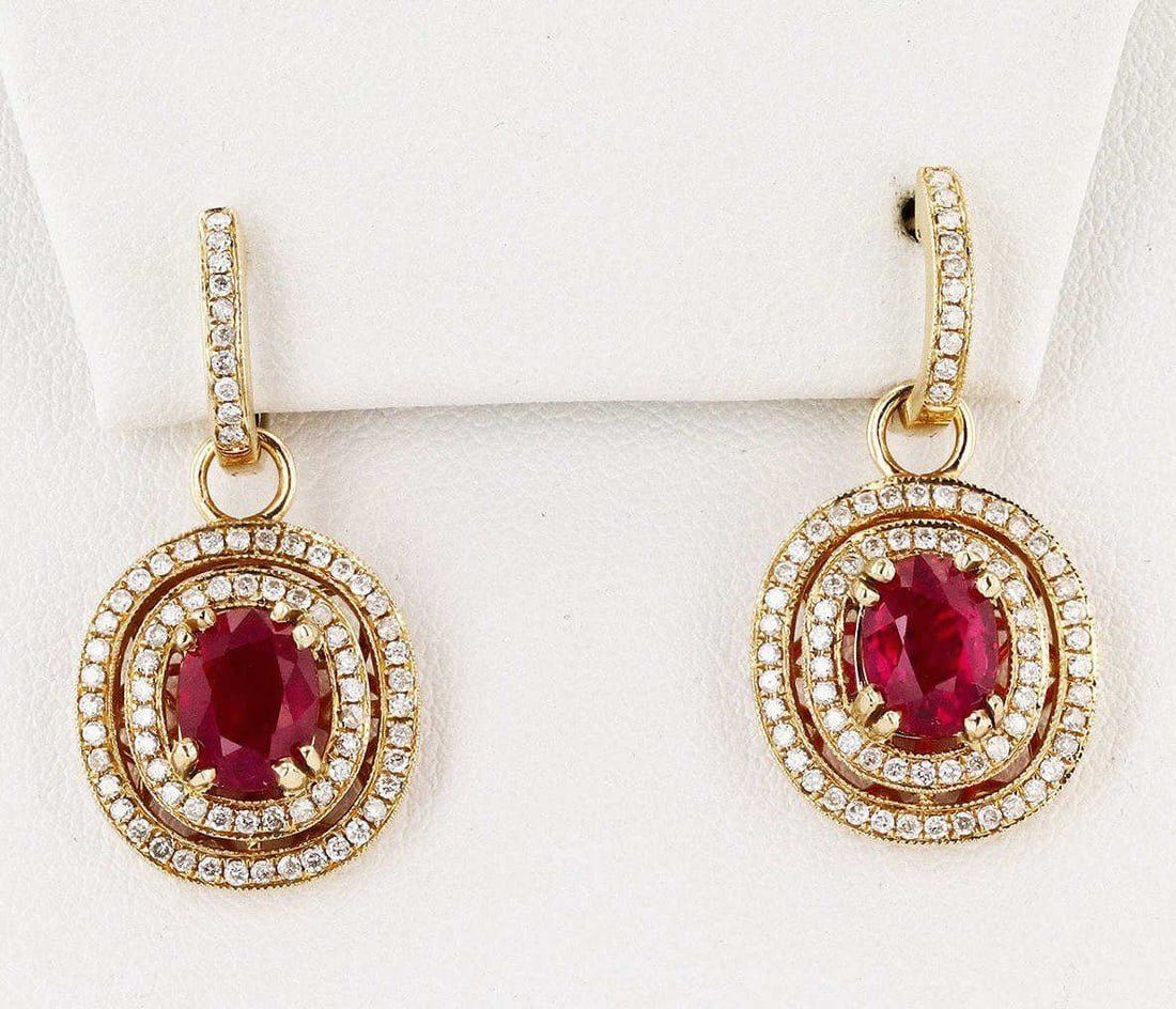 One pair electronically tested 14KT yellow gold ladies cast and assembled ruby and diamond dangle earrings with hinged, snap locking posts. Condition is new, good workmanship. Bright polish finish withmilgrain detailing. Trademark is Orianne. Identified with markings of "14K". Containing: Two prong set oval mixed cut natural rubies, measuring 8.00mm x 6.00mm x 5.20mm, 25% bulge factor, approximate totalweight of 5.13ct., clarity is moderately included, type II, medium dark, very slightly brownish, red color, (GIA R 6/3), cut is good. Transmitting light somewhat diffusely, transparent to translucent. Naturallyoccurring internal and external characteristics are present. Indications of laboratory high temperature heat treatment, with glass and flux additives. Measurements and the color grade are an average for thepair. Graded in the setting. Ruby has a low tolerance to rhodium plating, repolishing the surface, and ultrasonic cleaning. One hundred forty-eight prong set round brilliant cut diamonds, measuring 1.20mm to 1.10mm x