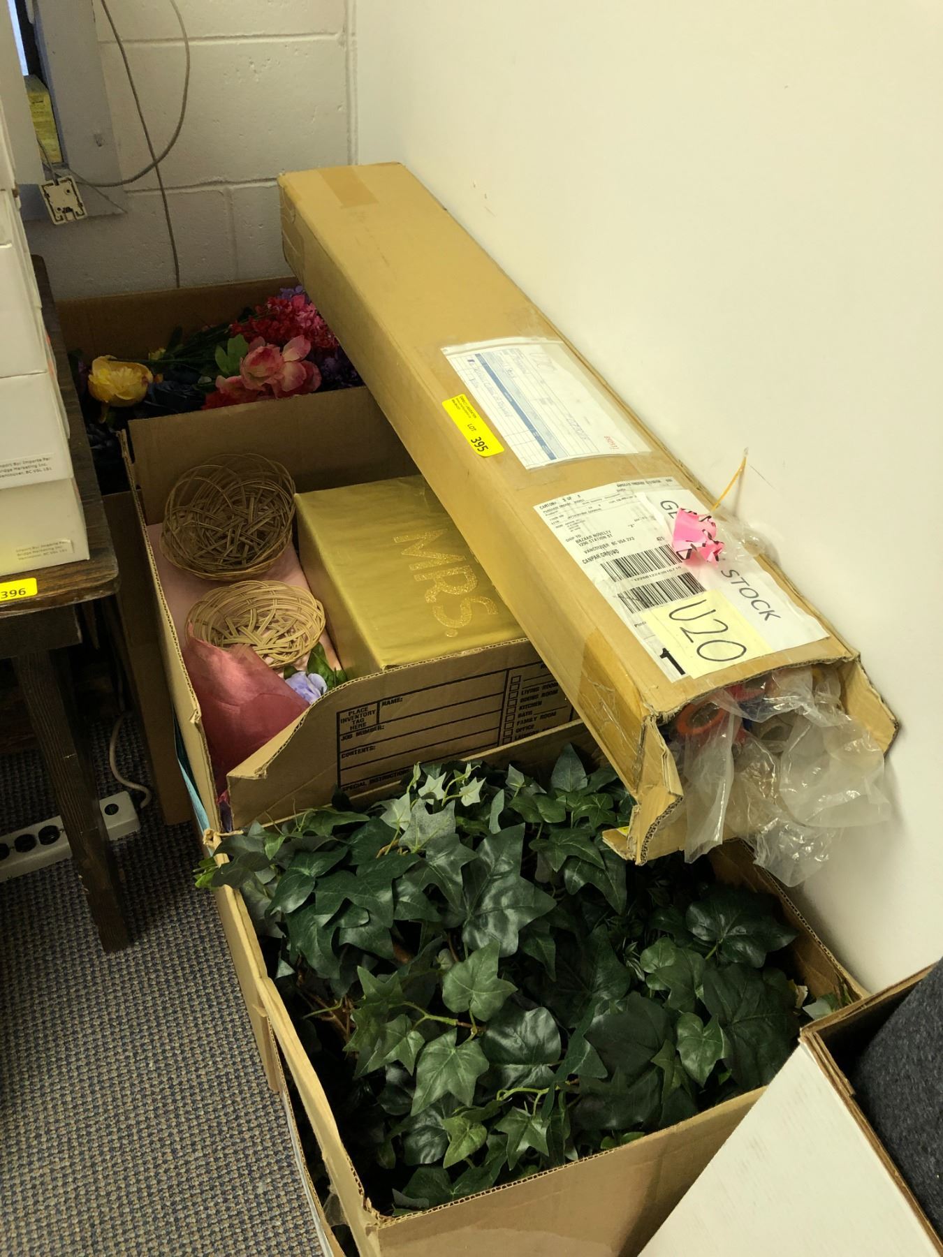 5 Boxes of Misc. Set Décor - including rolls of polywrap, artificial plants and flowers.