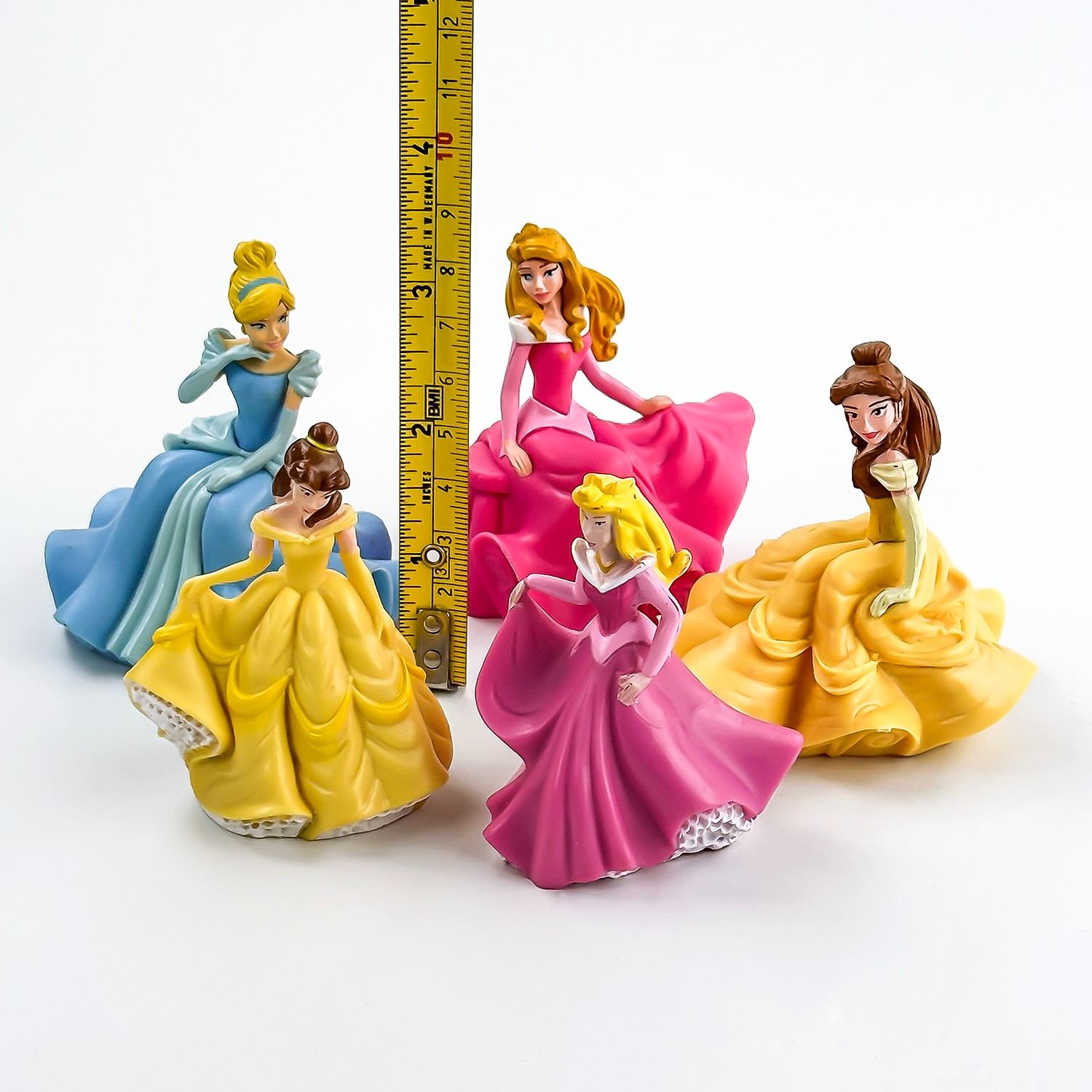 #9406 - 5 DISNEY PRINCES CAKE TOPPERS - PRINCESS CINDERELLA, PRINCESS BELLE X2, PRINCESS AURORA X2. THERE ARE 2 DIFFERENT PRINCESS BELLE’S AND 2 DIFFERENT AURORA’S. CARTOON ANIMATION PRINCESS FIGURINE CHARACTER TOYS. THEY MEASURE ROUGHLY 3” (7.5 CM) TALL