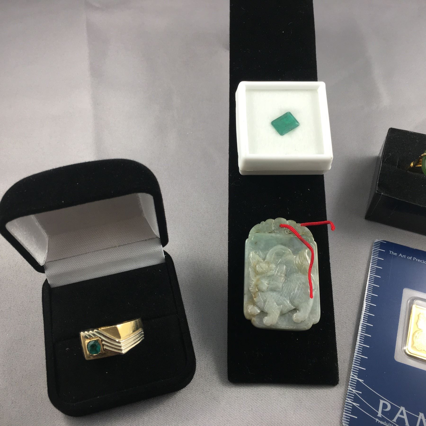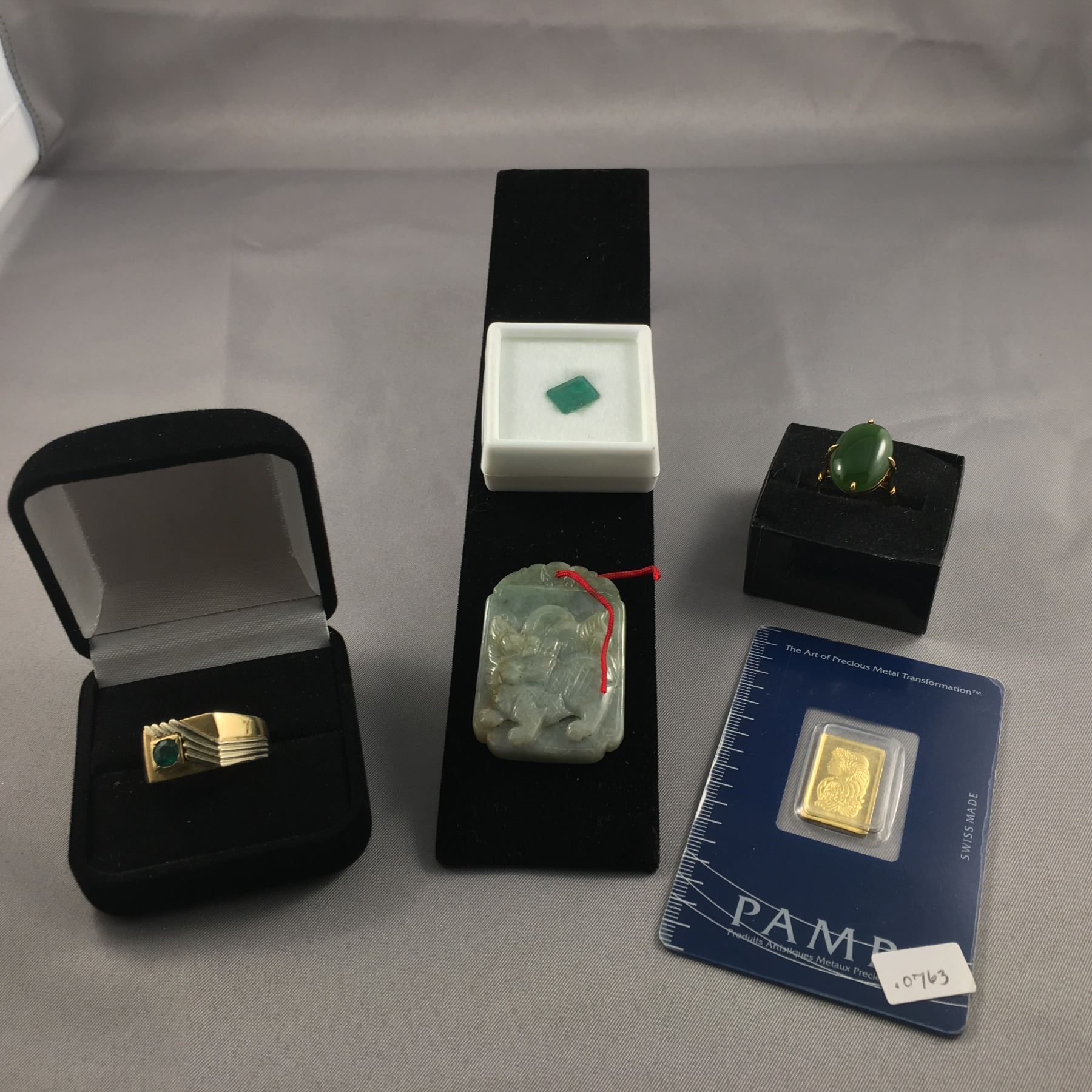 5 ITEMS TTL. 1-ONE 10KT YELLOW GOLD GENTS NATURAL EMERALD DRESS RING, CONTEMPORARY SOLITAIRE DESIGN, 10.19 MM. WIDE, RECTANGULAR SHAPED OUTLINE, WITH WHITE GOLD DIAGONAL LINES, FLUSH BEZEL-BEAD SET WITH: ONE (1) ROUND MIXED CUT NATURAL EMERALD, DIAMETER 5.20 MM, COLOUR: MEDIUM DARK GREEN, CLARITY: BROKEN AT THE CROWN, ROUND SHAPED SHANK, WEIGHS 7.10 GRAMS, MARKED 10K, REPLACEMENT VALUE: $675 ONE-1 STEP CUT NATURAL EMERALD, WEIGHT 2.64 CARAT, 8.18 X 10.40 MM, COLOUR: DARKER GREEN, CLARITY: EYE VISIBLY INCLUDED, NATURAL SURFACE BLEMISHES,