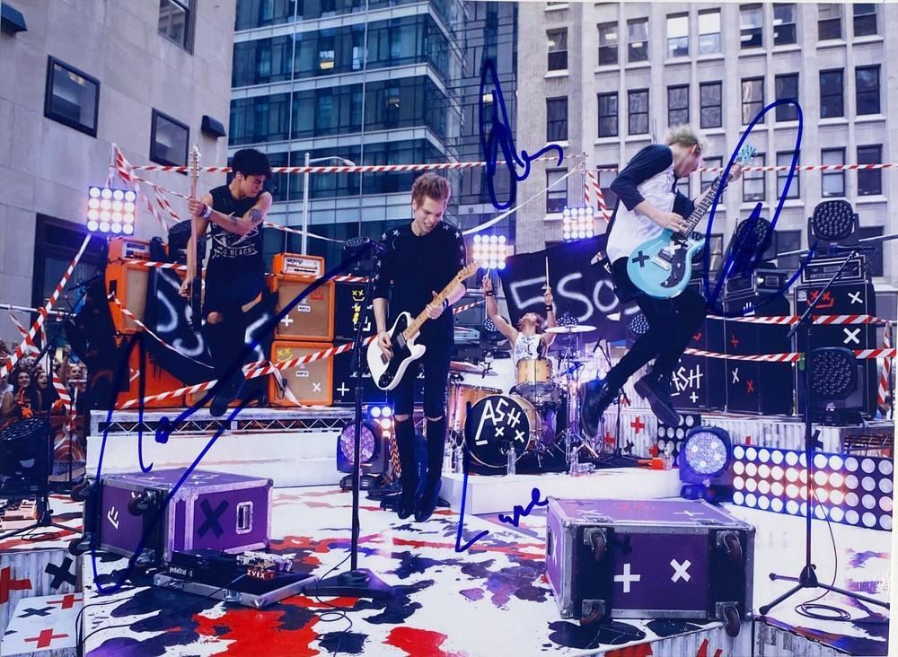5 Seconds of Summer facsimile signed photo autographed by Calum Hood, Michael Clifford, Luke Hemmings, and Ashton Irwin. 8x10 inches. This item is a reprint of an original autograph