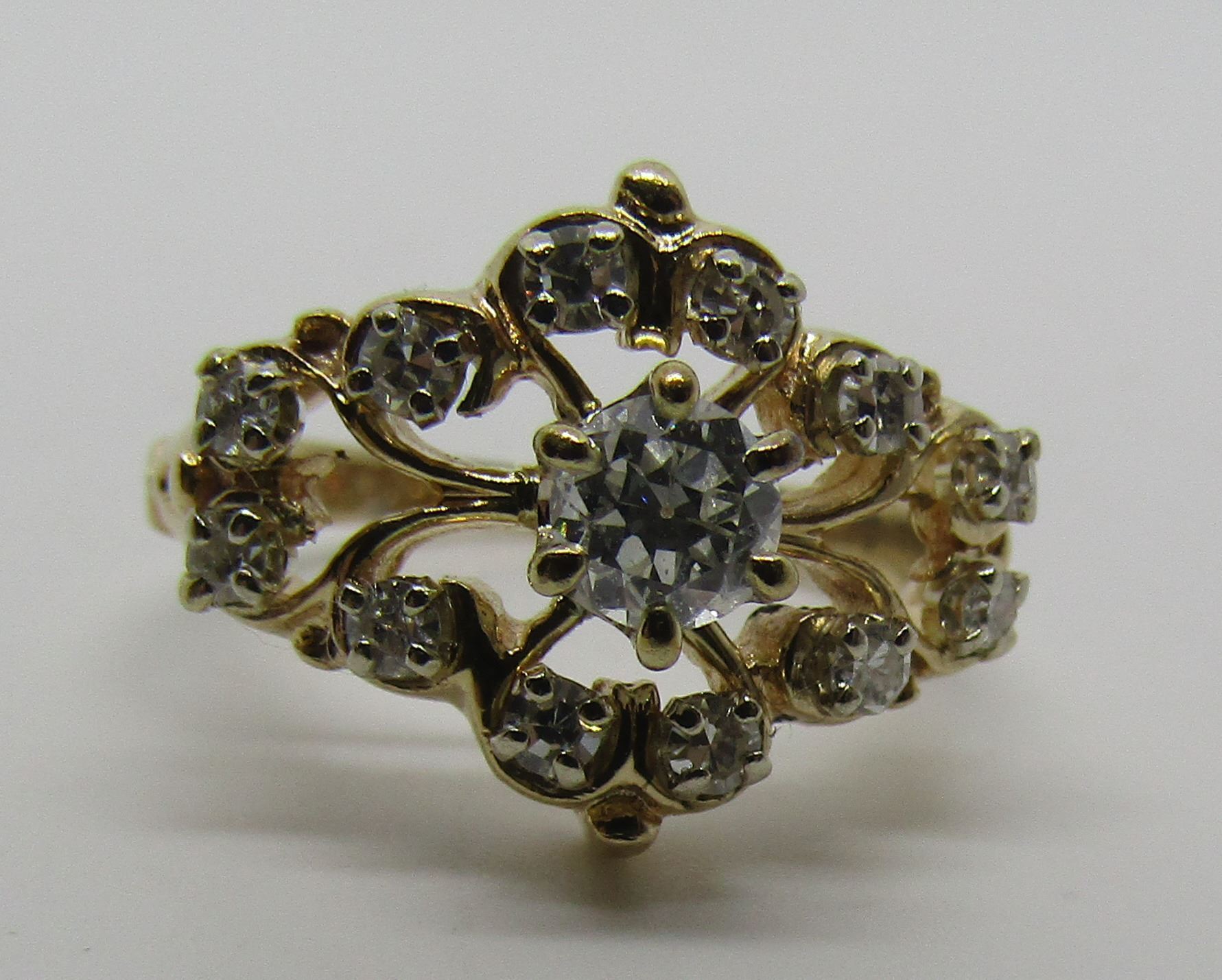 25CT CENTER GENUINE SI CLARITY DIAMOND I COLOR WITH 12 ACCENT DIAMONDS IN RING. MARKED "ALB 14K" YELLOW GOLD, WEIGHS 3.3 GRAMS. 13 MM WIDE. SIZE 5 1/4. EXCELLENT CONDITION VINTAGE ESTATE. USA SHIPPING $8
