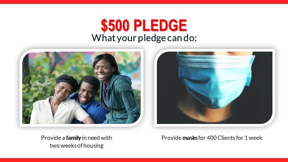 Your $500 pledge can help provide a family in need with two weeks of housing.
