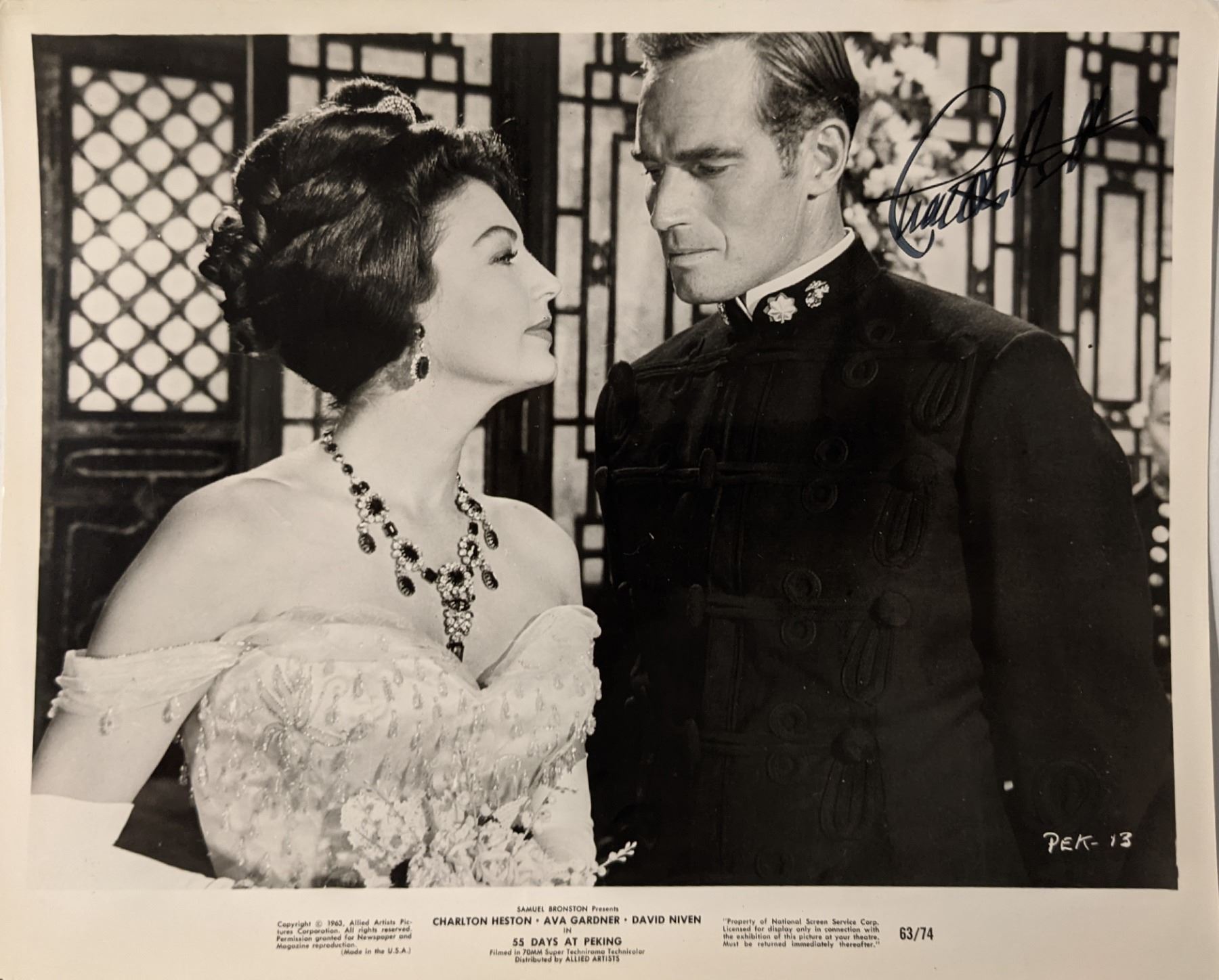 55 Days at Peking signed movie photo autographed by Charlton Heston. 8x10 inches
