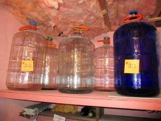 7 - 23L GLASS WINE CARBOYS (6 CLEAR & 1 BLUE), 2 FERMENTING PAILS