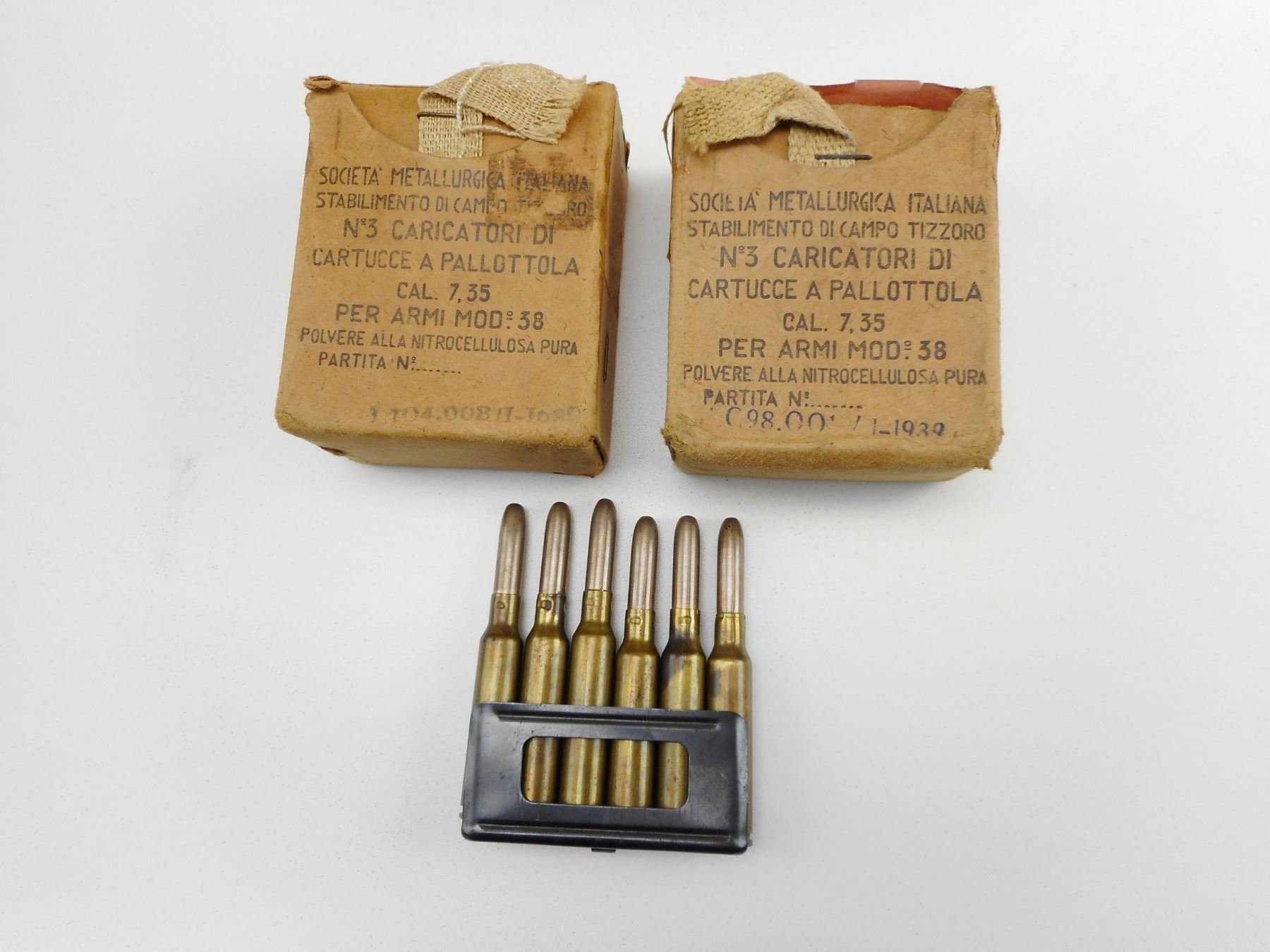 7.35 CAL AMMO IN STRIPPER CLIPS , 42 RNDS 7.35 CAL AMMO IN STRIPPER CLIPS, BOXES STAMPED SOCIETA METALLURGICA ITALIANA NO. 3 CARICATORI DI CARTUCCE A PALLOTTOLA CAL. 7.35