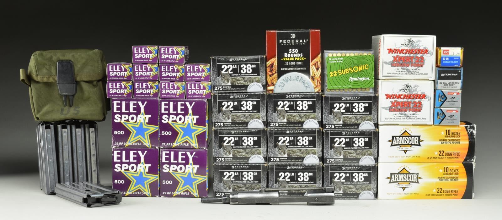 1) AMMO. 2,000 RDS (3 BRICKS & 10 BOXES) of Eley Sport 40 gr. / 4300 RDS. (13 BOXES) of 38 gr. Hollow Point by various makers. / 100 RDS. (2 BOXES) of Aguila 60 gr. Subsonic. / 100 RDS. (1 BOX) of Remington Hollow Point. / 100 RDS. (1 BOX) of CCI Standard Velocity. / 50 RDS. (1 BOX) of Federal Bird Shot 25 gr. No. 12 lead shot. / Ammo includes 2 ammo cans. CONDITION: ammo appears serviceable. Boxes in very good condition.