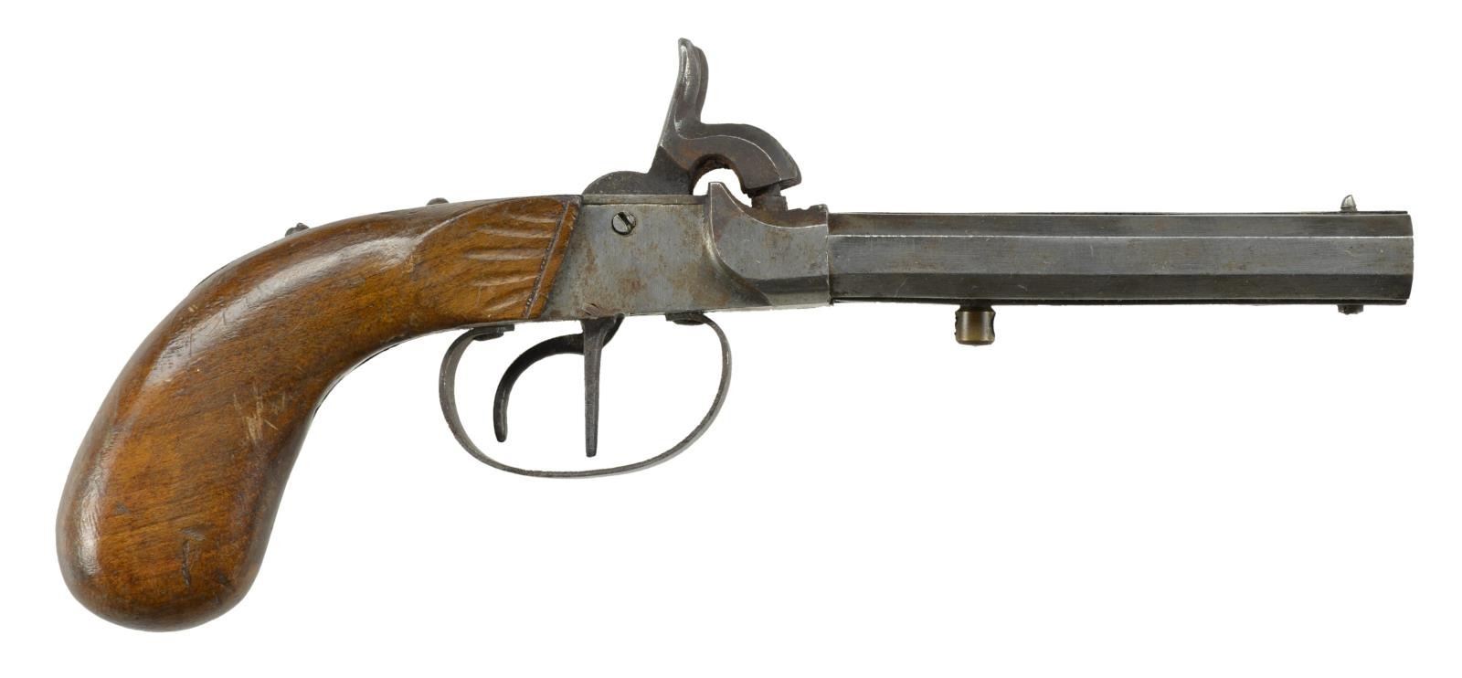 8) PERCUSSION. Cal. 45. NSN. Bbl. 12". Wedge faste3ned wood stock w/ ramrod. CONDITION: poor. Pitted bore. PROVENANCE: Estate Collection of Jack Verret Sr. (01-20714 (8) /MD). ALL ANTIQUE. $300-400.