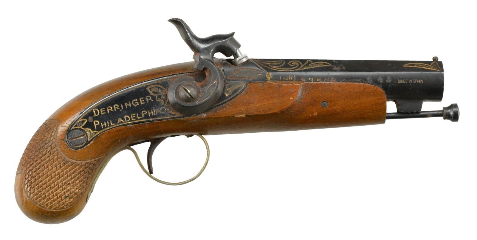 4) SPANISH PHILADELPHIA DERRINGER. Cal. 40. S# 543. Bbl. 3" w/ front bead. Bbl. is marked w/ Spanish proofs, "1855-SPAIN" & ' "HV HUNTED" ' on flats. Pistol has gold filler in engraving. Lock is marked " DERRINGER / PHILADELPHIA" Checkered hardwood stock w/ ramrod. CONDITION: good overall w/ oxidation & wear. Good smooth bore.