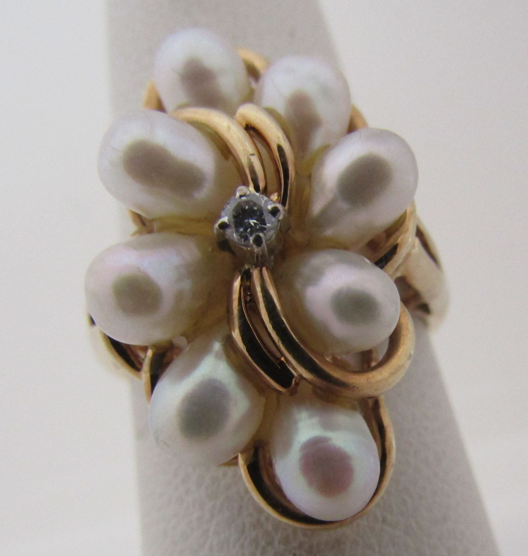 ALL GENUINE 8 PEARLS 5MM AND 1 FULL CUT DIAMOND. TOP MEASURES 23.7MM X 14.6MM. WEIGHS 6 GRAMS. SIZE 6 1/2. USA SHIPPING $8