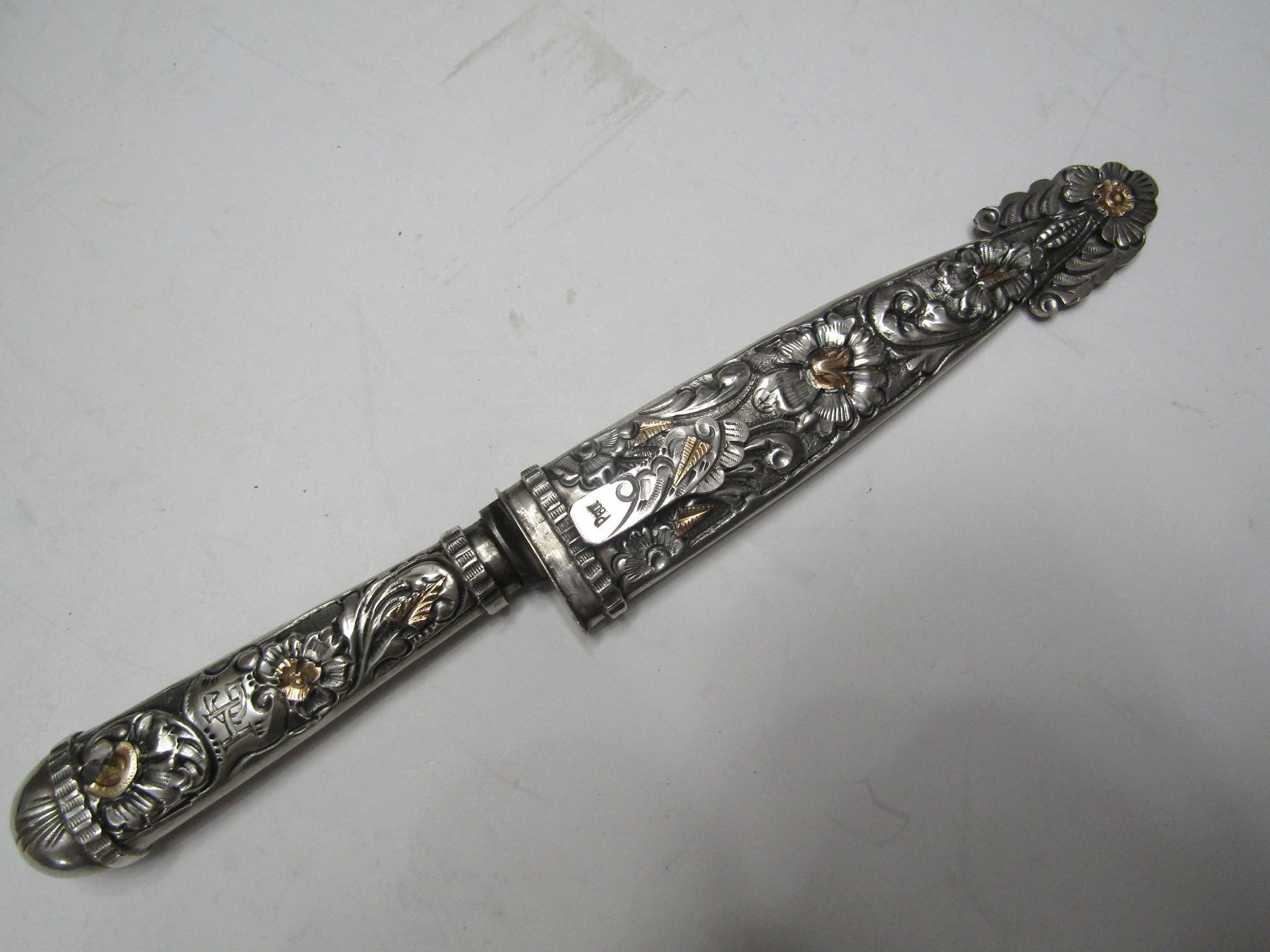 9 INCH LONG WITH 5 INCH BLADE. HALLMARKED 800 SILVER WITH 18K GOLD . BLADE SIGNED DEFENSA WITH HALLMARK. USA SHIPPING $10.