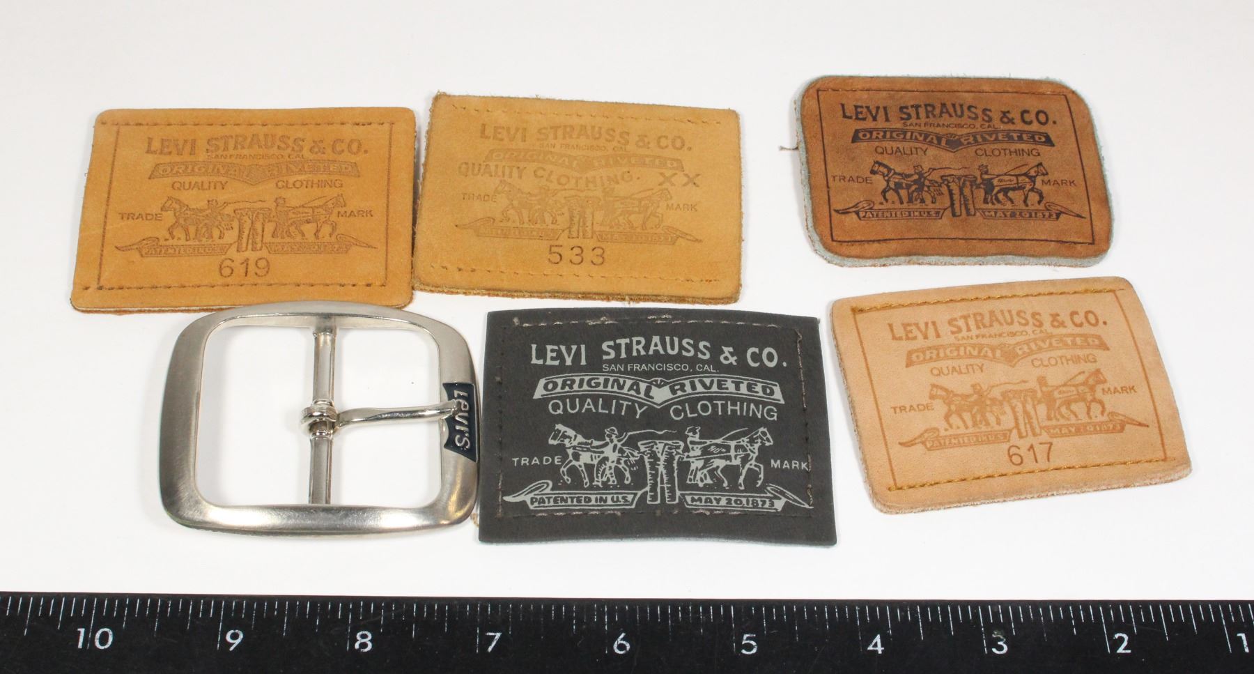 #833 LOT OF VINTAG JEAN LEATHER TAGS + BELT BUCKLE