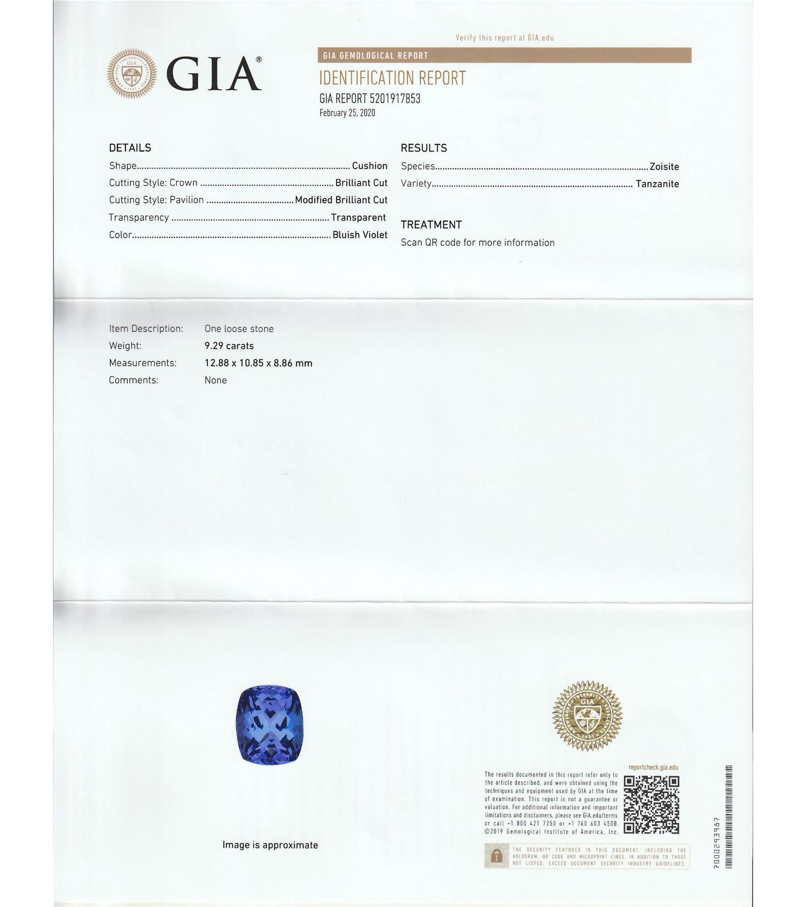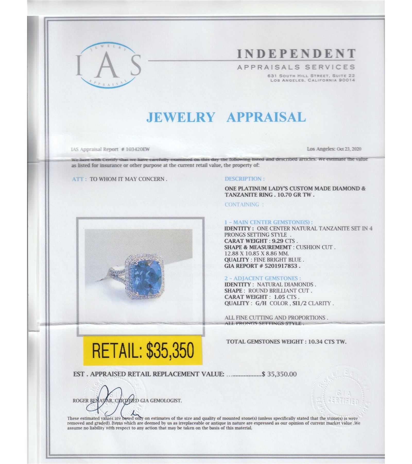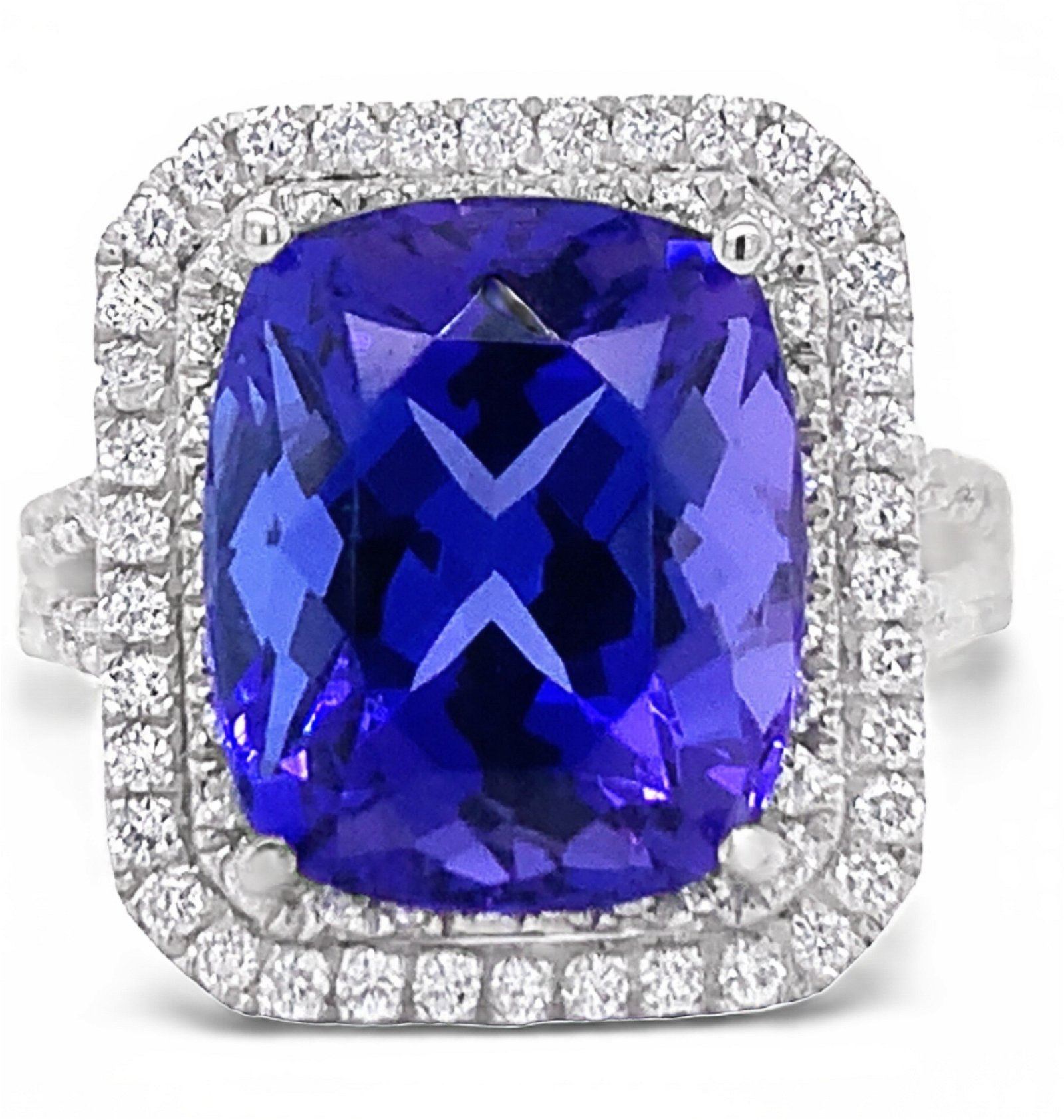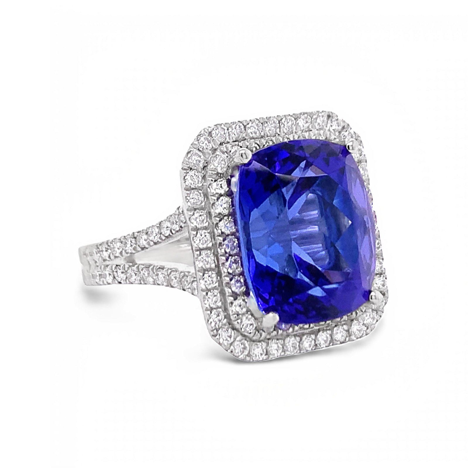 One platinum lady's custom made diamond and tanzanite ring . 10.70 gr tw #1 - main center gemstone(s):# identity: one center natural tanzanite set in 4 prongs setting style carat weight: 9.29 cts shape andmeasurememt: cushion cut, 12.88 x 10.85 x 8.86mm quality: fine bright blue gia report # 5201917853 #2 - adjacent gemstones# identity: natural diamonds shape: round brilliant cut carat weight: 1.05 cts quality: g/h color , si1/2 clarity all fine cutting and proportions total gemstones weight: 10.34 cts tw.