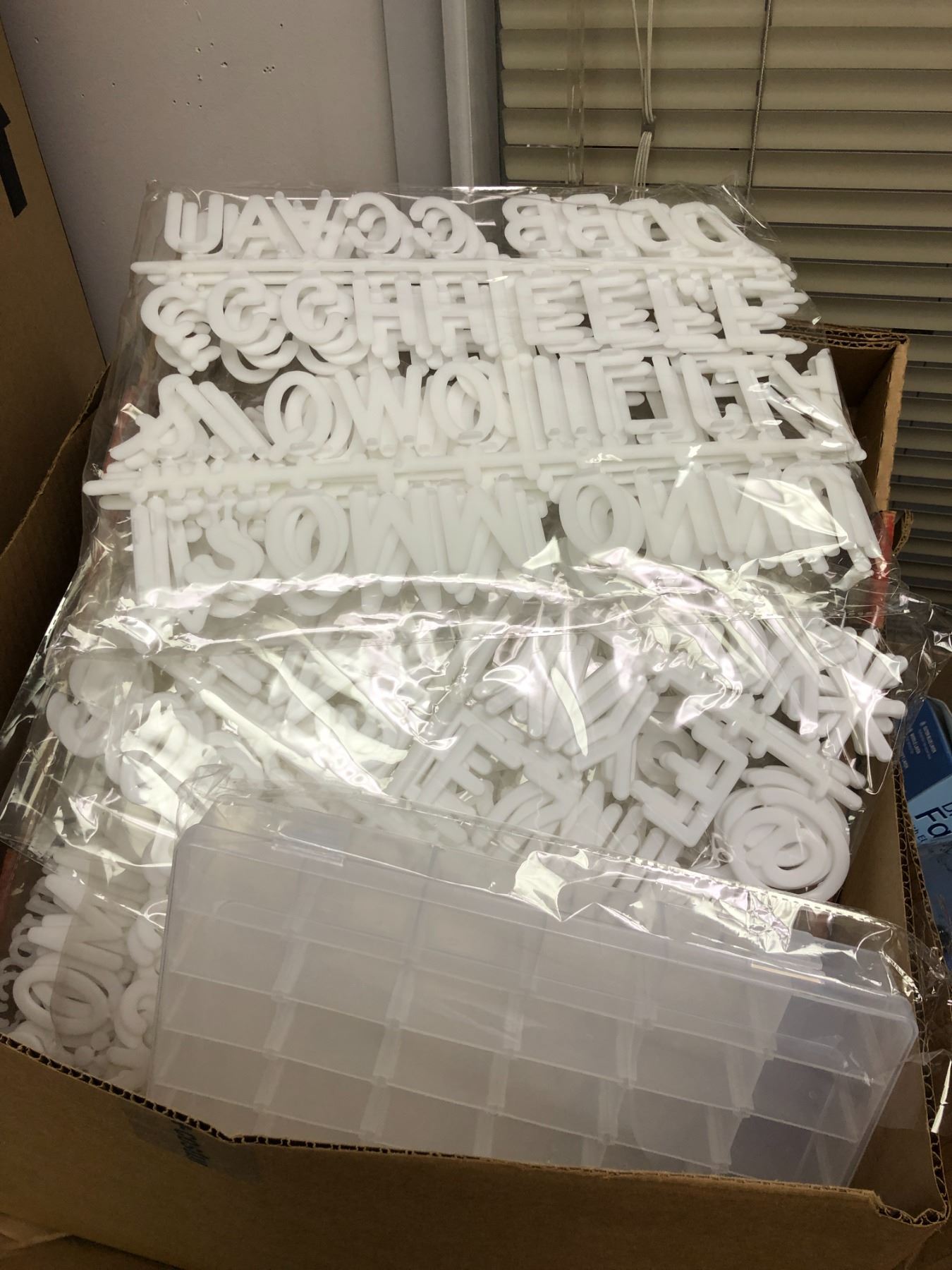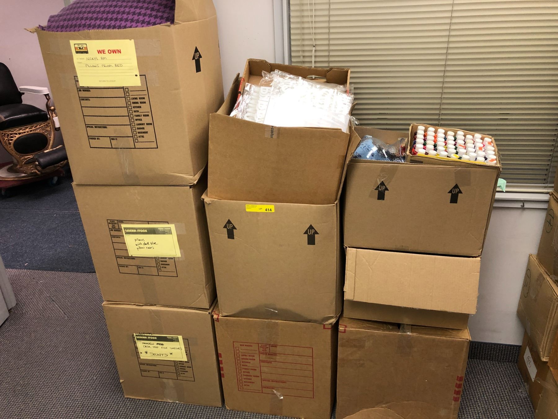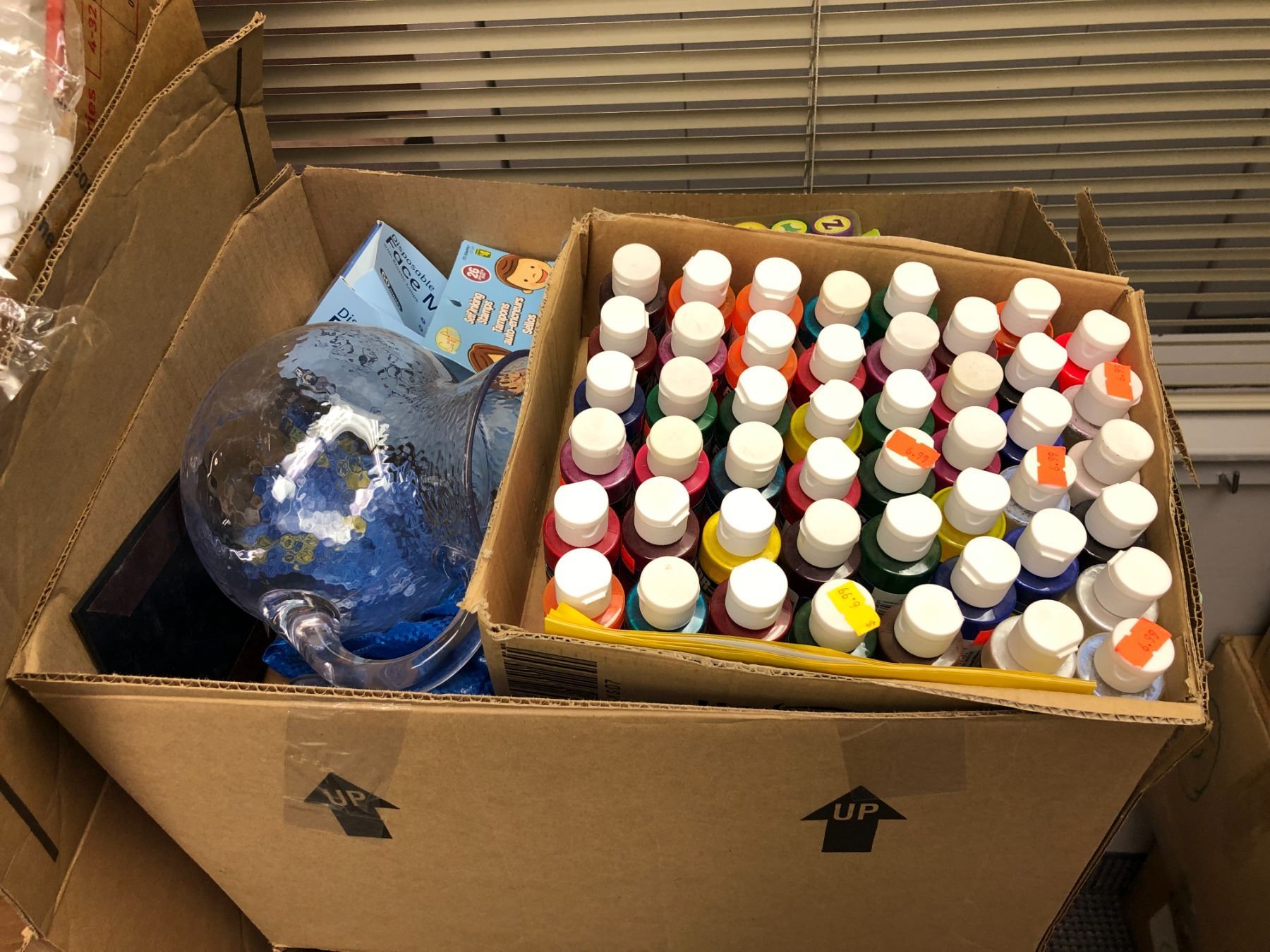 9 Boxes from Turner & Hooch with pillow/pillow cases, paint, and plastic lettering